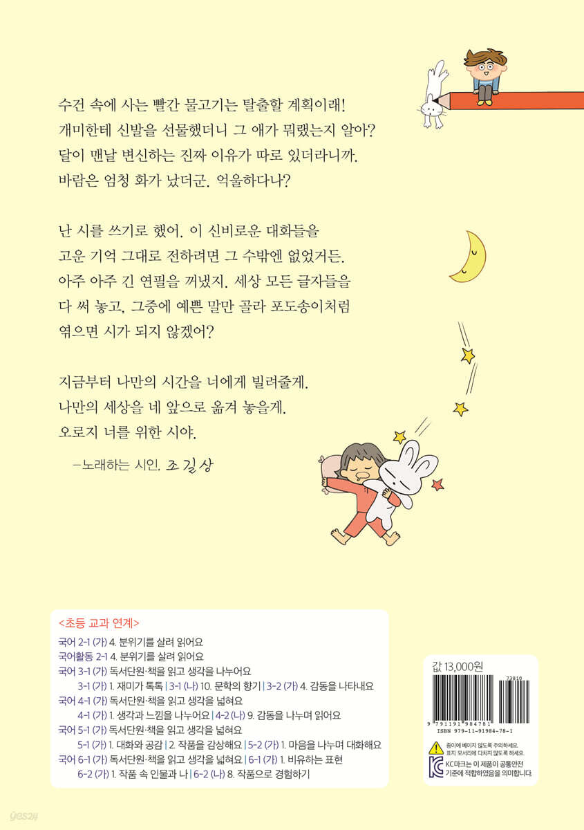 ‘조길상 시인의 동시 편 편은 따뜻하고 아름답고 간결해요. 가슴으로 가만가만 스며들어 생각 씨앗의 깊은 잠을 깨운답니다. 독자의 귀와 마음도 맑고 깨끗하게 헹구어 줘요. 무엇보다 지금 여기 어린이 정서와 아주 가깝다는 느낌이에요. 시인의 빛나는 언어 감각과 사랑이 찰랑찰랑 넘치는 따뜻한 마음은 평생을 음악과 함께해서 일 것입니다. 조길상 시인은 앞으로도 음악과 동시를 사랑하며 지구에 없었던 새롭고 아름다운 동시를 독자들에게 선물하리라 굳게 믿는답니다.’ - 이화주 (작가) |