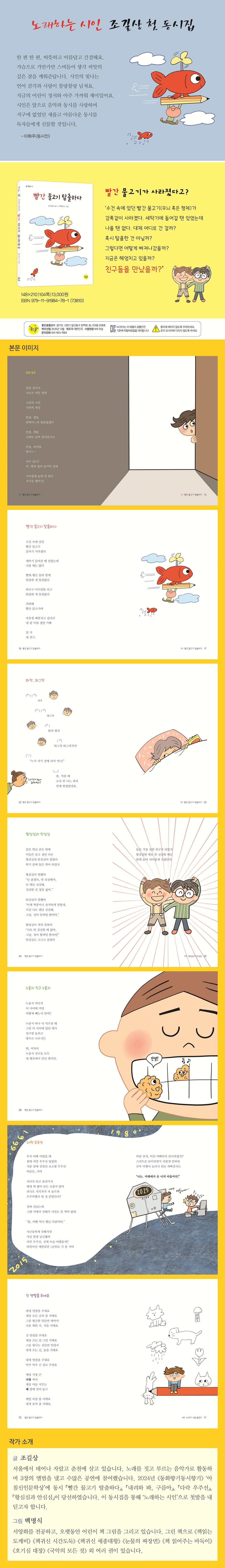 시집은 4부로 나누어 45편이 수록되었다. ‘1부: ’빨간 물고기 탈출하다’에는 ‘빨강’과 ‘탈출’이 상징하는 자유로운 상상력이 돋보이는 작품들이, ‘2부: 왕심심과 안심심’에는 친구, 놀이 같은 아이들의 주 관심사를 재치 있게 그려낸 작품들이, ‘3부: 다락 우주선’에는 가족과의 일상과 추억을 창의적인 접근방식으로 녹여낸 작품들이, ‘4부: 노래가 나를 불렀다’에는 자라는 어린이의 마음을 담담한 시적 언어들로 녹여내고 있다. 또한 1부에서 2부로, 2부에서 3부로, 4부로 넘어가는 과정이 탈출(탄생)에서부터 한 단계씩 성장을 이루어 나가는 아이의 모습을 보는 것 같아 읽는 재미를 더한다. 싱어송라이터, 노래하는 시인이 되다 저자 조길상은 직접 노래를 짓고 부르는 싱어송라이터이다. 3장의 앨범을 발표하는 동안 수많은 공연에 꾸준히 참여했고, EBS 스페이스공감 주관의 공개오디션에서 ‘이달의 헬로루키’를 수상하기도 한 실력파 음악가이다. 특히 초등학교 국어 교과서에도 실린 ‘풀밭을 걸을 땐’(이화주 시)을 포함한 6편의 아름다운 동시들에 곡을 붙여 부르며 문학적·음악적 완성도를 함께 꾀한 앨범 《기타로 지은 동시 노래집》은 발매와 동시에 여러 매체가 관심 있게 보도할 만큼 반향을 불러일으키기도 했다. 2024년 계간 《동화향기동시향기》의 ‘아침신인문학상’에 동시 4편이 당선하며 시인으로 등단하였다. 기존의 동시들과 조금은 색다른 작법으로 써낸 작품들을 모아 첫 동시집을 선보인 것이다. 초등 교과 연계 국어 2-1 (가) 4. 분위기를 살려 읽어요 3-1 (가) 독서단원·책을 읽고 생각을 나누어요 3-1 (가) 1. 재미가 톡톡|3-1 (나) 10. 문학의 향기 3-2 (가) 4. 감동을 나타내요 4-1 (가) 독서단원·책을 읽고 생각을 넓혀요 4-1 (가) 1. 생각과 느낌을 나누어요|4-2 (나) 9. 감동을 나누며 읽어요 5-1 (가) 독서단원·책을 읽고 생각을 넓혀요 5-1 (가) 1. 대화와 공감|2. 작품을 감상해요 5-2 (가) 1. 마음을 나누며 대화해요 6-1 (가) 독서단원·책을 읽고 생각을 넓혀요|6-1 (가) 1. 비유하는 표현 6-2 (가) 1. 작품 속 인물과 나|6-2 (나) 8. 작품으로 경험하기 국어활동 2-1 4. 분위기를 살려 읽어요 |
