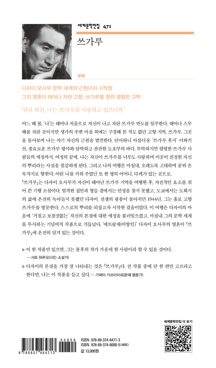 --- p.9 나는 쓰가루 사람이다. 나의 조상은 대대로 쓰가루번의 농민이었다. 말하자면 순수 혈통 쓰가루인이다. 그러니 조금도 허물없이, 이처럼 쓰가루의 험담을 하는 거다. 타지 사람이 만약 나의 이러한 험담을 듣고서 안이하게 쓰가루를 얕본다면, 나는 역시나 불쾌히 여기리라. 뭐라 하건, 나는 쓰가루를 사랑하고 있으니까. --- pp.30-31 나에겐, 또 다른 전문 과목이 있다. 세상 사람은 예컨대, 그 과목을 사랑이라 부른다. 사람의 마음과 사람의 마음이 맞닿는 걸 연구하는 과목이다. 나는 이번 여행에서, 주로 이 한 과목을 추적했다. --- p.35 어른이라는 건 쓸쓸한 법이다. 서로 사랑하면서도 조심하느라, 남남처럼 서먹서먹함을 떨치지 못한다. 어째서, 그리 조심스러워야만 하는 걸까? 그 답은 별거 아니다. 멋들어지게 배신당하고, 된통 창피를 당한 적이 너무 많았기 때문이다. 사람은 믿을 게 못 된다, 라는 발견은, 청년이 어른으로 이행하는 제1과다. 어른이란, 배신당한 청년의 모습이다. --- p.47 도회인으로서 내게 불안을 느껴, 쓰가루인으로서 나를 움켜잡으려는 염원이다. 표현을 바꾸자면, 쓰가루인이란 어떤 사람이었나, 그걸 밝혀 내고 싶어서 여행을 떠난 것이다. 내 삶의 본보기로 삼을 순수 쓰가루인을 찾아내고 싶어서 쓰가루에 온 것이다. 그리고 나는 참으로 수월히도, 곳곳에서 그걸 발견했다. --- p.55 잘게 뜯어선 던지고, 잡아 뽑아선 던지고, 따선 던지고, 마지막엔 자기 목숨까지도, 라는 식의 애정 표현은 간토, 간사이 사람들한테는 오히려 무례하고 폭력적인 것처럼 여겨져 결국은 경원당하고 마는 게 아닌가 싶어, 나는 S씨로 인해 나 자신의 숙명을 깨닫게 된 듯한 느낌이 들어, 돌아오는 길에 S씨가 그립고 안타까워 어쩔 바를 몰랐다. 쓰가루인의 애정 표현은, 약간 물로 희석해서 복용하지 않으면 타 지역 사람한테는 버거운 구석이 있을지도 모른다. --- p.78 “술은, 어떻게 하지요? 배낭에 맥주 두세 병, 넣어 둘까요?” 부인의 말에 나는 정말이지, 식은땀이 서 말쯤 흐를 법하게 창피스러웠다. 어째서 술꾼 나부랭이 면목 없는 종족의 남자로 태어났는가, 싶었다. --- p.94 가나기 생가에서는, 신경이 피로해진다. 더구나 나는 나중에 이처럼 글로 쓰니까 글렀다. 육친을 쓰고, 그리하여 그 원고를 팔지 않고선 살아갈 수 없는 고약한 전생의 업을 짊어지고 있는 남자는, 신으로부터 그 고향을 빼앗긴다. 결국 나는 도쿄의 누추한 집에서 선잠을 자고, 생가의 애틋한 꿈을 꾸며 그리워하고, 이곳저곳 헤매다가, 그러고는 죽을지도 모른다. --- p.146 집으로 돌아와 형에게, 가나기의 경치도 상당히 좋아요, 새삼스레 그런 생각이 들었습니다, 라고 말했더니, 형은, 나이를 먹으면 자신이 태어나 자란 땅의 경치가 교토보다도, 나라보다도 곱지 않은가, 그리 여겨지기 마련이라고 대답했다. --- p.164 나는 형한테서, 그 사건에 대해 아직 용서받았다고 여기진 않는다. 평생, 틀렸는지도 모른다. 금이 간 찻종은, 어찌할 도리가 없다. 어찌해 본들, 원래 그대로는 되지 못한다. 쓰가루인은 특히, 마음의 금을 잊지 않는 종족이다. 이후, 이제 이번뿐, 두 번 다시 형과 함께 바깥을 걷는 기회는, 없을지도 모른다는 생각도 했다. --- p.168 나는 그런 사소한 한 가지를 발견한 것만으로도, 돌아가신 아버지의 ‘인간’에 가닿은 듯한 느낌이 들어, 이 M씨 집에 들른 보람이 있다고 생각했다. --- p.176 쓰가루 깊은 곳 사람들한텐 사실인즉, 역사의 자신감이라는 게 없다. 아예 없는 거다. 그러니까 무턱대고 어깨를 으쓱 치켜올리고, “그이는 미천한 자야!” 어쩌고 남의 험담만 늘어놓으면서 오만한 자세를 취하지 않을 수 없게 되는 거다. 그것이 쓰가루인의 반골 기질이 되고, 고집통이가 되고, 껄끄러움이 되고, 그리하여 슬픈 고독의 숙명을 형성하게끔 되었는지도 모른다. 쓰가루인이여, 낯을 들어 웃어라! --- pp.179-180 이번에 내가 쓰가루에 와서, 무슨 일이 있어도, 꼭 만나 보고 싶은 사람이 있었다. 나는 그 사람을, 내 어머니라 여기고 있다. 삼십여 년이나 만나지 못했음에도, 나는, 그 사람 얼굴을 잊지 못한다. 나의 일생은, 그 사람으로 인해 확정되었다고 할 수 있을지도 모른다. --- p.191 한데 나는, 이 유쾌한 무악의 군중 속에서, 나를 키워 준 부모를 찾아내야만 한다. 헤어진 뒤로, 어느새 삼십 년 가까이 된다. 눈이 큼직하고 뺨이 발그레한 사람이었다. --- p.202 정말이지, 이미, 안심해 버렸다. 다리를 쭉 내뻗고 멍하니 운동회를 보며, 마음속 무엇 한 가지 생각할 게 없었다. 이젠 뭐가 어떻게 되더라도 괜찮다, 싶은 그야말로 아무 근심 없고 평온한 상태다. 평화란, 이런 기분을 말하는 걸까? 만약 그러하다면, 나는 이때, 태어나 처음 마음의 평화를 체험했다고도 할 수 있다. --- p.208 나는 다케의 그렇듯 당차고 스스럼없는 애정의 표현법을 접하고, 아아! 나는, 다케를 닮았다, 생각했다. 형제 가운데 나 혼자, 세련되지 못하고 덜렁대는 구석이 있는 건, 이 슬픈 키워 준 부모의 영향이었다는 사실을 깨달았다. 나는 이때 비로소, 내 성장의 본질을 똑똑히 알게 되었다. --- pp.212-213 |