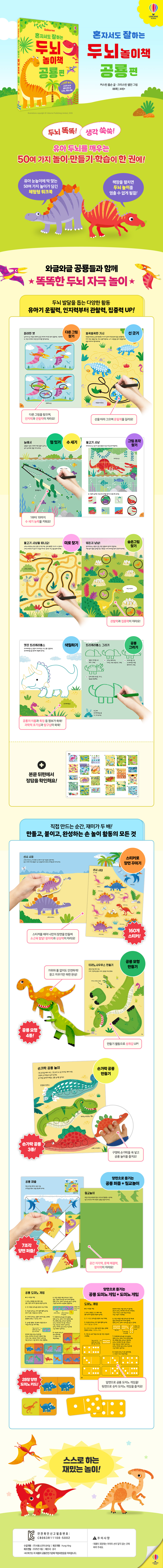 운필력 · 인지력 · 관찰력 · 집중력까지 한 번에 UP! 책장을 펼치면 넓고 생동감 넘치는 화면 속 알록달록한 공룡들이 아이들을 맞이합니다. 장마다 숫자 세기, 짝 찾기, 다른 그림 찾기, 미로 찾기, 점 잇기 등 기본 사고 능력 향상에 도움을 주는 활동이 가득해요. 연필로 선을 그리며 ‘운필력’을 기르고, 숨은 그림과 차이점을 찾는 과정에서 ‘인지력, 관찰력, 집중력’이 자연스럽게 자라납니다. 점 잇기를 통해 수 개념도 익힐 수 있어요. 다양한 공룡들의 이름과 특징을 함께 접하며 놀이와 학습이 자연스럽게 연결되고, 과학적 흥미도 넓어질 거예요. ◆ 직접 만드는 순간, 재미가 두 배! 만들고, 붙이고, 완성하는 손 놀이 활동의 모든 것 책에는 ‘160개 스티커’와 ‘활동지 8장’이 함께 들어 있어 아이들이 손으로 직접 조작하며 새로운 경험을 할 수 있습니다. 공룡 스티커를 붙여 장면을 꾸미는 과정에서 창의력과 상상력이 자라고, ‘공룡 모형 4종’과 ‘손가락 공룡 3종’은 가위나 풀 없이도 쉽게 떼어 만들 수 있어 성취감을 느끼기 좋아요. ‘직소 공룡 퍼즐’과 ‘칠교놀이’는 공간 지각력과 문제 해결 능력을 키워 주고, 직접 만들어 즐기는 ‘도미노 게임’은 수 세기 능력과 사고력 발달에 도움을 줍니다. 만들고 붙이는 활동을 통해 소근육 발달은 물론, 즐거운 두뇌 자극 경험이 자연스럽게 이어집니다. |