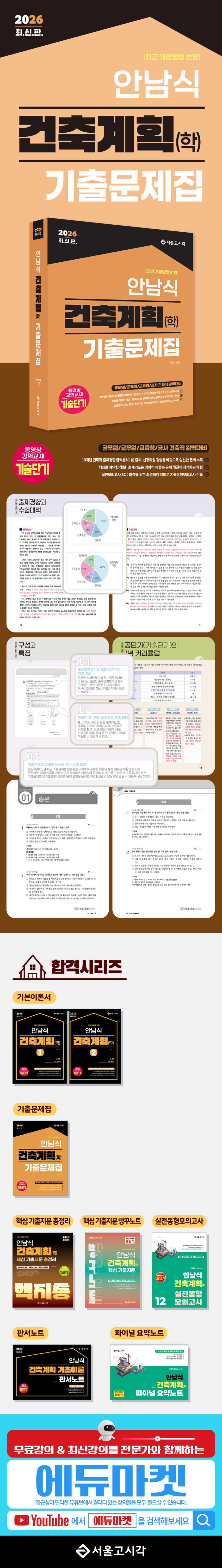 Chapter 01 ▶ 총론 Chapter 02 ▶ 주거건축(도시계획/단지계획/단독주택/공동주택) Chapter 03 ▶ 업무건축(사무소/은행) Chapter 04 ▶ 상업건축(상점/백화점) Chapter 05 ▶ 교육건축(학교/도서관/유치원) Chapter 06 ▶ 숙박시설/병원건축(호텔/병원) Chapter 07 ▶ 문화시설(극장/영화관/미술관) Chapter 08 ▶ 산업건축/체육시설(공장/창고/체육시설) PART 02 건축사 Chapter 01 ▶ 한국건축사 Chapter 02 ▶ 서양건축사 Chapter 03 ▶ 건축가와 주요작품(한국건축/서양건축) PART 03 건축환경 Chapter 01 ▶ 건축환경/일사-일조(태양광/태양열시스템) Chapter 02 ▶ 빛 환경 Chapter 03 ▶ 열 환경 Chapter 04 ▶ 공기 환경 Chapter 05 ▶ 음 환경 Chapter 06 ▶ 색채 환경 PART 04 건축설비 Chapter 01 ▶ 위생설비(급수/급탕/배수, 통기/오수처리설비) Chapter 02 ▶ 공기조화설비(공기조화/냉방/난방설비) Chapter 03 ▶ 전기/방재/운송설비(전기/가스/소화/운송설비) PART 05 건축법규 Chapter 01 ▶ 건축법 Chapter 02 ▶ 주차장법 Chapter 03 ▶ 국토의 계획 및 이용에 관한 법률 Chapter 04 ▶ 장애인?노인?임산부 등의 편의증진보장에 관한 법률 Chapter 05 ▶ 노인복지법 및 건축물의 에너지절약설계기준 ▶ 부록. 실전모의고사 |