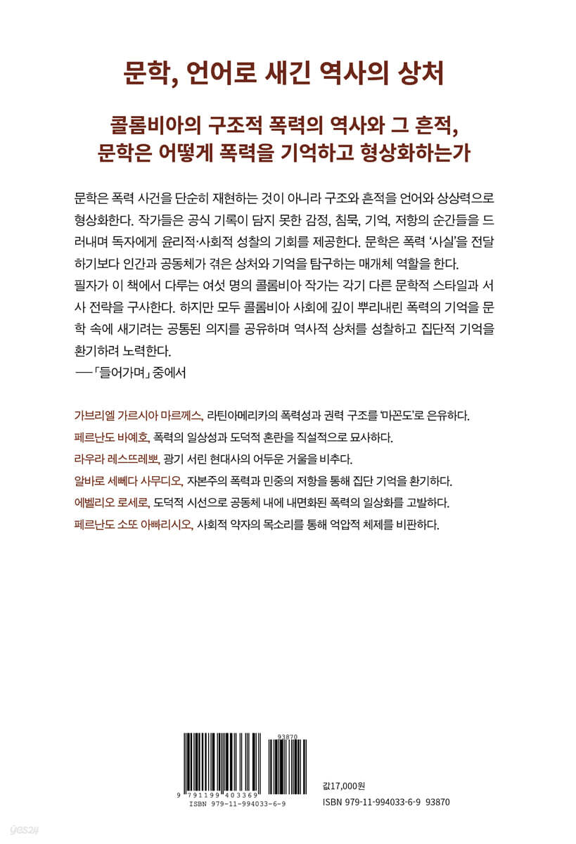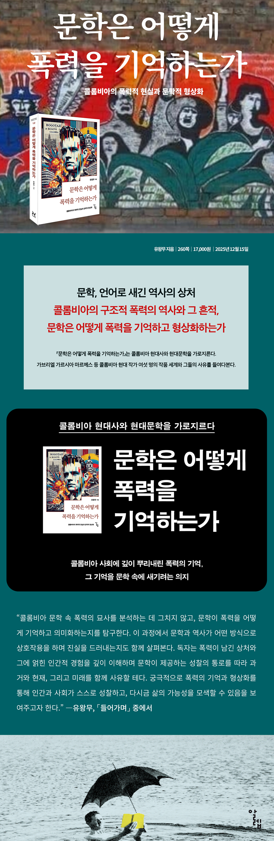콜롬비아를 생각하면 안데스 소녀들의 미소, 보고따 고원의 아침 안개, 혹은 가브리엘 가르시아 마르께스의 마술적 리얼리즘이 생각날 수 있다. 하지만, 50년 넘게 지속된 내전, 무장 게릴라 조직과 마약 카르텔, 납치와 살인, 정치적 폭력과 무수한 실종자들이 생각나기도 할 것이다. 최근에는 마약과 관련한 갈등이 다시 부각하고 있다. 콜롬비아 현대사를 관통하는 폭력의 역사가 있다. 이 나라의 폭력은 단순한 정치적 갈등이 아니라, 내전, 게릴라 조직, 우익 민병대, 마약 카르텔을 거치며 사회 전반에 내면화된 현재 진행형의 현실이 되었다. 이 맥락에서, 문학은 공식 기록이 담지 못하는 개인의 감정, 기억, 침묵의 순간들을 포착하는 핵심 역할을 수행한다. 문학은 폭력의 사실을 나열하는 것을 넘는다. 문학은 그 폭력이 남긴 상처와 흔적을 탐구하며 독자에게 윤리적, 사회적 성찰의 기회를 제공한다. 콜롬비아에서 문학으로 학위를 받고, 오랜 시간 콜롬비아 문학과 문화를 연구해 온 유왕무 교수의 『문학은 어떻게 폭력을 기억하는가』는 콜롬비아 현대사와 현대문학을 가로지른다. 가브리엘 가르시아 마르께스 등 콜롬비아 현대 작가 여섯 명의 작품 세계와 그들의 사유를 들여다본다. 유왕무 교수가 이 책에서 다루는 여섯 명의 콜롬비아 작가는 공통되기도 하고 차이가 나기도 한다. 우선 그들은 각기 다른 문학적 스타일과 서사 전략을 구사한다. 하지만 모두 콜롬비아 사회에 깊이 뿌리내린 폭력의 기억을 문학 속에 새기려는 공통된 의지를 공유하고 있다. 이를 통해 역사적 상처를 성찰하고 집단적 기억을 환기하려 노력한다. 가브리엘 가르시아 마르께스는 라틴아메리카의 폭력성과 권력 구조를 ‘마꼰도’로 은유했다. 페르난도 바예호는 폭력의 일상성과 도덕적 혼란을 직설적으로 묘사했으며, 라우라 레스뜨레뽀는 광기 서린 현대사의 어두운 거울을 비추었다. 알바로 세뻬다 사무디오는 자본주의 폭력과 민중의 저항을 통해 집단 기억을 환기했고, 에벨리오 로세로는 도덕적 시선으로 공동체 내에 내면화된 폭력의 일상화를 고발했다. 페르난도 소또 아빠리시오는 사회적 약자의 목소리를 통해 억압적 체제를 비판했다. 문학적 스타일과 서사 전략이 서로 다른 콜롬비아 작가 여섯 명은 먼저, 폭력을 재현하며 그 폭력을 어떻게 기억하는지를 보여준다. 따라서 유왕무 교수의 시선 역시, ‘폭력의 문학적 형상화’에서 출발하지만, 단지 문학 속 폭력의 묘사를 분석하는 데 그치지 않고, 문학이 폭력을 어떻게 기억하고 의미화하는지 탐구한다. 그런 점에서 이 책은 중요한 메시지를 전한다. 첫째, 문학은 단순한 허구나 미학적 장치에 그치지 않고, 역사와 인간 경험의 복잡성을 재현하고 재해석하는 강력한 도구다. 둘째, ‘폭력을 기억하기’는 단순히 과거를 떠올리는 것이 아니라 그 흔적을 성찰하며 오늘날 윤리적 책임을 되묻는 행위다. 셋째, 역사와 문학은 서로 독립된 영역이 아니라 상호 보완적인 관계에서 때로는 긴장과 충돌을 통해 진실을 탐구하는 통로이다. 독자는 폭력이 남긴 상처와 그에 얽힌 인간적 경험을 깊이 이해하며 문학이 제공하는 성찰의 통로를 따라 과거와 현재, 그리고 미래를 함께 사유할 것이다. 궁극적으로 폭력의 기억과 형상화를 통해 인간과 사회가 스스로 성찰하고, 다시금 삶의 가능성을 모색할 수 있음을 보여주고자 한다. 재현을 넘어 역사적 증언과 저항의 실천이 되다: 가브리엘 가르시아 마르께스의 역사소설 가브리엘 가르시아 마르께스는 마꼰도라는 신화적 공간을 통해 폭력의 반복성과 권력 구조를 은유적으로 드러내며 라틴아메리카의 역사적 현실을 환상과 상징 언어로 재구성한다. 제1장은 그의 주요 작품, 특히 『낙엽』, 『아무도 대령에게 편지하지 않다』, 『백년의 고독』을 중심으로 그의 문학이 콜롬비아의 폭력적인 역사와 어떻게 유기적으로 연결되는지를 살펴본다. 가르시아 마르께스의 문학은 단순한 허구의 산물이 아니라, 콜롬비아 현대사를 관통하는 구조적 폭력, 정치적 갈등, 그리고 외세 자본의 착취를 서사적으로 재구성하고 비판하는 역사적 증언의 역할을 수행한다. 작가는 ‘마술적 리얼리즘’이라는 독특한 기법을 통해 공식 역사에서 소외되고 잊힌 민중의 기억을 복원한다. 그의 작품은 19세기 말의 ‘천일 전쟁’부터 20세기 중반의 ‘라 비올렌시아(La Violencia)’ 시대, 그리고 미국계 다국적 기업 유나이티드 프루트 컴퍼니(UFC)에 의한 경제적 착취와 ‘바나나 농장 학살 사건’에 이르기까지 구체적인 역사적 사건들을 서사의 중심축으로 삼는다. 가르시아 마르께스는 문학을 통해 과거의 비극이 현재의 사회적 모순과 단절되지 않았음을 역설하며, 역사를 현재와 이어진 살아 있는 실체로 인식하는 ‘진정한 역사의식’을 구현한다. 그의 작품 속 인물들이 겪는 고독은 개인적 감정을 넘어, 폭력과 망각의 순환에서 고립된 라틴아메리카의 집단적 정서를 상징한다. 궁극적으로 그의 문학은 억압된 진실을 폭로하고, 민중의 목소리를 되살리며, 왜곡된 역사에 저항하는 강력한 예술적 실천으로 평가된다. 펜으로 저항하는