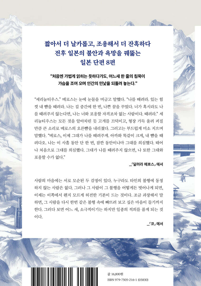 다자이 오사무의 솔직하고 실존적인 문장은 독자에게 자신도 모르게 감추고 있었던 마음의 그림자를 직면하게 하였고, 미야자와 겐지의 세계는 현실을 벗어나 따뜻한 상상과 우주적 사유로 이끄는 길을 열어주었다. 아쿠타가와 류노스케의 단편은 짧은 호흡 속에서도 인간 본성의 복잡함을 다각도로 비추며 독자에게 질문을 던졌고, 야마모토 슈고로는 소박하고 일상적인 장면을 통해 인간 관계의 진실하고 따뜻한 면모를 탐구하였다. 키쿠치 간의 작품은 사회적 현실과 인간의 도덕적 책임을 성찰하게 만드는 서사로 구성되어, 단순한 감상에 머무르지 않는 깊은 사유를 이끌어내었다. 문학은 때로 위로가 되며, 때로는 질문이 된다. 이 책의 단편들은 겨울의 고요 속에서 오히려 더욱 강하게 울리는 인간적 고백과 세계에 대한 사유를 담아, 계절적 분위기와 완벽하게 어우러지는 문학적 경험을 제공하였다. 독자는 한 편의 작품을 읽는 동안 잠시 현실을 벗어나 깊은 감정의 층위를 탐색할 수 있고, 책을 덮은 뒤에는 자신의 삶을 비추는 새로운 시선을 얻게 되었다. 『겨울밤에 읽는 일본 문학 단편선』이 겨울밤의 독서 시간을 풍요롭게 채우며, 잔잔하지만 오래 남는 여운을 선사하는 작품집으로 자리 잡게 되기를 바랐다. |