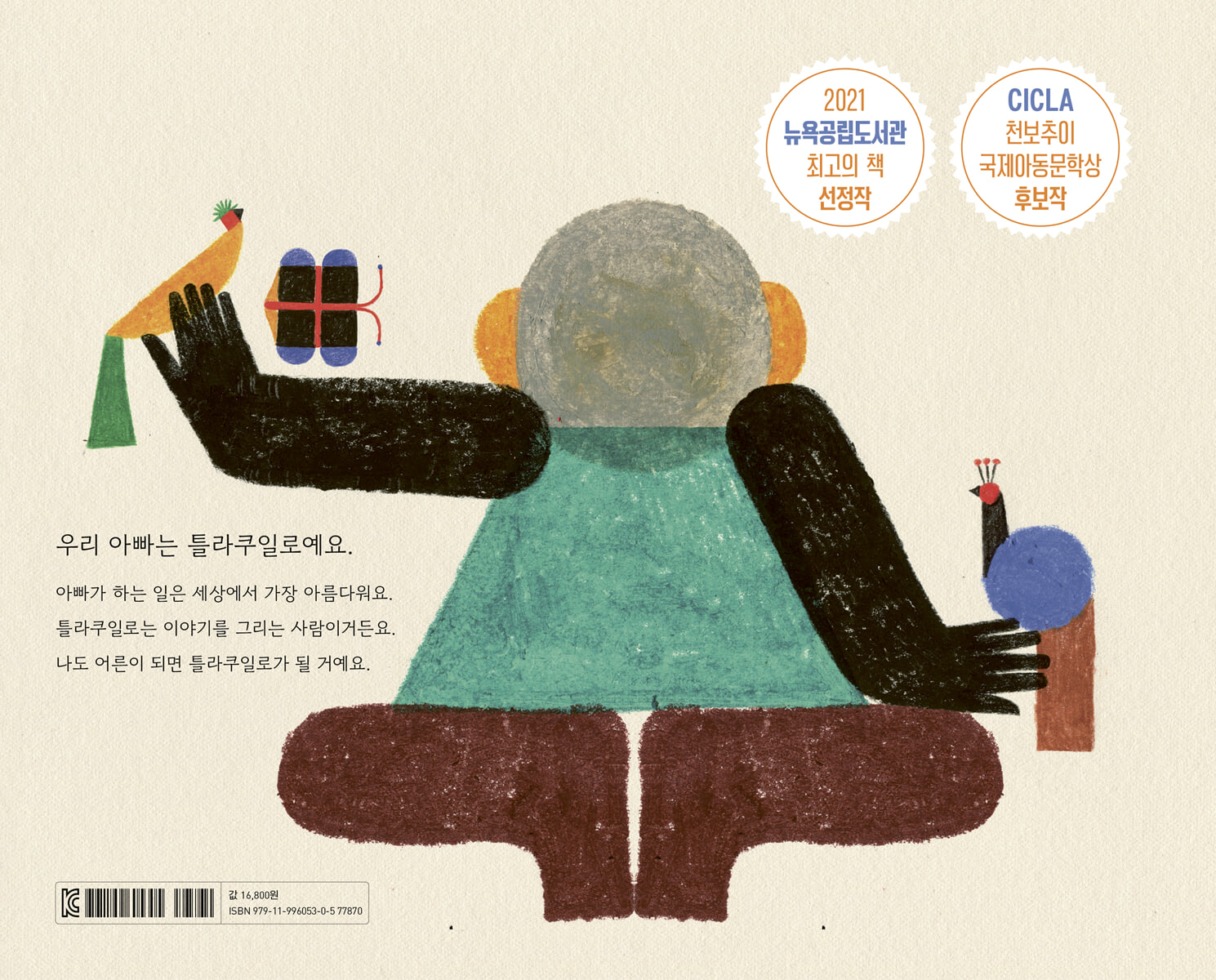 아빠가 하는 일은 세상에서 가장 아름다워요! 아이의 관찰로 전개되는 이야기는, 아버지의 손끝에서 태어나는 선과 색, 기호를 따라 흐릅니다. 아이는 매일 아버지 곁에 앉아 이야기가 어떻게 태어나고, 어떻게 마음에 머물렀다가 책이 되는지를 지켜봅니다. 아버지는 아이에게 좋은 틀라쿠일로는 이야기를 그릴 종이부터 잘 알아봐야 한다는, 일을 할 때의 기본과 태도에 대한 이야기를 들려줍니다. 아버지의 곁에서 아이는 이야기는 서둘러 적는 것이 아니라, 귀 기울여 듣고 오래 품은 뒤에야 비로소 그림으로 남겨진다는 사실을 배워 가지요. 이 책 속에서 기록은 개인의 일이 아니라 공동체의 기억이며, 책은 물건이 아니라 사람과 사람, 과거와 미래를 잇는 보물이 됩니다. 아이는 아직 모든 이야기를 이해하지는 못하지만, 오래전에 살았던 사람들의 삶과 용기가 오늘까지 전해지는 이유가 바로 ‘이야기를 그리는 사람들’ 덕분임을 깨닫게 됩니다. 그렇게 아이는 언젠가 자신도 이야기를 그리는 사람이 되어, 우리가 누구였고 어떻게 살았는지를 미래에 전하고 싶다는 꿈을 품게 됩니다. 그림이 언어가 되는 경험 세계문화 이해와 시각 문해력을 함께 키울 그림책 고대 멕시코 문양과 상징에서 영감을 받은 일러스트레이션은 이 책의 또 하나의 언어입니다. 강렬한 색채와 조형적인 구성은 그림 자체가 이야기가 되는 경험을 선사합니다. 이 책의 그림은 단순한 삽화가 아니라, 이야기를 읽게 하는 시각적 언어로 기능합니다. 고대 문양에서 출발한 색과 형태는 아이에게는 상상력을, 어른에게는 문화와 시간의 깊이를 전합니다. 페이지마다 하나의 기록이자 예술 작품처럼 구성된 그림은 ‘보는 책’의 경험을 새롭게 확장합니다. 《이야기를 그리는 사람》은 세계문화 이해와 시각 문해력을 함께 키울 수 있는 그림책으로, 어린이뿐 아니라 성인 독자에게도 깊은 인상을 남길 것입니다. |
