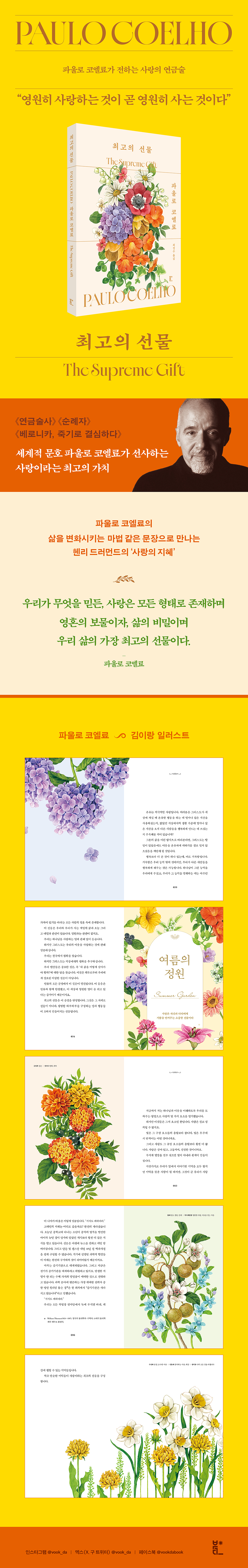 평범한 말과 행동에서 나온다” 일상을 더욱 특별하게 만드는 ‘사랑의 지침’ 파울로 코엘료는 『연금술사』, 『순례자』, 『아처』 등 수많은 작품에 담긴 마법 같은 문장으로 독자의 삶을 변화시켜 ‘영혼의 연금술사’로 불린다. 그의 글은 인생의 방향을 잃고 방황하는 이들에게 좌표가 되어주는 ‘북극성’의 역할을 한다. 『최고의 선물』에서도 사람과 사람 사이의 모든 이해와 관심은 ‘사랑’에서 시작됨을 우리에게 제시해준다. 사랑은 서로 다른 언어를 쓰더라도 우리를 소통하게 하는 “유일한 세계어”이며, 그 “말 없는 웅변”을 통해 비로소 진정한 이해에 다다를 수 있다고 말한다. 또한 빛이 프리즘을 통과해 일곱 가지 색으로 굴절되듯이, 사랑의 무지개를 이루는 아홉 가지 요소를 펼쳐 보인다. 인내, 온유, 관대, 겸손, 예의, 이타, 좋은 성품, 정직, 진실. 매일의 평범한 말과 행동 속에서 완성되는 이 단순한 미덕들이 ‘사랑’이라는 최고의 선물을 구성하는 가장 본질적인 요소임을 강조한다. 이러한 사랑의 미덕이야말로 우리 삶을 풍성하게 하고 삶에 가치를 부여하는 유일한 방법이라고 말이다. “풍성하게 사랑하는 것은 곧 풍성하게 사는 것이다” 삶을 지속하게 하는 긍정적 ‘사랑의 에너지’ “우리 자신을 사랑하고, 모든 사람을 사랑”해야 하는 까닭은 사랑이라는 감정에서 ‘생명의 에너지’가 샘솟기 때문이다. 사랑만이 ‘나’와 ‘나’를, ‘나’와 ‘타인’을 잇는 접점이 되어주며, 그 ‘이해’라는 접점을 통해 내일을 살아가고자 하는 긍정적 기대가 생겨난다. 그러므로 파울로 코엘료는 세상의 모든 중요한 가치 위에 ‘사랑’을 두어야 한다고 말한다. “모든 나라의 화폐가 쓸모없어지고 가치 없어질 때, 사랑은 우주에서 여전히 받아들여지는 유일한 화폐”일 것이라고. 하지만 ‘사랑’은 저절로 생겨나는 감정이 아니다. “어떤 사람을 위대한 예술가, 위대한 작가, 위대한 음악가로 만들어주는” 유일한 비결이 ‘연습’이듯이 사랑 역시 영혼의 꾸준한 단련이 필요하다. 이러한 노력만이 우리를 자신과 타인을 진정으로 이해하고 사랑할 수 있는 “진실한 존재로 변화”시킬 수 있기 때문이다. 그 사랑에서 비롯된 긍정적 변화를 통해 우리의 삶은 더욱 가치 있고 풍성한 의미를 얻게 될 것이다. 뜨겁게 사랑하는 것이 곧 뜨겁게 사는 것이다. 파울로 코엘료는 사랑에 대한 근원적 의미와 중요성은 물론, 사랑을 삶 속에서 실현하기 위한 자세와 태도 그리고 그 마음가짐까지 삶을 관통하는 깊은 사유가 담긴 문장들로 풀어냈다. 그러므로 이 책은 독자에게 인생의 가치관이 바뀌고 세상을 대하는 태도를 새롭게 하는 값진 경험을 선사할 것이다. 더불어 글과 함께 실린 김이랑 작가의 ‘사계절 꽃의 정원’ 일러스트가 ‘최고의 선물’이라는 감동을 더한다. |