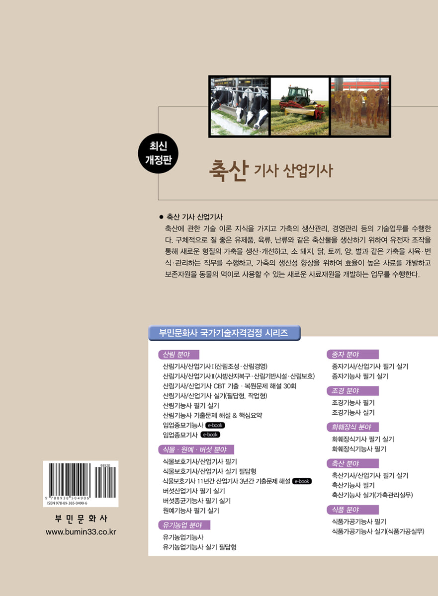 1. 기본적 유전 현상 2. 양적 형질의 유전과 변이 3. 교배 방법 4. 종축 능력검정 및 선발 5. 종축 질병 예방 및 관리 Ⅱ. 가축번식생리 1. 번식 관리 2. 생식 기관의 구조와 기능 3. 생식 세포의 형성과 생리 4. 번식 내분비 작용 5. 가축의 번식 생리 6. 가축의 비유 생리 7. 발정 관리 8. 번식 장애 Ⅲ. 대가축 생산관리 1. 대가축 사료 관리 2. 한우 입식 및 육성관리 3. 한우 비육 및 출하 관리 4. 젖소 사양 관리 5. 유가공 6. 착유 관리 7. 대가축 분뇨처리 8. 대가축 시설 장비 관리 9. 축산 환경관리 10. 대가축 질병 및 방역 관리 11. 대가축 경영 관리 Ⅳ. 중소가축 생산관리 1. 중소가축 사양 관리 2. 가금 환경관리 3. 중소가축 분뇨처리 4. 중소가축 시설 장비 관리 5. 중소가축 질병 관리 6. 중소가축 경영 관리 Ⅴ. 사료생산 및 관리 1. 사료의 종류와 특성 2. 초지 조성 3. 초지의 관리 및 이용 4. 사료작물 재배 5. 사료작물의 이용 6. 사료 제조 및 관리 Ⅵ. CBT 기출·복원문제 축산기사 CBT 기출·복원문제 1회~11회 Ⅶ. 축산기사·산업기사 실무 2011~2025년 축산기사·산업기사 실기 필답형 기출문제 |