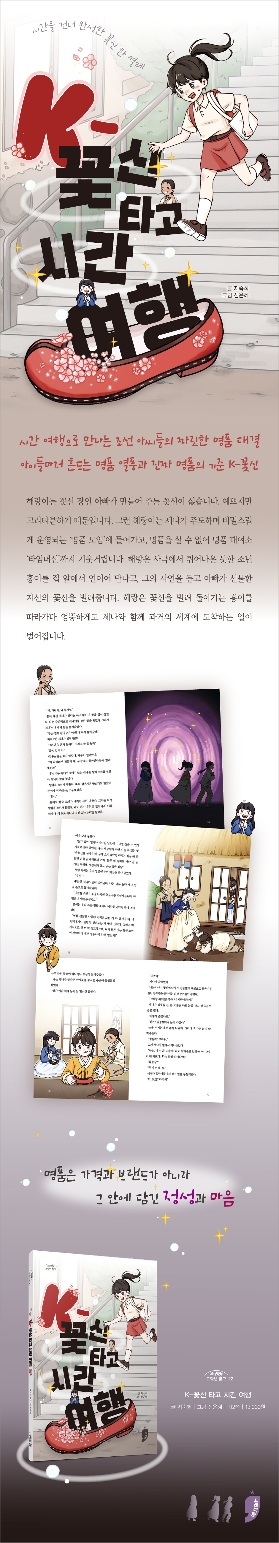 언젠가부터 명품 열풍이 거셉니다. 사치품이라고 표현해야 할 것들이 오직 가격과 브랜드만으로 명품이라는 이름을 달고 명품의 기준마저 무너뜨리고 있습니다. 그 열풍은 이제 어른을 넘어 동심마저 흔들고 있습니다. 명품으로 포장된 사치품은 보여주기식 소비의 결과입니다. 이런 소비는 자기 과시의 수단일 뿐 마음을 공허하게 만들고 심지어 관계를 흔들어 놓기도 합니다. 명품은 가격과 브랜드가 아니라 쏟은 정성과 노력으로 평가되어야 합니다. 해랑이 아빠처럼 밤을 새워 망치를 두드리고 한 땀 한 땀 정성을 다해 완성한 꽃신이 명품이어야 합니다. 꽃신에 매달리는 아빠를 뒤로하고 명품 모임마저 들어갔던 해랑은 결국에 깨닫습니다. 땀과 눈물이 밴 아빠의 꽃신이야말로 명품이란 사실을. 누군가를 위해 깃든 마음이야말로 가장 귀하고 소중하다는 것을. |