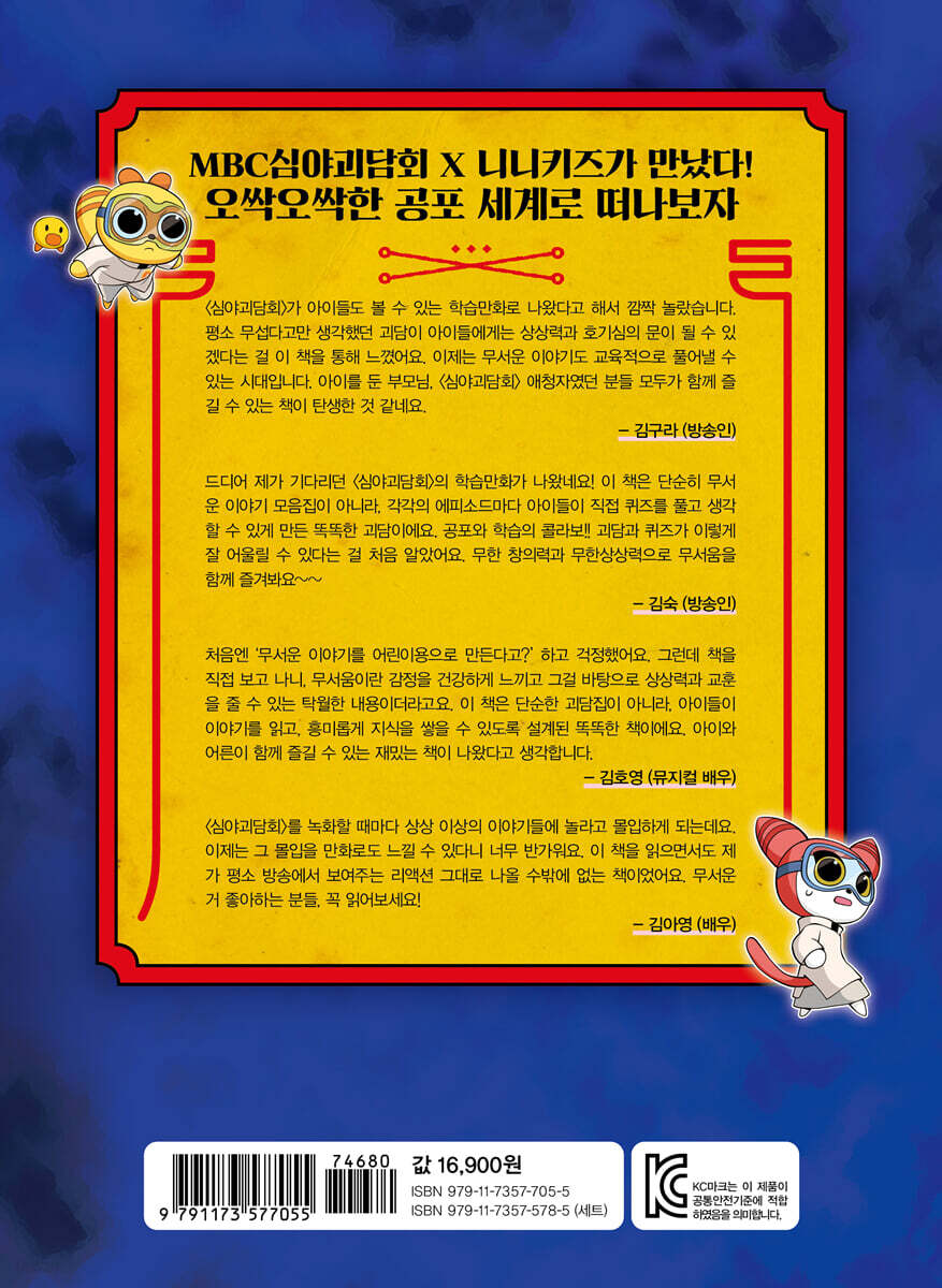 〈심야괴담회〉가 아이들도 볼 수 있는 학습만화로 나왔다고 해서 깜짝 놀랐습니다. 평소 무섭다고만 생각했던 괴담이 아이들에게는 상상력과 호기심의 문이 될 수 있겠다는 걸 이 책을 통해 느꼈어요. 이제는 무서운 이야기도 교육적으로 풀어낼 수 있는 시대입니다. 아이를 둔 부모님, 〈심야괴담회〉 애청자였던 분들 모두가 함께 즐길 수 있는 책이 탄생한 것 같네요. - 김구라 (방송인)