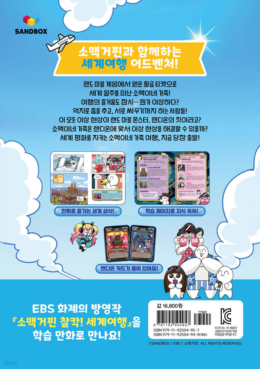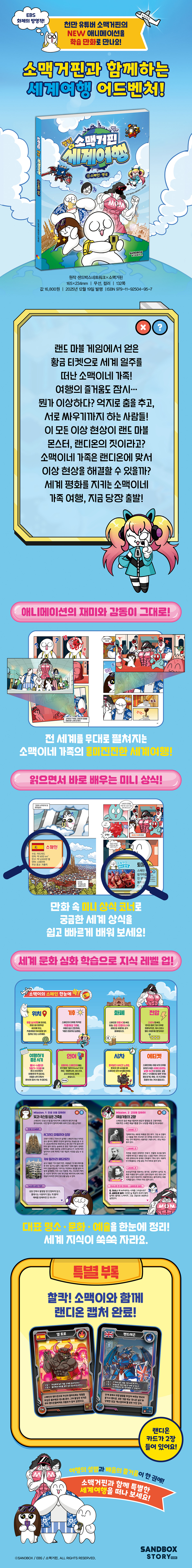 미션을 성공하고 세계여행을 완주할 수 있을까요? 소맥이가 즐겨 하던 ‘랜드 마블’ 게임에서 세계 일주 황금 티겟을 얻게 되면서 소맥이네 가족의 꿈같은 세계여행이 시작돼요. 설렘 가득한 첫 여행지는 스페인과 영국! 하지만 여행의 즐거움도 잠시, 여행지 곳곳에서 이상한 일들이 벌어지기 시작해요. 사람들이 억지로 춤을 추거나 갑자기 다투는 등, 전 세계의 평화를 위협하는 이상 현상이 발생한 거예요! 이 모든 것이 랜드 마블의 몬스터 ‘랜디온’의 짓임을 알게 된 소맥이네 가족! 랜디온을 막기 위해서는 그들이 내는 게임에서 승리하고, 캡처폰으로 사진을 찍어 랜드온을 다시 게임 속으로 돌려보내야 해요. 과연 소맥이네 가족은 세계 평화를 지키기 위한 미션을 성공하고 무사히 여행을 마칠 수 있을까요? ■ 만화를 재미있게 읽다 보면, 세계 상식과 지식은 자연스럽게 쑥쑥! 『소맥거핀 찰칵! 세계여행』은 재미와 학습을 동시에 잡았어요! 만화 속 내용과 자연스럽게 연결된 다양한 학습 내용을 통해, 이야기 속 모험을 즐기면서도 세계 문화와 상식을 배울 수 있답니다. ★ 게임처럼 즐기는 세계 여행 스토리! 랜디온이 내는 게임과 미션을 해결하며 흥미진진한 스토리에 빠져들어요. 직접 QR 코드를 촬영해 랜디온 캡처할 수 있어 이야기의 몰입도가 더욱 높아져요. ★ 〈찰칵! 미니 상식〉으로 궁금증 바로 해결! 만화 속에 등장하는 장소와 문화 요소를 짧고 알기 쉽게 정리해 놓았어요. 이야기를 읽으면서 궁금증을 바로바로 확인할 수 있답니다. ★ 미션, 세계 지식을 잡아라! 학습 페이지로 지식 쑥쑥! 세계 속의 랜드마크·문화·음식을 미션처럼 즐기는 학습 페이지! 누나가 알려 주는 ‘인생 샷 TIP’으로 여행 사진도 멋지게 남기고, ‘귀시니의 한 줄 인터뷰’로 역사 속 과거 인물도 만나 보세요. 다양한 코너를 통해 재미와 지식을 동시에 경험하며 세계 지식을 탄탄하게 쌓을 수 있습니다. |
