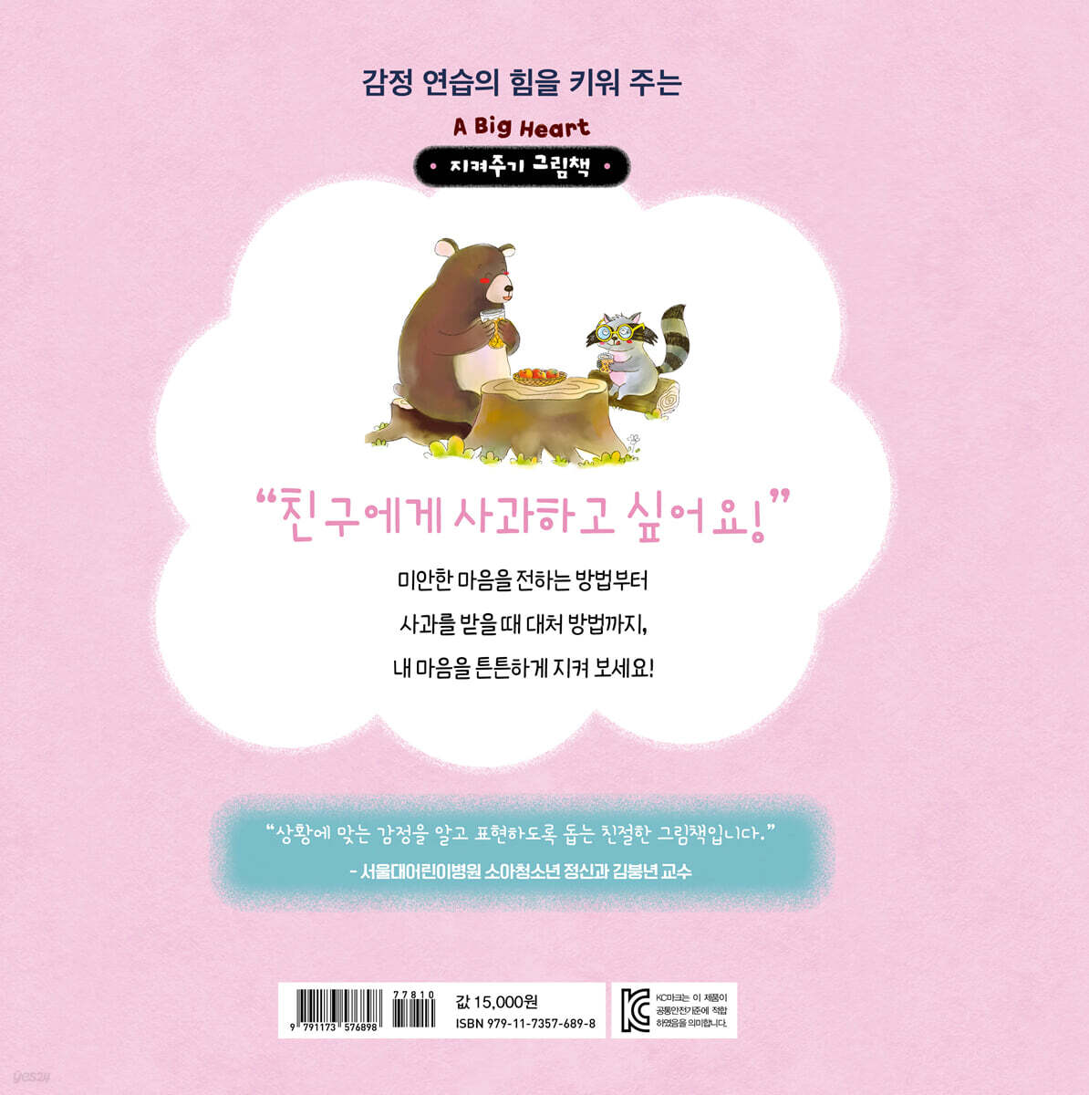 7세 고시, 4세 고시라는 말이 등장할 정도로 아이들의 사회생활과 교육이 일찍 시작되고 있다. 자신을 감싸 주던 따뜻한 가정에서 벗어나 사회생활을 시작한 아이는 다른 사람과 마음을 주고받으면서 따뜻한 정을 느끼기도 하고, 마음을 쓰며 상처를 받기도 한다. 한 기사에 따르면, 3~5세 아이들이 정서적 불안과 또래 관계에 어려움을 겪는 일이 증가했다고 한다. 또한 연세대학교 의과대학의 엄소영 교수는 “이 시기에 심한 스트레스를 받으면 인지 발달과 정서적 안정에 부정적인 영향을 미칠 수 있다”고 말했다. 사회에 나간 아이들은 다른 사람과 어울리며 하루에도 수많은 일들을 겪는다. 그 수많은 상황 속에서 아이들이 겪는 모든 감정은 자연스러운 것이다. 하지만 때로 강한 감정은 마음의 문제를 일으키기도 한다. 문제를 안전하게 해결하려면 아이가 성장하며 점점 커지는 마음을 스스로의 힘으로 잘 지키는 것이 무엇보다 중요하다. 자신의 마음을 지키지 못하면 다른 사람에게 휘둘릴 수도 있고, 자신이 진짜 원하는 것을 깨닫기가 어렵기 때문이다. 자신의 마음을 잘 지키고 나면 반대로 한 뼘 더 성장한 자신을 느낄 수 있다. 〈A Big Heart 지켜주기 그림책〉 시리즈는 마음의 변화가 찾아왔을 때 자신의 마음이 무엇인지 알고, 그것을 어떻게 받아들여야 하는지, 어떻게 표현해야 할지를 배울 수 있다. 그림책을 읽으며 자신의 마음을 표현하는 방법을 자연스럽게 연습할 수 있어, 진짜 마음의 문제가 찾아왔을 때 아이는 당황하지 않고 당당하게 나아갈 수 있을 것이다. 단단하게 성장한 마음은 크고 작은 상처로부터 아이를 지켜 주는 방패가 되기도 한다. 이 책을 통해 아이가 보다 긍정적이고 단단한 마음으로 성장하는 데 도움이 되길 바란다. 마음을 건강하게 지켜 주는 〈A Big Heart 지켜주기 그림책〉 시리즈 을파소에서 오랫동안 독자들에게 큰 사랑을 받아 온 〈A BIG HUG 안아주기 그림책〉에 이어 〈A Big Heart 지켜주기 그림책〉 시리즈가 새롭게 발간되었다. 새로 발간되는 〈A Big Heart 지켜주기 그림책〉은 서울대학교어린이병원 소아청소년 정신과의 김붕년 교수가 감수했다. 유아기는 언어를 통해 ‘생각하는 뇌를 만드는 시기’이다. 언어를 사용해 생각을 펼치고, 감정을 표현하며, 타인과 상호작용 하는 것을 배우는 시기라는 뜻이다. 하지만 아이들은 감정을 느끼는 것이 미숙하다. 감정의 변화를 알아차려도 그 감정이 무엇인지 아는 것은 어렵다. 게다가 그 감정을 언어화하여 인식하고 표현하는 것은 그보다 훨씬 더 어려운 일이다. 상당한 경험의 축적과 연습을 요구하는 일이기 때문이다. AI가 등장하고, 디지털기기가 아무리 발달해도 결국 사람은 다른 사람들과 어울려야 하는 사회적 동물이다. 내 마음의 변화를 느끼고, 그 마음의 변화를 안전하게 표현한다면 인간관계도 원활하게 맺을 수 있을 뿐더러 무엇보다 중요한 자신의 마음을 평안하게 지킬 수 있다. 〈A Big Heart 지켜주기 그림책〉 시리즈는 자신이 느낀 인식하고 표현하는 연습을 할 수 있도록 돕는다. 특히 관계 맺기, 슬픔, 궁금증, 거절, 미안함 등 사회에 나아간 아이가 마음의 근육을 단단하게 만들면서 건강한 관계를 맺도록 돕는 주제들을 주로 다루었다. 곰, 토끼, 오리 같은 친근한 동물 캐릭터와 노래하는 새, 하늘에서 떨어지는 비, 재미있는 게임, 보호해 주는 울타리, 단단하게 얼은 얼음 같은 명쾌한 비유를 통해 유아가 이해할 수 있는 눈높이에서 이야기를 풀어냈다. 책 마지막에는 활용 가이드를 실어 부모님이나 선생님이 아이와 함께 읽은 내용에 대해 이야기하고, 질문을 통해 대화를 이어 갈 수 있도록 구성했다. 교과연계 만 3~5세 누리과정 사회단계(나를 알고 존중하기, 더불어 생활하기) 1학년 1학기 통합) 1. 학교 / 1학년 2학기 통합) 2. 약속 |