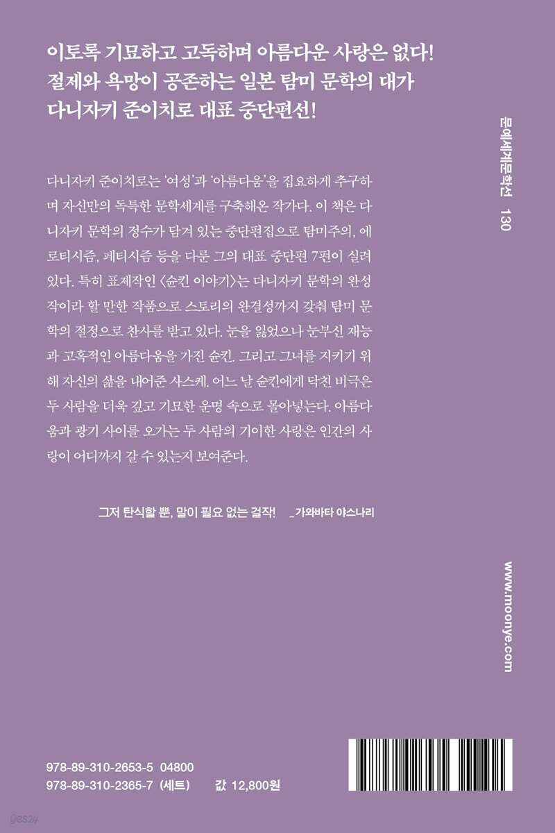 --- p.9 「문신」 중에서 엄지에서 새끼까지 가지런하게 이어진 섬세한 다섯 발가락의 형태, 에노시마 해변의 연분홍 조개 같은 발톱의 색, 구슬처럼 동그스름한 뒤꿈치, 바위틈에서 솟아나는 맑은 물에 씻은 듯한 피부의 윤택. 이 발이야말로 남자의 피를 먹고 남자의 몸을 짓밟는 발이었다. --- p.12 「문신」 중에서 그는 왼손의 새끼손가락과 약지와 엄지 사이에 끼운 붓으로 소녀의 등에 그림을 그린 후, 그 위에서 오른손으로 바늘을 찔러나갔다. 젊은 문신사의 영혼은 먹물 안에 녹아들어 피부에 스며들었다. 소주에 타서 찔러 넣는 주홍 물감 한 방울 한 방울은 그의 생명에서 나왔다. 그는 그곳에서 자기 영혼의 빛을 보았다. --- pp.16-17 「문신」 중에서 나는 너를 진정 아름다운 여자로 만들기 위해 문신 속에 나의 혼을 심었다. 이제 앞으로 온 나라에서 너보다 아름다운 여자는 없다. 너는 이제 과거처럼 두려운 마음을 가질 필요가 없다. 남자란 남자는 모두 너의 거름이 될 거다. --- p.18 「문신」 중에서 세 사람은 뭔가 새롭고 진기한 유희 방법이라도 발견한 것처럼 기쁘게 미쓰코의 명령에 복종하여 미쓰코가 “의자가 되어라”라고 말하면 곧바로 바닥에 엎드려 등을 내밀었고, “담배통이 되어라”라고 말하면 즉시 입을 벌렸다. 미쓰코는 점점 더 거만해져서 세 명을 노예처럼 부렸다. --- pp.84-85 「소년」 중에서 손바닥으로 얼굴 전체에 고루 펴 바르자 생각보다 화장이 잘 먹었다. 달콤한 냄새를 풍기는 서늘한 물기가 모공에 스며드는 피부의 쾌감은 각별했다. 연지와 분을 바르자 석고처럼 하얗기만 한 내 얼굴이 발랄하고 생기 있는 여자의 얼굴로 변해가는 즐거움이란. --- p.96 「비밀」 중에서 나비처럼 날아다니는 종류의 여자가 확실했다. (…) 긴 속눈썹에 촉촉한 둥근 눈이 씻은 듯이 맑아 남자를 지배할 듯한 늠름한 권위마저 갖추고 있었다. 건드리면 붉은 피가 묻어 나올 것 같은 촉촉한 입술과 귓불을 덮는 긴 솜털은 옛날과 다름없지만, 코는 이전보다 조금 가파를 정도로 오뚝해 보였다. --- pp.100-101 「비밀」 중에서 “누구든지 사람이 생각하는 바는 비슷하겠죠? 지금 저도 그런 생각을 하고 있었습니다. 저도 이 달을 보며 지나가버린 세상의 환상을 그리고 있었습니다.” --- p.163 「갈대 베는 남자」 중에서 저도 올해는 작년보다, 작년은 재작년보다, 해마다 가을의 쓸쓸함이랄까 적적함이랄까, 뭐 한마디로 말하자면 어딘지 모르게 찾아오는 전혀 이유 없는 계절의 슬픔을 더욱 깊게 느낍니다. ‘바람 소리에 가을이 온 것을 알고 놀란다’거나 ‘발이 흔들려 가을바람이 분다는 것을 안다’ 같은 옛 시의 참맛을 알게 되는 것은 우리 나이쯤 되어야겠죠. --- p.163 「갈대 베는 남자」 중에서 그럴 때 아버지는 그 별장의 여주인을 ‘그분’이라고 하거나 ‘오유 님’이라고 부르며 “오유 님을 잊지 마라. 내가 이렇게 매년 너를 데려오는 것은 그분의 모습을 네가 기억해두었으면 해서다”라고 울음 섞인 목소리로 말씀하셨습니다. --- p.169 「갈대 베는 남자」 중에서 이목구비만 보면 이 정도의 미인은 적지 않지만, 오유 님의 얼굴에는 무언가 뽀얀 느낌이 있다. 눈에도 코에도 입에도 얇은 막을 하나 씌운 듯이 뽀얗고 각지거나 또렷한 선이 없는, 가만히 보고 있으면 보는 이의 눈앞이 몽롱하게 흐려지는 것 같고 그 사람 주위에만 안개가 끼어 있는 듯한, 옛날 책의 기품 있다는 말이 꼭 들어맞는 얼굴이다. 그게 오유 님의 매력이다. --- p.172 「갈대 베는 남자」 중에서 그러니 당신은 그 오구라 연못의 저택에 가서 휘황찬란한 장지문과 병풍이 있는 방에서 살아주세요. 당신이 그렇게 살아 계신다고 생각하면 저는 함께 죽는 것보다도 즐겁습니다. --- p.196 「갈대 베는 남자」 중에서 두 묘석은 낮은 돌 단상 위에 나란히 서 있고 슌킨 묘의 오른쪽에 심긴 소나무 한 그루가 초록의 가지를 묘석 위에 지붕처럼 뻗치고 있는데, 그 가지 끝에서 왼쪽으로 두세 자 떨어진 곳에 검교의 묘가 황송하다는 듯 몸을 굽혀 슌킨을 모시고 있는 모습이었다. 그것을 보면 생전에 검교가 정성을 다해 스승을 섬겨 그림자처럼 따르던 모습이 떠올라, 마치 돌에 영혼이 있어 지금도 여전히 행복을 누리는 듯했다. --- p.204 「슌킨 이야기」 중에서 나는 스승님의 얼굴을 보고 불쌍하다든가 안타깝다고 생각한 적이 한 번도 없다. 스승님에게 비하면 눈 밝은 사람이 더 비참하다. 그 기품과 미모를 갖춘 스승님이 어찌 남들의 동정을 받을 필요가 있겠는가. 오히려 나를 불쌍하다고 동정해야 할 것이다. 나와 너희는 눈과 코가 갖춰졌을 뿐, 다른 것은 무엇 하나 스승님에게 미치지 못하니 우리가 더 불구가 아니겠는가. --- p.215 「슌킨 이야기」 중에서 슌킨의 고집과 심술은 이러했지만, 유독 사스케를 대할 때 그랬고 모든 고용인에게 그렇지는 않았다. 원래 그러한 소질이 있었는데 사스케가 뭐든 기꺼이 받아주니 그에게만 극단적으로 그런 모습을 보인 것 같다. --- p.218 「슌킨 이야기」 중에 사스케는 그 어둠을 전혀 불편하게 느끼지 않았다. ‘맹인은 항상 이런 어둠 속에 있구나. 아가씨도 이런 어둠 속에서 샤미센을 