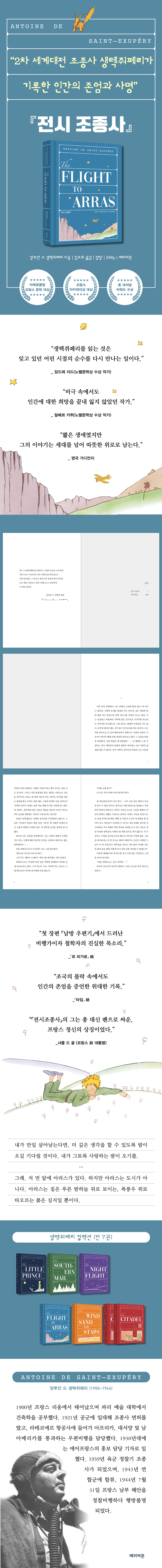 아에로클럽 프랑스 문학대상 수상작! 앙투안 드 생텍쥐페리의 《전시 조종사》(Pilote de guerre, 1942)는 제2차 세계대전 당시 작가가 직접 수행했던 정찰 비행 경험을 토대로 쓰인 작품으로, 단순한 전쟁 기록을 넘어 인간 존재와 문명, 그리고 책임에 대한 철학적 성찰을 담아낸다. 그는 프랑스 공군 소속으로 독일군의 침공에 맞서 아라스 상공을 정찰하는 임무를 맡았는데, 그 체험이 이 작품의 뼈대를 이루고 있다. 패전의 위기 속에서 쓰인 이 책은 한 조종사의 개인적인 체험담이자, 몰락해 가는 조국을 바라보는 지식인의 고뇌를 담은 시대적 증언이다. 작품은 화자인 조종사가 동료들과 함께 아라스 전선 상공으로 출격하는 과정을 중심으로 전개된다. 압도적인 전력 차이 속에서도 그는 명령을 수행해야 하며, 언제 추락할지 모르는 위험과 맞닥뜨린다. 그러나 소설의 중심은 전투의 긴박한 순간 자체가 아니라, 그 비행을 통해 드러나는 인간의 내면과 사색이다. 생텍쥐페리는 전쟁에서 느낀 두려움과 무력감, 그리고 개인이 조국과 역사 앞에서 지닌 책임을 진솔하게 드러낸다. 이 작품은 단순한 애국주의적 글이 아니다. 오히려 그는 프랑스의 패배와 몰락을 냉정하게 바라보며, 전쟁의 의미와 인간의 운명에 대해 질문을 던진다. 동료 조종사들의 젊은 희생과 무용한 임무의 반복은 전쟁의 비극을 여실히 드러내며, 그 속에서도 인간이 지켜야 할 존엄과 가치가 무엇인지 성찰하게 한다. 생텍쥐페리는 전쟁이 가져오는 파괴와 허무 속에서조차, 인간은 타인을 향한 연대와 책임 속에서 삶의 의미를 발견해야 한다고 강조한다. 《전시 조종사》의 문체는 간결하면서도 묵직한 서정성을 띠고 있다. 사막이나 밤하늘을 묘사할 때 보여준 시적 감각이 이번에는 전쟁의 하늘 위에서 발휘된다. 그는 불타는 도시, 전쟁의 연기, 하늘 위의 침묵 등을 통해 전쟁의 참혹함을 담담히 그리며, 동시에 인간 정신의 고결함을 포착한다. 개인적 체험과 철학적 성찰이 교차하는 이 글쓰기는, 독자로 하여금 단순한 ‘전쟁 소설’을 읽는 것이 아니라 한 인간의 내면 고백을 듣는 듯한 경험을 하게 한다. 출간 당시 《전시 조종사》는 망명지였던 미국에서 먼저 영어판으로 발표되었고, 곧바로 프랑스 지식인 사회와 일반 독자들에게 큰 반향을 불러일으켰다. 나치 점령 하에 있던 조국을 대신해 해외에서 목소리를 내는 생텍쥐페리의 글은, 단순한 문학을 넘어 정치적·정신적 저항의 상징으로 받아들여졌다. 이 작품은 개인의 체험을 바탕으로 하지만, 궁극적으로는 전 인류적 보편성을 지닌 메시지를 전달하며 전쟁 문학의 고전으로 자리매김했다. |