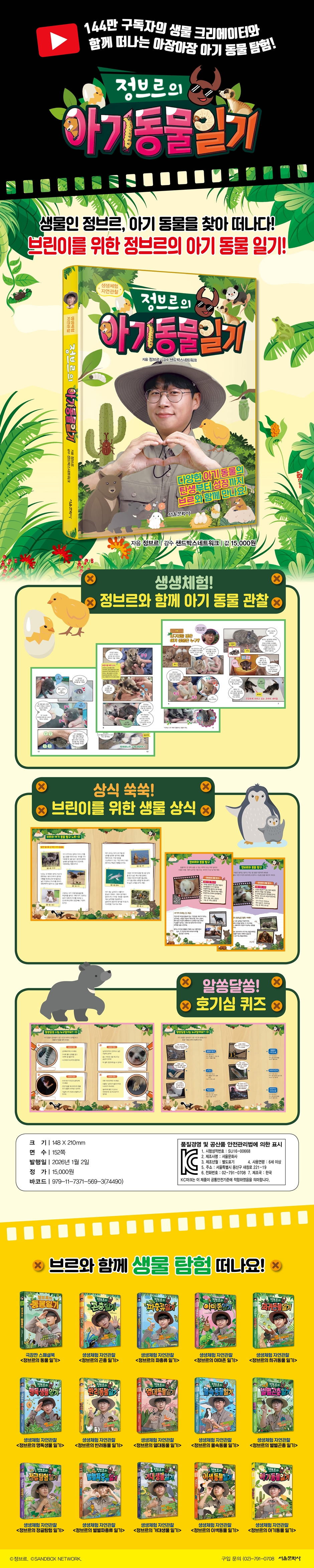 1화 너구리를 닮은 아기 동물은 누구? · 6 아장아장 귀여운 겨울잠쥐 · 14 2화 꼬물꼬물 귀여운 아기 미어캣 · 20 먹어도 먹어도 배고픈 아기 돼지 · 27 겁이 많은 아기 바위너구리 · 34 3화 브르도 반한 장난꾸러기 아기 곰 · 42 새끼 스컹크도 냄새가 날까? · 50 4화 작고 소중한 펭귄의 탄생 · 58 삐약삐약 알에서 나온 병아리들 · 64 [탐구] 브르의 아기 동물 탐구 노트② · 72 5화 희귀한 개구리의 번식 성공! · 74 엄마 등에서 태어나는 피파개구리 · 83 다트프록 올챙이는 어떻게 자랄까? · 89 6화 아빠 뱃속에서 자라는 새끼 해마 · 96 귀여운 흰동가리의 산란 일기 · 105 입안에 알을 품는 물고기가 있다? · 112 7화 브르의 장수풍뎅이 사육 방법 · 118 만지면 냄새가 나는 애벌레의 정체는? · 126 거미 알집을 구조하자! · 131 [퀴즈] 알쏭달쏭 나는 누구일까요? · 138 정답 · 142 |