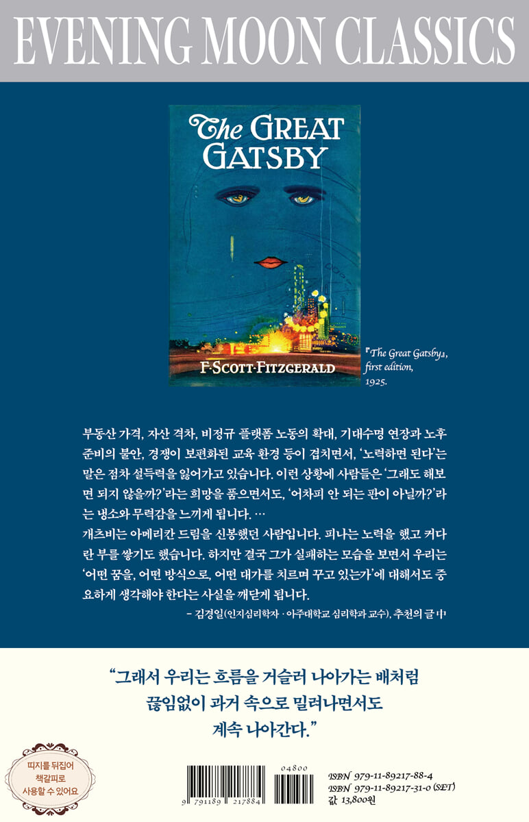 심리학자의 눈으로 고전을 읽다! 저녁달 클래식 시리즈의 네 번째 책, 『위대한 개츠비』가 출간되었다. 『김경일의 지혜로운 인간생활』 『열두 개의 달 시화집』 시리즈 등 다양한 도서로 독자들의 꾸준한 사랑을 받아온 저녁달 출판사에서 선보이는 고전 시리즈 〈저녁달 클래식〉은 전 세계 독자를 사로잡은 고전을 심리학자의 눈으로 새롭게 바라보고 풀어낸다. 『위대한 개츠비』는 F. 스콧 피츠제럴드의 대표작으로, 꿈과 사랑, 부와 욕망 속에서 흔들리는 인간의 내면과 사회적 허영을 섬세하게 그려낸 작품이다. ‘광란의 20년대’라 불리던 1920년대 미국의 화려한 겉모습과 그 이면의 공허함을 ‘개츠비’라는 인물의 비극적인 삶을 통해 드러낸다. 『위대한 개츠비』는 1925년 출간 이후 100년이 지난 지금까지도 시대와 언어와 문화를 초월하여 우리에게 ‘정체성’에 대한 근본적인 질문을 던지는 작품이다. 저녁달 클래식 시리즈에는 대한민국을 대표하는 심리학자 김경일 교수의 특별 해설이 수록되어 있다. 김경일 교수는 개츠비, 닉, 데이지 등 각 등장인물의 생각과 행동을 자기 불일치 이론, 리플리 증후군, 확증편향, 현실적 낙관주의 등의 심리학 개념을 통해 분석하여, 새로운 시각으로 고전 소설을 읽고 이해하며 사유하도록 돕는다. 이러한 김경일 교수의 해설은 소설의 이해를 돕는 동시에 책을 덮은 후에도 오래도록 사유하고 되새길 수 있도록 사색의 길을 열어줄 것이다. 모든 게 가짜인 시대에 진짜는 무엇인가? 한 남자를 비극으로 몰고 간 인간의 욕망과 허영 지나가버린 과거도, 오지 않은 미래도 아닌 ‘지금 여기의 나’를 성찰하게 하는 소설 『위대한 개츠비』 F. 스콧 피츠제럴드의 『위대한 개츠비』는 겉으로는 한 남자의 이야기처럼 읽히지만, 그 안에는 인간 욕망과 허영, 사랑과 상실을 꿰뚫는 심리적 통찰이 담겨 있다. 주인공 제이 개츠비는 과거의 사랑을 되찾기 위해 부와 권력, 환상을 동원하며 자신의 삶을 화려하게 꾸미지만, 그 내면에는 고독과 집착, 불안과 허무가 가득하다. 그는 화려한 파티와 웃음 속에서 사람들과 어울리지만, 진정으로 마음을 나누는 이는 없고, 이상과 현실 사이에서 끊임없이 흔들린다. 피츠제럴드는 이 작품을 통해 인간이 꿈과 욕망 뒤에 자신을 숨기는 이유를 보여주고, 사회적 위선과 허영 속에서 자신의 존재가 인정받지 못할 때 느끼는 고독과 소외를 날카롭게 그려낸다. 결국 개츠비의 결말은 단순한 개인의 몰락이 아니라, 인간 존재 자체에 대한 근본적인 질문이자, 이상과 현실의 간극 속에서 정체성을 상실한 현대인의 모습을 상징적으로 보여준다. 『위대한 개츠비』는 독자에게 묻는다. “당신은 지금, 어떤 초록빛을 바라보며 살고 있는가?” 짧지만 무겁게 다가오는 이 질문을 통해, 피츠제럴드는 인간의 욕망과 사랑, 허영과 허무, 사회적 소외가 뒤엉킨 삶의 진실을 끝까지 응시하게 한다. 그리고 그 안에서 우리는 우리 자신의 내면과, 현실과 이상 사이의 균열을 다시 돌아보게 될 것이다. |