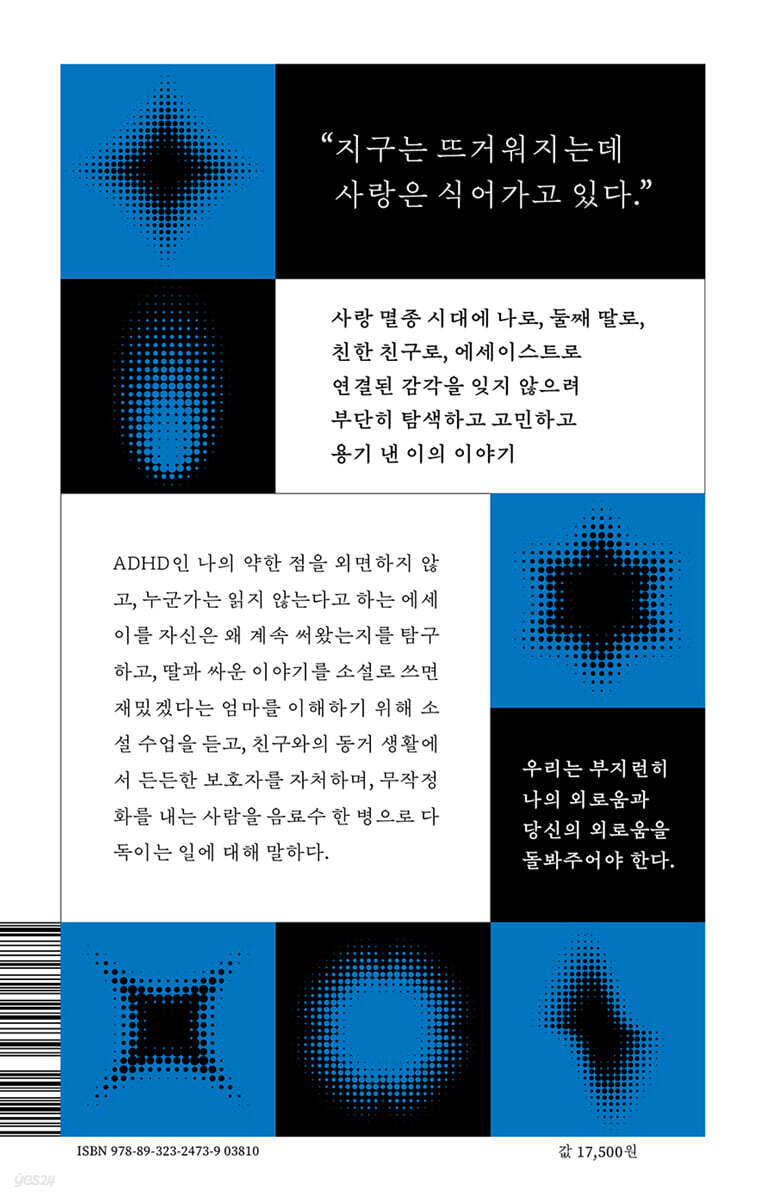 작가의 말 8 작가의 탄생 10 가장 좋아하는 걸 물으신다면 12 ADHD라서 다행이다 18 큰 그림 28 시인예찬 30 에세이 32 제2의 삶 48 학위와 자존심 사이 50 인생은 실전 52 역설 70 노후 계획 72 자기 객관화 74 넌 도대체 뭘 하니? 76 2장 증언 86 타이밍 88 이해하려면 관심이 필요하다 90 소설 같은 이야기 104 다정한 우정1: 나의 선경 110 손절당할 각오 122 사랑과 재즈 124 아무튼 언니 126 어떻게 내 사랑을 표현해야 할지 134 동거 프로포즈 146 나에게로 떠나는 여행 154 과도기 164 3장 다정한 우정2: 이게 우정이면 나는 친구 없어 168 가족애 판타지: 178 연휴 잘 보내세요: 186 한 지붕 아래 살고 한 밥상에서 밥 먹는 사이 192 악의는 없어 198 데미안 204 아보하 206 선의 평범성 212 사랑의 종말론 218 마치며 못말리는 사랑꾼으로부터 228 |