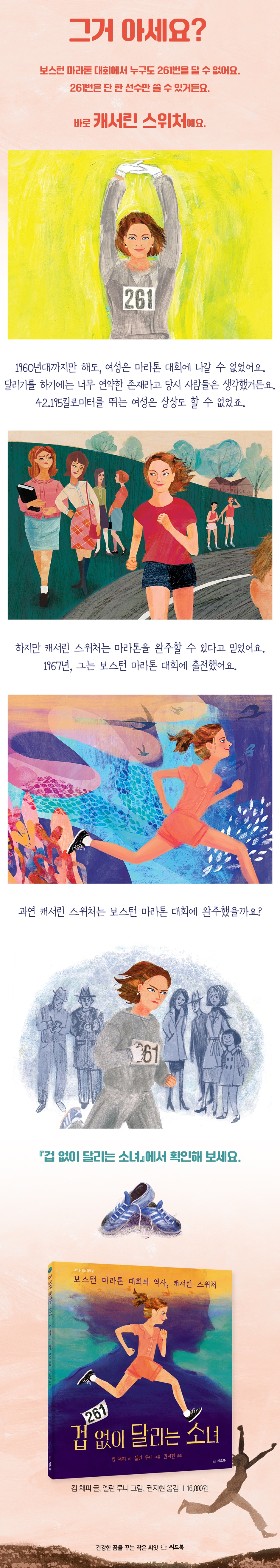 캐서린 스위처의 ‘무모한’ 도전기 보스턴 마라톤 대회는 전 세계 주요 마라톤 대회 중 하나예요. 마라톤 선수라면 이 대회에 뛰고 싶어 하죠. 그런데 알고 있나요? 보스턴 마라톤 대회에서 어떤 선수도 261번은 달 수 없어요. 261번은 영원히 단 한 명의 선수에게만 주어졌기 때문입니다. 바로 캐서린 스위처예요. 캐서린 스위처는 처음으로 보스턴 마라톤 대회를 완주한 여성 선수예요. 그 당시까지만 해도 여성은 마라톤을 하기에는 너무 연약한 존재라고 생각했어요. 그래서 달리기 하는 여성을 이상하게 바라보는 사람들도 많았어요. 캐서린 스위처의 이웃들처럼요. 캐서린 스위처는 ‘여성은 연약해서 마라톤을 할 수 없다’라는 편견에 맞서 마라톤 대회에 출전했어요. 때로는 스스로를 의심하기도 하고, 사람들의 부정적인 시선에 외롭기도 했죠. 대회 당일에는 대회 관계자의 방해를 받기도 했어요. 하지만 자신이 멈추지 않고 마라톤 코스를 완주한다면, 더 많은 여성이 마라톤 선수를 꿈꿀 수 있다 믿었어요. 캐서린 스위처의 이 ‘무모한’ 도전기는 자신만의 싸움이 아니었어요. 겁 없이 달렸던 소녀들과 겁 없이 달릴 소녀들에게 캐서린 이전에 비공식이지만 보스턴 마라톤 대회를 완주한 여성이 있었습니다. 바로 바비 깁입니다. 여성 참가가 제한됐던 1966년 이 선수는 참가 번호를 받지 않고 몰래 선수들 틈에 껴서 코스를 달렸어요. 어쩌면 캐서린 스위처의 도전에 바비 깁을 영향을 줬을 거예요. 이렇게 우리는 가지 않은 길을 먼저 달려간 이들 덕분에 용기를 얻어요. 보스턴 마라톤 대회에 출전하는 여성 선수 비율이 꾸준히 늘었고, 이제 누구도 여성 마라톤 선수가 신기하지 않은 세상이 됐죠. 이제 ‘여성은 할 수 없다’라는 장벽은 여기저기에서 허물어지고 있어요. 『겁 없이 달리는 소녀』는 캐서린 스위처의 이야기를 넘어 겁 없이 도전했던 모든 여성에게 바치는 헌사이며, 지금도 불평등과 차별에 맞서 싸우는 여성들에게 들려주는 응원가입니다. 차별과 편견이라는 바위는 단 한 번의 기적이 일어났을 때 아니라, 오랜 도전과 실패가 반복됐을 때 뚫린다 캐서린은 1967년 보스턴 마라톤 대회 이후로도 계속해서 마라톤 대회에 출전했어요. 그리고 러닝 클럽을 만들어 전 세계 모든 여성이 걷기와 달리기를 통해 자존감과 활력을 찾도록 돕고 있지요. 그리고 2017년, 그는 자신의 보스턴 마라톤 대회 참가 50주년을 기념하려고 다시 한번 보스턴 마라톤 대회에 나섰어요. 첫 보스턴 마라톤 대회에 참가했을 때처럼 많은 이들이 만류했어요. 이제 캐서린은 70대였거든요. 하지만 캐서린은 ‘노인은 마라톤 대회에 뛸 수 없다’는 또 하나의 편견에 맞서 달렸고, 결국 완주에 성공했어요. 그리고 그의 번호인 261번은 영구 결번이 됐지요. 캐서린이 전설적인 인물로 남았던 건, ‘최초’라는 수식어 때문이 아니었어요. 나와 다른 이들의 더 나은 삶을 위해 오랫동안 노력했고, 수많은 편견에 맞서 끝없이 도전했기 때문이에요. 편견과 차별이라는 커다란 바위는 단 한 번의 기적이 아니라 오랜 도전과 실패를 반복돼야 뚫을 수 있어요. 여러분을 가로막는 편견과 차별이 있다면, 부딪혀 보세요. 언젠가 그 편견과 차별은 반드시 무너질 거예요. 교과연계 국어 4-2 8. 생각하며 읽어요 국어 6-1 8. 인물의 삶을 찾아서 도덕 3 1. 나와 너, 우리 함께 도덕 5 6. 인권을 존중하며 함께 사는 우리 |