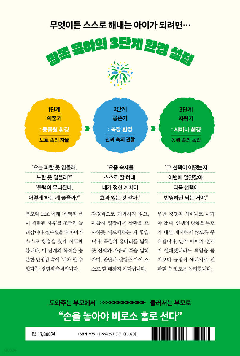 무관심보다 무서운 ‘성실한 부모’의 함정 아이가 준비물을 놓칠 때, 숙제를 미룰 때, 친구와 갈등이 생겼을 때, 부모로서 어떻게 해결하고 계신가요? 아이가 잊기 전에 미리 준비물을 챙기고, 숙제를 수시로 재촉하며, 친구와의 갈등을 중재하며 달래주지 않았나요? 부모는 성실히 역할을 수행했을 뿐인데, 아이러니하게도 이런 상황이 반복되면 아이는 부모의 해결과 지시를 기다리는 무력한 존재가 되어버립니다. 부모 자신도 모르게 아이의 자립심을 막아버린 것입니다. 어쩌면 아이의 자립을 막은 것은 무관심한 부모가 아니라, 너무 성실한 부모인지도 모릅니다. 아이가 어릴 땐 부모의 성실이 돌봄이고 도움이지만, 어느 순간 통제와 간섭이 되어버릴 수 있습니다. 시기에 맞지 않은 부모의 ‘과잉 성실’은 아이의 성장 반경을 넓히지 못하게 가로막는 장애물이 됩니다. 건강한 ‘독립’ 위해 ‘자립’은 필수! 환경 전환이 필요한 결정적 시기 이 책은 부모의 품 안에서 독립까지 아이가 순차적으로 자립할 수 있게 도와줍니다. 가장 중요한 것은 점진적으로 성장 단계에 맞는 육아 환경이 제공되어야 한다는 점입니다. 육아의 많은 문제는 이 3단계 환경이 어긋나는 데에서 비롯됩니다. 1) 동물원형 : 아무것도 하지 않아도 먹이를 받을 수 있지만, 자유가 없는 좁은 공간에서만 살아야 하는 환경 2) 목장형 : 낮에는 초원에서 자유롭게 행동하고, 밤에는 안전한 우리에서 잠자며 먹이를 얻는 환경 3) 사바나형 : 어디든 갈 수 있는 자유가 있지만, 스스로 위험에서 몸을 지켜야 하고, 물과 먹이를 찾아내며 살아가야 하는 환경 순차적 방목은 아이를 덜 통제하기 위한 체계적인 방법이라고 저자는 강조합니다. 이 3단계를 거치며 통제에서 신뢰로, 간섭에서 관찰로, 지시에서 질문으로 이행해야 하죠. 이러한 전환이 적절히 이루어질 때 비로소 건강한 방목이 가능합니다. 무작정 아이에게 완전한 자유를 주는 것이 아니라, 자유의 크기를 아이의 성숙도에 맞춰 점진적으로 확장해야 합니다. 무엇이든 스스로 해내는 아이가 되려면… 자립을 돕는 부모의 한마디와 작은 습관 부모가 아이의 자립을 돕고 싶다면, 거창한 교육 철학보다 매일의 말과 작은 습관이 훨씬 큰 영향을 줍니다. 1단계 동물원 환경(의존기)에서는 부모의 보호 아래 ‘선택의 폭이 제한된 자유’를 조금씩 늘려가야 합니다. “오늘 파란 옷 입을래, 노란 옷 입을래?” “블럭이 무너졌네. 어떻게 하는 게 좋을까?”처럼 질문하면 좋습니다. 2단계 목장 환경(공존기)에서는 감정적으로 개입하지 않고, 관찰자 입장에서 상황을 묘사하듯 피드백하는 게 좋습니다. “요즘 숙제를 스스로 잘하네. 네가 정한 계획이 효과 있는 것 같아.” 이렇게요. 3단계 사바나 환경(자립기)에서는 인생의 방향을 부모가 대신 제시하지 않도록 주의합니다. 만약 아이의 선택이 실패했더라도 책임을 묻기보다 긍정적 에너지로 전환할 수 있도록 독려합니다. “그 선택이 어땠는지 이번에 알았잖아. 다음 선택에 반영하면 되는 거야.” 하고 말해주면 좋습니다. 이 책은 뜬구름 잡는 교육 철학을 나열하지 않고, 부모가 이해하기 쉽고 실천하기 용이한 솔루션을 제공합니다. |