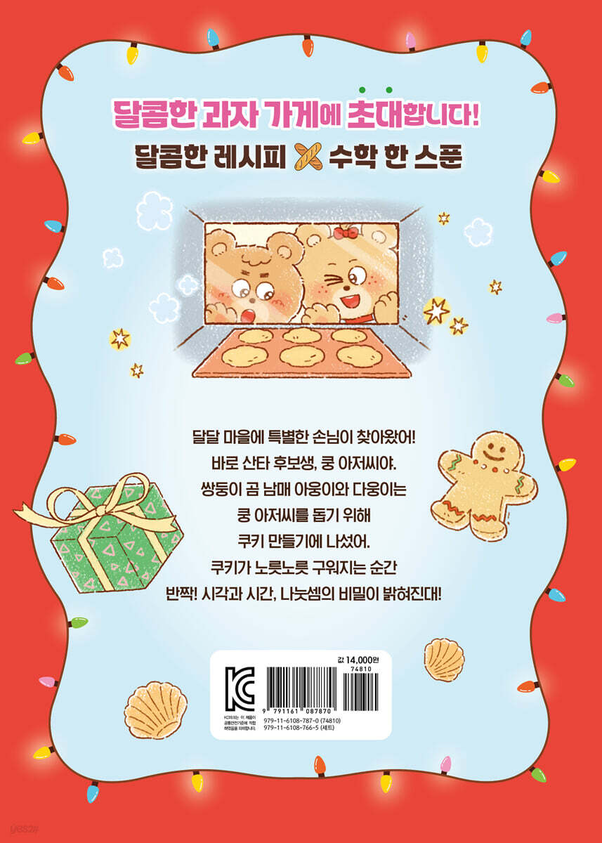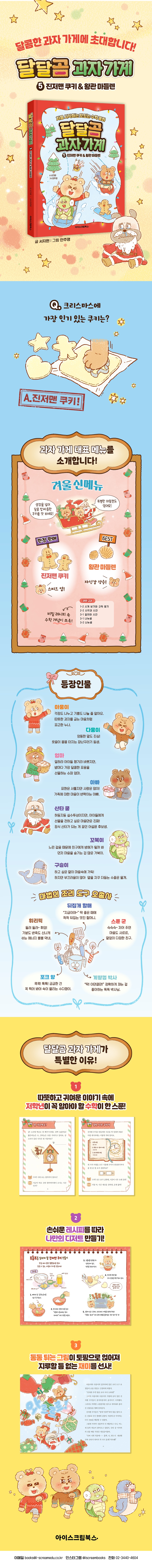 달달곰 과자 가게에 들러 보세요! 이 이야기의 배경인 달콤 마을에는 맛있기로 소문난 ‘달달곰 과자 가게’가 있어요. 마을 어귀부터 달콤하고 고소한 냄새가 퍼지면 ‘아, 달달곰이 문을 열었구나’ 하고 아침부터 손님들이 우르르 모여들어요. 예쁘고 맛있는 과자로 가득한 이 가게의 주인은 사랑스러운 곰 가족이에요. 한편 쌍둥이 곰 남매 아웅이와 다웅이는 엄마 아빠를 도와 오늘도 열심히 과자와 빵을 만드는데, 수학 개념을 녹인 다양한 레시피를 소개함으로써 독자들이 자연스럽게 수학 개념을 배울 수 있어요. 《달달곰 과자 가게 5》에서는 크리스마스이브 밤, 서툰 산타 후보생 ‘산타 쿵’과의 깜짝 만남이 펼쳐져요. 아웅이와 다웅이는 시간이 멈추고 되돌아가는 신비한 순간 속에서, 선물을 제때 배달해야 하는 산타 쿵을 돕게 되죠. 루돌프를 다시 달리게 할 마법의 ‘진저맨 쿠키’를 만들며 이야기는 더욱 달콤해집니다. 시각과 시간, 나눗셈의 개념이 자연스럽게 녹아든 모험 속에서, 아웅이와 다웅이는 함께하는 마음의 힘을 배워요. 과연 산타 쿵은 무사히 선물 배달을 마칠 수 있을까요? 그리고 매번 결정적인 순간에 나타나는 스푼 군, 포크 양, 뒤집개 할매, 휘리릭, 계량컵 박사까지! 조리 도구 요정 오총사는 이번엔 어떤 시간의 마법으로 모두를 도와줄까요? 이야기 곳곳에는 수학을 발견하는 재미가 숨어 있어요. 과자를 나누는 과정에서 분수를 이해하고, 양을 재고 순서를 정하며 자연스럽게 수의 의미를 익힐 수 있죠. 달콤한 이야기 속에서 수학을 경험하다 보면, 수학이 더 친근해지고 스스로 문제를 해결하는 힘도 쑥쑥 자라날 거예요. 이 책을 쓴 서지원 작가는 친근하게 접할 수 있는 동화를 통해 학생들이 자신도 모르는 사이에 수학 내용을 쉽게 이해할 수 있도록 도울 예정이며 특별한 레시피를 계속해서 만들어낼 계획이라고 합니다. 누구든지 부담 없이 읽을 수 있으며, 자연스럽게 여러 수학 개념과 성질을 이해할 수 있는 ‘달달곰 과자 가게’가 문을 열었으니, 달콤한 수학 동화를 맛보러 함께 가 볼까요? |