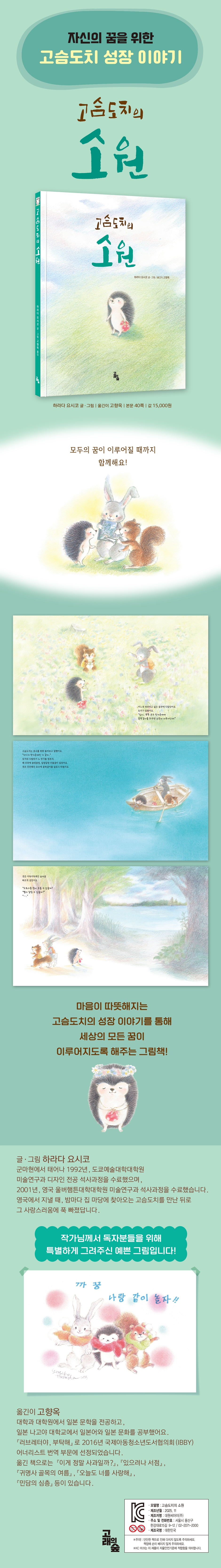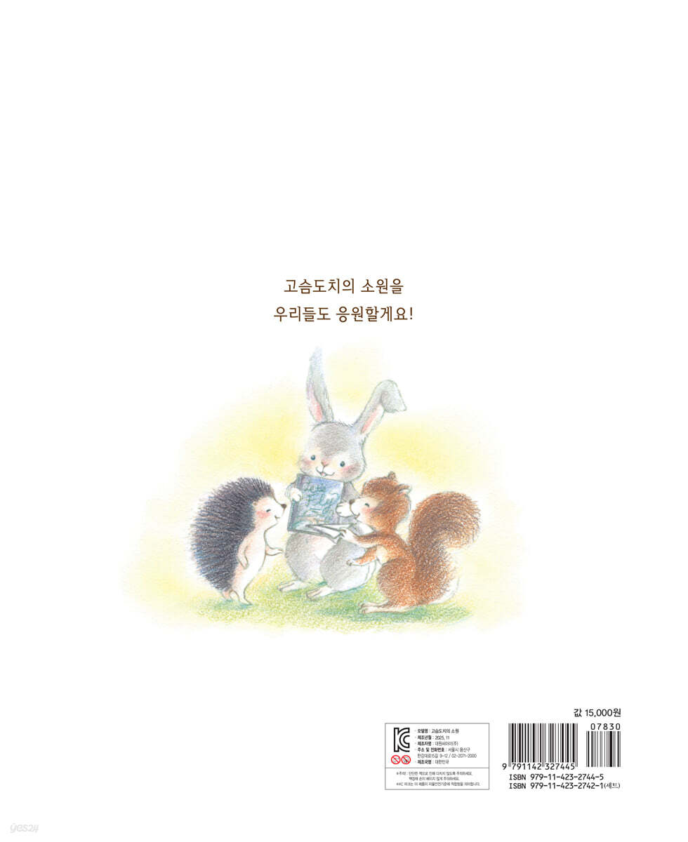 토끼는 더 빨리 달릴 수 있게 해달라고, 다람쥐는 더 많은 도토리를 모을 수 있게 해 달라고 말이죠. 그런데 고슴도치는 소원을 말하지 않았어요. 과연 고슴도치는 어떤 소원을 빌었을까요? |