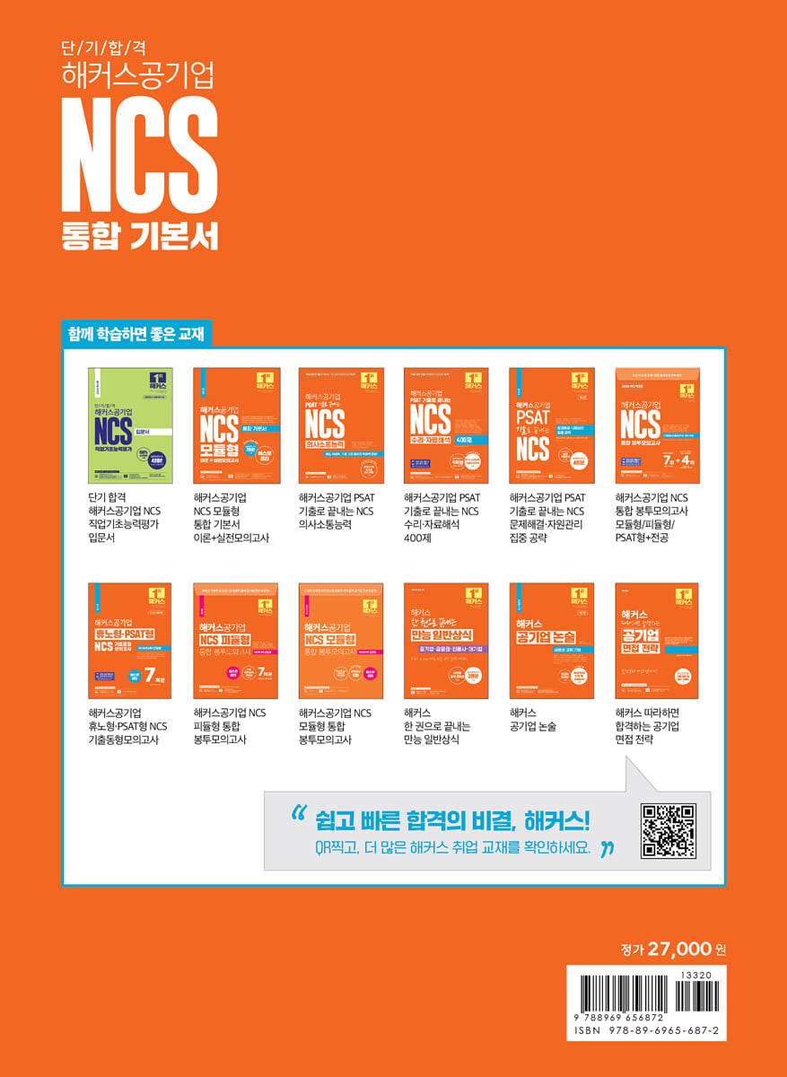 주간동아 2024 한국고객만족도 교육(온·오프라인 취업) 1위 기획재정부 시행 '공공기관 채용박람회' NCS 초청강사 집필! 공사 공단 및 금융권 필기 전형 대비 NCS 통합 기본서 [이런 분들에게 추천합니다] 1. 공사 공단 및 금융권 취업을 준비하는 분들 2. 모듈형, 피듈형, PSAT형 문제까지 NCS에 출제되는 기출 유형을 한 권으로 끝내고 싶은 분들 3. 이론 및 유형 학습부터 실전모의고사까지 NCS를 단 한 권으로 완벽하게 대비하고 싶은 분들 [해커스 교재만의 특장점] 1. 최신 출제 경향 및 기출 유형을 모두 반영한 이론과 문제로 실전에 완벽 대비! 1) 가장 최근 시행된 2025년 시험까지 포함하여 최신 공기업 NCS 출제 경향을 철저히 분석 및 반영하였습니다. 2) 기획재정부 시행 '공공기관 채용박람회'의 NCS 초청강사가 집필한 높은 적중률의 교재로, NCS 10개 영역에서 최근 자주 출제되는 36개 기출 유형을 엄선하여 수록했습니다. 2. 전략적이고 효율적 학습이 가능한 분권 구성! 영역별 중요도 및 학습 방법을 고려하여 [1권 필수과목](의사소통/수리/문제해결/자원관리), [2권 전략과목](자기개발/대인관계/정보/기술/조직이해/직업윤리), [3권 모의고사], [4권 해설집]으로 나누어 수록하여 전략적이고 효율적으로 학습할 수 있으며, 필요한 부분만 휴대하며 편리하게 학습할 수 있습니다. 3. [실력 점검 테스트&학습 가이드]와 [맞춤 학습 플랜]으로 전략적 학습 가능! 1) 본 학습 전 '실력 점검 테스트' 및 '학습 가이드'로 자신의 실력과 학습 방향을 파악할 수 있습니다. 2) 실전 감각 극대화(5일), 취약점 극복(10일), 기초 완성(20일)의 '맞춤 학습 플랜'으로 자신의 실력에 따라 학습 플랜을 선택하여 전략적으로 학습할 수 있습니다. 4. 핵심이론부터 실전모의고사까지 한 번에 끝! 체계적인 3단계 학습 시스템 1) 1단계: NCS 핵심이론 학습하기 ① 핵심이론정리 '직업기초능력 가이드북'의 방대한 내용 중 꼭 알아야 하는 내용만을 엄선하여 단기간에 영역별 핵심 개념 학습이 가능합니다. ② 실력플러스노트 '직업기초능력 가이드북'에는 나오지 않지만 시험 문제 풀이에 필요한 상식 및 공식을 정리하여 시험에 출제되지만 놓치기 쉬운 개념까지 한 번에 정리할 수 있습니다. 2) 2단계: 기출 유형별 전략 익히기 및 집중 문제 풀이 ① 대표기출유형 NCS 10개 영역별 최신 출제 경향 및 유형별 특징을 파악하고, 유형별 대응 전략을 익힐 수 있습니다. ② 적중예상문제 유형별 대응 전략을 실제 문제에 적용해보며 문제 풀이 실력을 키우고, 출제 가능성이 높은 문제를 미리 파악할 수 있습니다. ③ 고난도 PSAT형 문제 의사소통능력, 수리능력, 문제해결능력, 자원관리능력의 PSAT 기출 및 기출 변형 문제를 풀어보며 고난도 문제까지 철저히 대비할 수 있습니다. ④ 난이도별 문제 풀이 문제별 난이도 표시로 문제 풀이 후 본인의 실력을 정확히 파악하고 체계적이고 전략적으로 학습할 수 있습니다. 3) 3단계: 모의고사로 실전 감각 키우기 - '기출복원모의고사 1회분'과 '실전모의고사 4회분'을 제한시간 내 풀고 실제 시험처럼 교재 마지막에 수록된 'OMR 답안지'에 직접 답을 체크하며 실전 감각을 극대화할 수 있습니다. - 온라인에서 추가로 제공하는 'NCS 온라인 모의고사' 1회분으로 시험 전 최종 마무리를 할 수 있습니다. 5. 서류부터 인성검사, 면접까지 모든 채용 단계를 한 번에 대비! 1) NCS 채용 가이드 및 합격 가이드 NCS 채용 단계별 전략과 기업별 출제 유형 및 영역을 한 번에 확인할 수 있습니다. 2) 공기업 인성검사&면접 합격 가이드 인성검사 예시 문항과 기업별 면접 기출 질문을 PDF로 제공하여 인성검사와 면접 전형도 충분한 대비가 가능합니다. 6. 핵심적이고 컴팩트한 해설로 빠른 이해는 물론 학습 시간 단축까지! 1) 모든 문제에 핵심을 압축한 명료하고 이해하기 쉬운 해설을 제공하여 문제 풀이 실력을 단기간에 확실히 기를 수 있습니다. 2) 문제 풀이 시간을 단축시키는 '빠른 문제 풀이 Tip', 문제와 관련된 개념 및 이론을 심화 학습할 수 있는 '더 알아보기' 등 풍부한 학습 요소로 더욱 효율적으로 시험에 대비할 수 있습니다. 3) 표시된 문제별 유형을 통해 본인이 취약한 유형을 파악하고 관련 이론 및 문제를 복습하며 약점을 보완할 수 있습니다. 4) 모의고사 및 해설집에 수록된 '바로 채점 및 성적 분석 서비스' QR코드를 통해 간편하게 채점하고, 응시 인원 대비 자신의 성적 위치와 학습 방향을 확인할 수 있습니다. [NCS 단기 합격을 위한 해커스만의 추가 학습 콘텐츠 - 해커스잡(ejob.Hackers.com)] 1. 본 교재 인강(교재 내 할인쿠폰 수록) 2. 김소원의 수리능력 3초 풀이법 강의 3. 실력 점검 테스트 해설강의 4. NCS 온라인 모의고사 5. 가이드북에 없는 NCS 필수 암기 노트(PDF) 6. 초단기 완성 NCS 6개 영역 모듈 이론 요약 노트(PDF) 7. 공기업 인성검사&면접 합격 가이드(PDF) 8. 무료 바로 채점 및 성적 분석 서비스 |