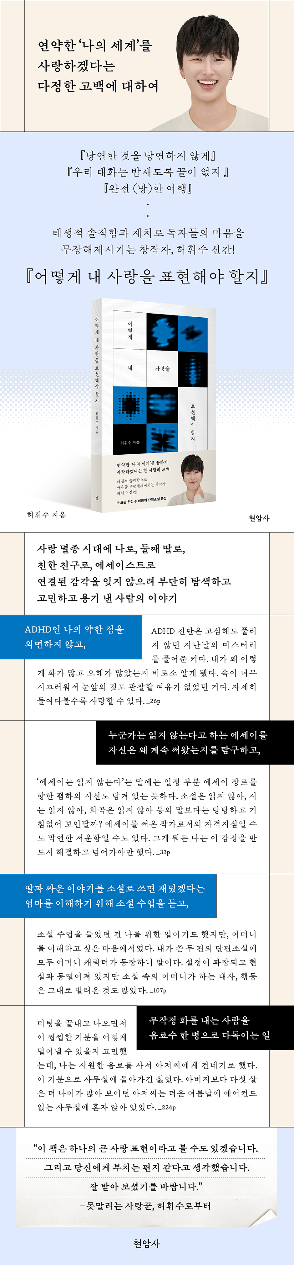 반드시 일정량의 시간이 필요하다 예전에 본 영화를 다시 볼 때 새롭게 보이는 장면들이 있다. 분명 같은 영화임에도 불구하고 그때는 미처 생각하지 못했던 것을 발견하게 된다. 어떤 시절도 마찬가지다. 지금 내가, 우리가 제각기 마주하고 있는 이 순간에도 다 알지 못하고 지나가는 게 있기 마련이다. 『구의 증명』에서는 뭐든 그 자리에서 속속들이 알고 싶어 하는 주인공을 두고 이런 문장이 나온다. “무언가를 알기 위해서 대답이나 설명보다 시간이 필요한 경우도 있다.” 이 문장은 우리 삶에 필연적으로 뒤늦게 깨닫고 마는 사실이 있다는 점을 드러낸다. 『어떻게 내 사랑을 표현해야 할지』는 이처럼 유년기부터 삼십 대까지 허휘수가 한 시절을 보내고 또 다른 시절들로 들어설 때마다 새로이 발견하고, 기억해 낸 지난 순간들에 관한 이야기다. 이를 통해 그는 아무리 노력해도 쉽게 이해하거나 해결할 수 없었던 일, 자신의 잦은 내적 방황, 타인과의 관계 그리고 사회와 세상에 대해 끊임없이 고민하던 시간은 나도 모르게 하나둘 쌓여 결국 저마다의 성장에 풍족한 밑거름이 된다는 메세지를 책에서 전하고 있다. 나를 사랑하라던가, 혹은 내 삶을 사랑하라는 말을 흔히 듣는다. 한 문장으로 제안하기는 쉽지만 당장 실천하기는 어려운 일이다. “현실은 자주 모호하고, 그 안에는 늘 감정의 동요가 있기 때문”이다. 즉, 연약할 수밖에 없는 이 세계를 인정하고 이해해야 하는데, 거기까지 가기가 쉽지 않다. 하지만 그 단계를 건너와야만 앞으로 나아갈 수 있고, 사랑할 수 있게 된다는 것을 우리는 매 순간 생각해야 한다. |