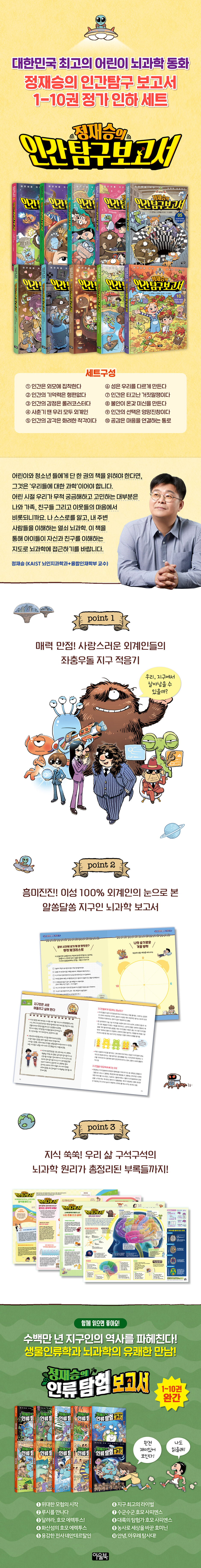 〈정재승의 인간 탐구 보고서〉 1~10권 세트 출간! 신비로운 인간의 뇌를 연구하는 정재승 교수의 지식교양 과학동화, 〈정재승의 인간 탐구 보고서〉가 1~10권 세트로 찾아왔습니다. 시리즈의 첫 시작이기도 한 1~10권에서는 지구라는 낯선 행성에 도착한 아우레 탐사대의 모습과 마침내 귀환 우주선에 오르기까지 펼쳐지는 흥미진진한 이야기가 담겨 있습니다. 외계인들은 어떻게 정체를 들키지 않고 지구에서 살아남을 수 있었을까요? 먼저 지구를 떠난 외계인은 과연 누구일까요? 70만 독자들의 마음을 사로잡은 〈정재승의 인간 탐구 보고서〉의 대망의 첫 출발. 외계인의 시선을 통해 인간을 알아가는 기쁨을 마음껏 누려 보시길 바랍니다. 인간을 탐구하기 위해 외계인들이 도착했다! 외계인의 눈에 비친 우리는 과연 어떤 모습일까? 머나먼 행성 아우레의 외계인들이 지구에 도착했습니다. 위기에 처한 행성을 버리고 새로운 행성으로 이주하기 위해서지요. 푸른 대지와 하늘로 뒤덮인 아름다운 행성, 지구를 발견한 외계인들은 지구인의 모습을 하고 인간을 알아보기 위해 지구에 잠입합니다. 외계인의 눈에 비친 지구인은 과연 어떤 모습일까요? 쉽게 화를 내고, 사소한 문제로 다투는 지구인들은 매우 비이성적으로 보입니다. 외모에 지나치게 집착해서 어리석은 판단을 내리고, 그 판단을 후회하면서 머리를 쥐어뜯기도 하지요. 하지만 동시에 인간은 이성과 감성을 조합해 아름다운 예술 작품을 만들어 내고, 빛나는 호기심을 간직한 채 우주를 향해 로켓을 쏘아 올리기도 합니다. 도무지 종잡을 수 없는 지구인들을 관찰하며, 외계인들은 신중하게 보고서를 작성합니다. 뇌과학과 함께 나와 세상을 이해하기 위한 질문들의 답을 찾아나가 보세요 〈정재승의 인간 탐구 보고서〉는 외계인의 눈으로 인간을 낯설게 바라봄으로써 우리들에 대한 이야기를 독자 여러분과 나누고자 합니다. 외계인에게 인간은 무척이나 이상하고 낯선 존재입니다. 모순으로 가득 찬 인간의 비밀을 풀기 위해 외계인들이 던지는 질문들은, 놀랍게도 우리가 스스로에게 던지는 질문들과 맞닿아 있습니다. 부모님의 잔소리는 왜 듣기 싫은지, 분명히 배웠는데 시험 때만 되면 기억이 안 나는 이유는 무엇인지, 좋아하는 여학생을 보면 오히려 괴롭히고 싶은 이상한 마음은 어디에서 오는지 말이에요. 뇌과학과 심리학은 이러한 인간의 마음을 탐구하여 우리에 대한 흥미로운 설명을 들려줍니다. 〈정재승의 인간 탐구 보고서〉에서 우리는 ‘마음의 과학’을 통해 나는 누구이며, 우리는 어떤 존재인지, 나와 세상을 이해하기 위해 꼭 필요한 질문들의 답을 찾아나갈 것입니다. 인간의 새로운 모습을 발견해 내는 외계인들의 여정에 함께해 보세요. 우리에 대한 이야기들은 또 다른 질문으로 이어져 나와 너, 세상을 더욱 폭넓게 이해하도록 도와줄 것입니다. |