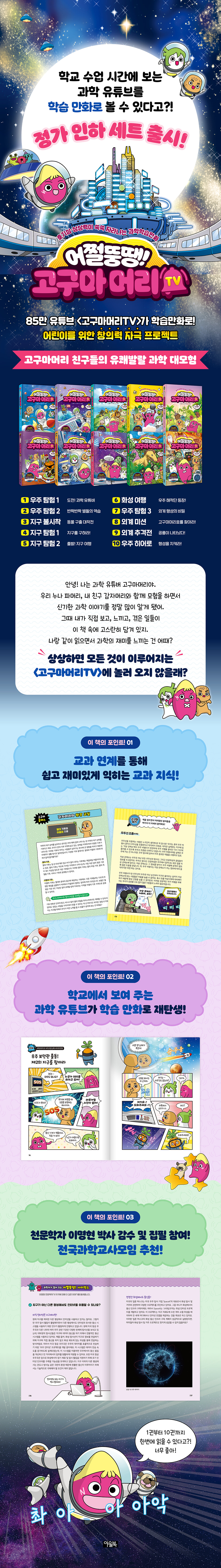 ‘어쩔뚱땡! 고구마머리TV’ 시리즈는 초등학교 수업 시간에 활용될 정도로 학습 효과가 보장된 유튜브 콘텐츠 기반의 도서입니다. 교사, 학생, 학부모 모두가 신뢰할 수 있는 콘텐츠를 도서 시리즈로 재탄생시켜 재미있게 지식을 쌓을 수 있도록 기획되었답니다. 외계 행성을 배경으로 인공위성, 소행성, 빙하기 등 지구 과학에 대한 주제뿐만 아니라 슈퍼컴퓨터, 와이파이, 드론 등의 과학 기술에 대한 주제를 포함한 다양한 초등 교과과정의 주요 교과 키워드들을 자연스럽게 학습할 수 있도록 설계되었습니다. 이와 함께 본문에 나온 지식을 재미있게 복습하는 특별 코너와 본문을 읽으며 알쏭달쏭 어려웠던 개념들을 차근차근 정리한 〈고구마위키〉까지! 알찬 내용으로 꽉 채운 ‘어쩔뚱땡! 고구마머리TV’ 시리즈를 만나보세요. ★ 천문학자 이명현 박사 감수 및 집필 참여! 검증된 과학 콘텐츠 ‘어쩔뚱땡! 고구마머리TV’ 시리즈는 최고의 과학 인플루언서들이 모인 ‘과학책방 갈다’와 함께합니다. 천문학자이자 ‘과학책방 갈다’의 대표 이명현 박사님이 감수와 함께 〈과학자가 읽어 주는 어쩔뚱땡! 사이언스〉 코너의 집필을 맡았답니다. 전문가의 참여로 더욱 알차고 풍성해진 고구마머리 탐험대의 이야기를 즐겨보세요. ★ 유튜브 〈고구마머리TV〉 개성 만점 캐릭터들이 궁금증 해결! ‘만약에?’ 고구마머리가 던진 질문에서 이야기가 시작됩니다. 엉뚱하지만 호기심만큼은 진심인 고구마머리와 각자 개성이 뚜렷한 채소머리 친구들이 모여 예상 밖으로 흘러가는 전개 속에서 웃다 보면 어느새 머릿속에 남는 과학 개념이 자연스럽게 남아요. 어려운 설명 대신 이야기로 이해하고, 문제 풀이보다 상황 속에서 깨닫는 과학. 한 권이 끝나면 다음 이야기가 궁금해집니다. 웃음과 캐릭터, 과학 학습을 한 번에 담은 ‘어쩔뚱땡! 고구마머리TV’ 시리즈로 과학 공부를 시작해 보세요. |