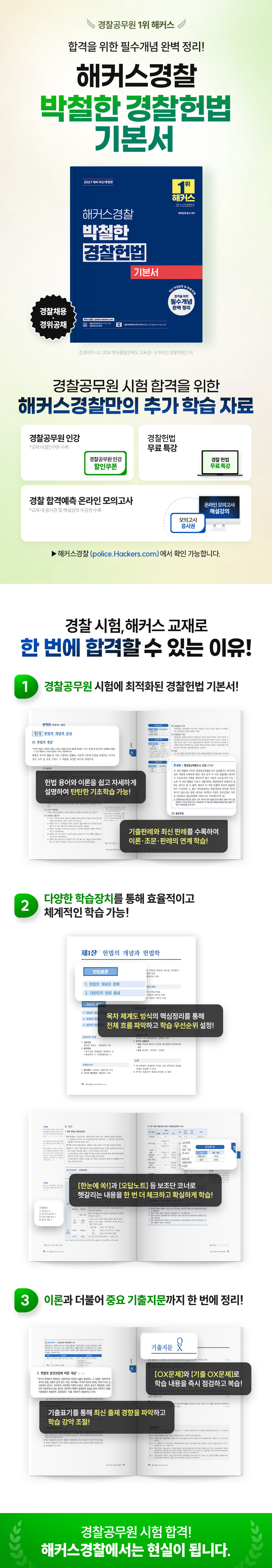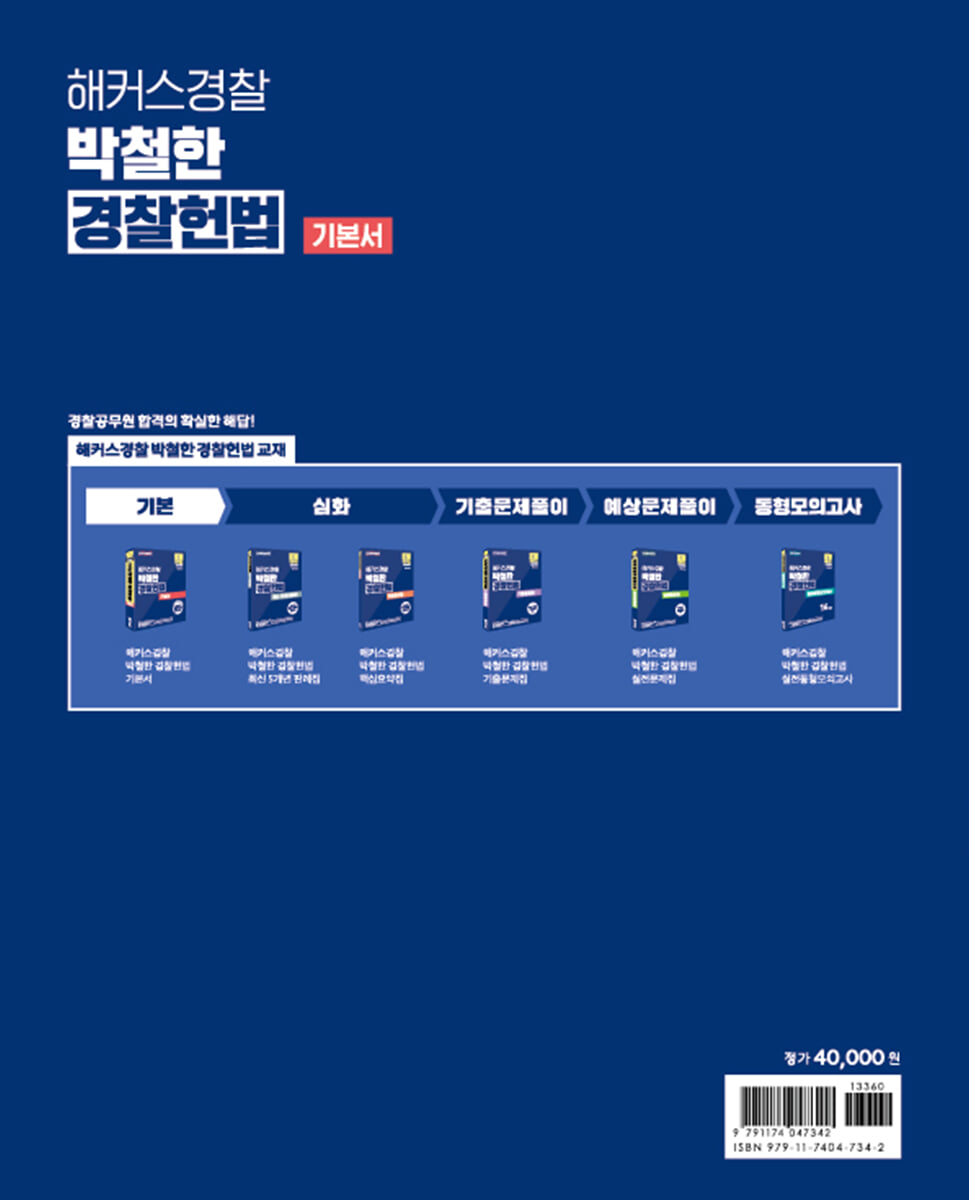 1. 경찰공무원 시험에 최적화된 경찰헌법 기본서 1) 낯설고 추상적인 헌법 용어와 이론을 쉽고 자세하게 설명하여 이해를 통한 탄탄한 기초학습이 가능합니다. 2) 이론의 흐름에 따라 중요한 기출판례와 최신판례를 수록하여 이론, 조문, 판례의 연계학습이 가능합니다. 2. 다양한 학습장치를 통해 효율적이고 체계적인 학습 가능 1) 목차 체계도 방식의 핵심정리를 통해 해당 이론의 전체적인 흐름을 파악하고 학습의 우선순위를 설정할 수 있습니다. 2) 헷갈리거나 비교ㆍ정리가 필요한 내용은 보조단의 ‘한눈에 쏙!’, ‘오답노트’ 등의 코너를 통해 한 번 더 체크하여 확실한 학습이 가능합니다. 3. 이론과 더불어 중요 기출지문까지 한 번에 정리 1) 기출표기를 통해 최신 출제 경향을 파악함과 동시에 자주 출제되는 중요한 부분을 체크하여 학습의 강약을 조절할 수 있습니다. 2) 이론 옆 보조단의 OX문제와 각 단원의 마지막에 구성된 ‘기출 OX문제’를 통해 학습한 내용을 바로 점검하고 복습할 수 있습니다. |