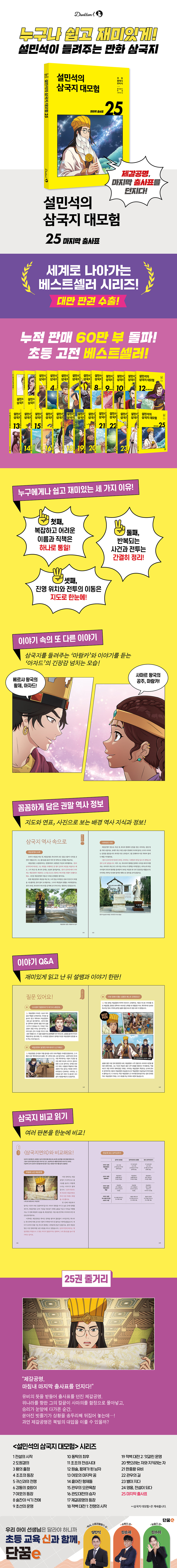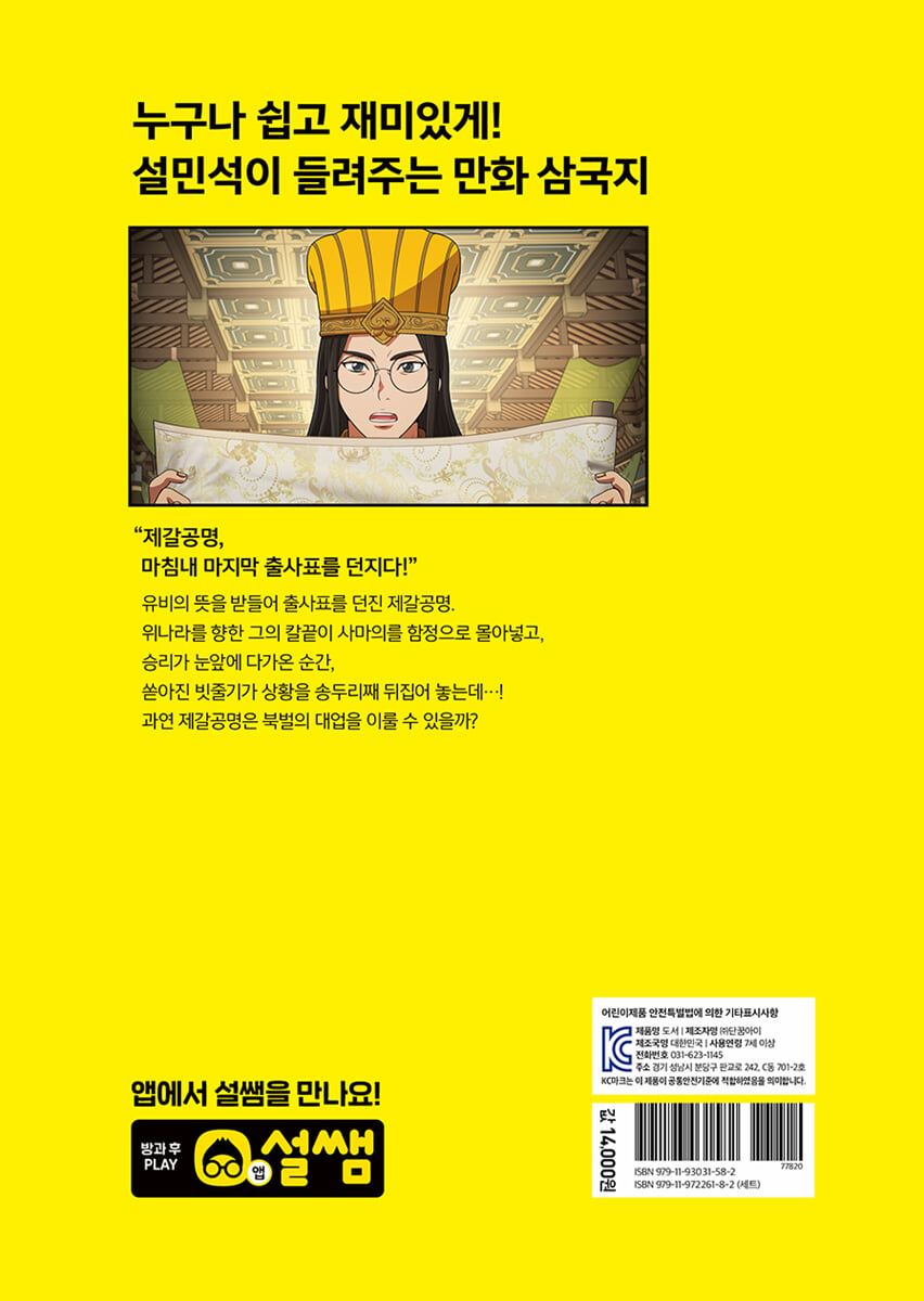 삼국지를 난생처음 읽는 독자를 위해, 방대한 내용을 핵심적으로 담았습니다. 복잡한 이름, 반복되는 사건은 간결하게 정리하여 삼국지를 그 누구보다 쉽고 재미있게 설민석 선생님이 들려드립니다. 2. 눈길을 사로잡는 색다른 그림 웹툰 명가 ‘재담미디어’ 산하의 ‘스튜디오 담’이 각색과 작화에 참여하여, 새로운 스타일의 만화 〈설민석의 삼국지 대모험〉이 탄생했습니다. 생동감 넘치는 캐릭터와 그림이 요즘 어린이의 눈길을 사로잡습니다. 3. 놀라운 상상력으로 탄생한 새로운 인물 ‘유비, 관우, 장비’ 같은 영웅뿐만 아니라, 삼국 시대를 살았던 평범한 사람들이 이름을 가지고 등장합니다. 상상력으로 탄생한 새로운 인물을 지켜보며 이야기에 더욱 공감하고 몰입해 보세요. 4. 이야기 속의 또 다른 이야기! 삼국지 이야기를 실감 나게 들려주는 ‘마람카’, 그 이야기에 점점 빠져드는 어린 황제 ‘아자드’! 마람카와 아자드에게 무슨 일이 벌어지고 있는 걸까요? 두 사람의 긴장감 넘치는 이야기는 또 다른 기대를 불러일으킵니다. 5. 꼼꼼하게 담은 권말 역사 정보 삼국지의 배경이 되는 실제 인물과 사건 등 배경지식과 정보를 꼼꼼하고 정확하게 담았습니다. 〈삼국지연의〉와 비교하여 이 책에서만 볼 수 있는 이야기도 만날 수 있습니다. 또한 〈정사 삼국지〉 내용까지 간략하게 비교한 표를 수록하여, 방대한 내용의 삼국지 정보를 한눈에 볼 수 있습니다. |