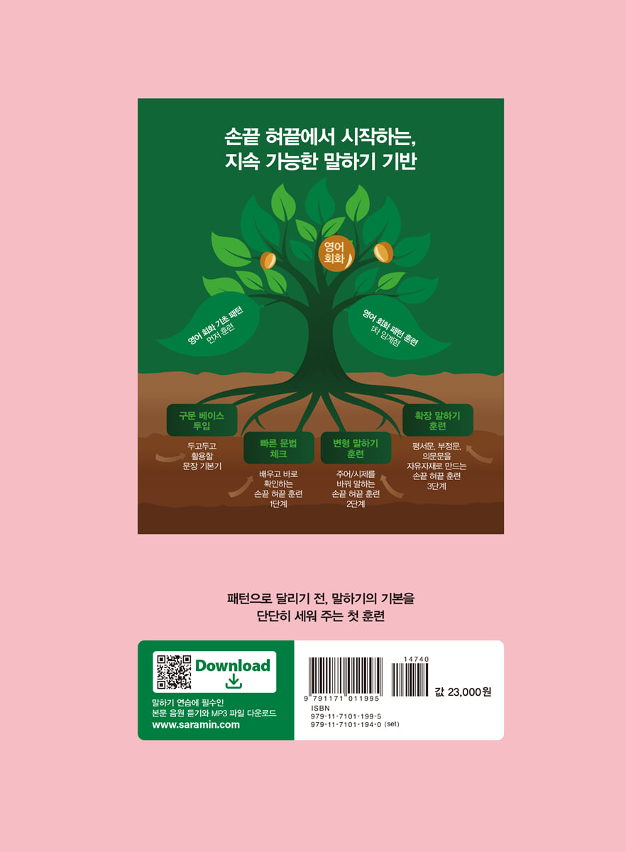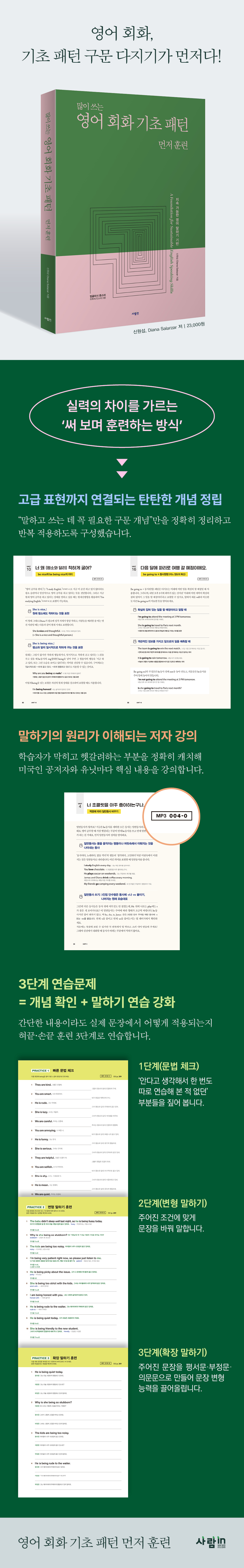 문장에는 평서문·부정문·의문문이 있고, 주어가 바뀌면 대명사도 바뀌고, 주어에 맞게 동사의 형태가 달라진다는 사실은, 많은 학습자가 이론적으로 알고 있다. 그러나 실제 말하기에서 이러한 기본 요소를 막힘없이 운용하는 일은 쉽지 않다. 패턴으로 말문을 여는 속도는 빨라질 수 있지만, 기초 구문이 받쳐 주지 않으면, 말하기 실력은 쉽게 정체된다. 〈영어 회화 기초 패턴 먼저 훈련〉은 기본 구문 특훈으로 패턴 학습의 효과를 극대화한다. 탄탄한 개념 정립 저자는 학습 과정에서 “말하고 쓰는 데 꼭 필요한 개념”만을 선별해 책에 담았다. 많은 내용을 한꺼번에 던지기보다, 핵심 개념을 정확히 정리하고 반복 적용하도록 구성해 지속 가능한 학습과 응용을 돕는다. 말하기의 원리가 이해되는 저자 강의 영어가 어려웠던 경험이 있는 저자는 학습자가 어디서 막히고 헷갈리는지 잘 알고 있다. 미국인 공저자와 유닛마다 핵심 내용을 강의했고, 두 사람의 유쾌한 설명을 따라가다 보면 ‘이 정도면 나도 할 수 있겠다’라는 자신감이 쌓이도록 설계했다. 3단계 연습문제 = 개념 확인 + 말하기 연습 강화 영어는 눈으로 보는 것만으로는 충분하지 않다. 입으로 말하고 손으로 써 봐야 하는데, 저자는 이를 ‘혀끝·손끝 훈련’이라 부른다. 아무리 간단한 내용이라도 실제 문장에서 어떻게 적용되는지 3단계에 걸쳐 훈련한다. 1단계(문법 체크) 앞서 배운 문법 요소를 즉시 적용하며 몸에 익힌다. ‘안다고 생각해서 한 번도 따로 연습해 본 적 없던’ 부분들을 점검한다. 2단계(변형 말하기) 지시 내용에 맞게 문장을 바꿔 말한다. 주로 시제와 주어를 바꿔서 말하는 것으로, 과거 시제를 미래 시제로, 1인칭 주어를 3인칭 단·복수로 바꿔 보기도 한다. 이 과정에서 대명사 및 단·복수 변화까지 반복 훈련한다. 3단계(확장 말하기) 주어진 문장을 의사소통의 핵심인 평서문·부정문·의문문으로 만들어 보는 훈련으로 문장 변형 능력을 끌어올린다. 처음에는 낯설 수 있지만, 반복할수록 문장 말하기에 빠르게 익숙해진다. |