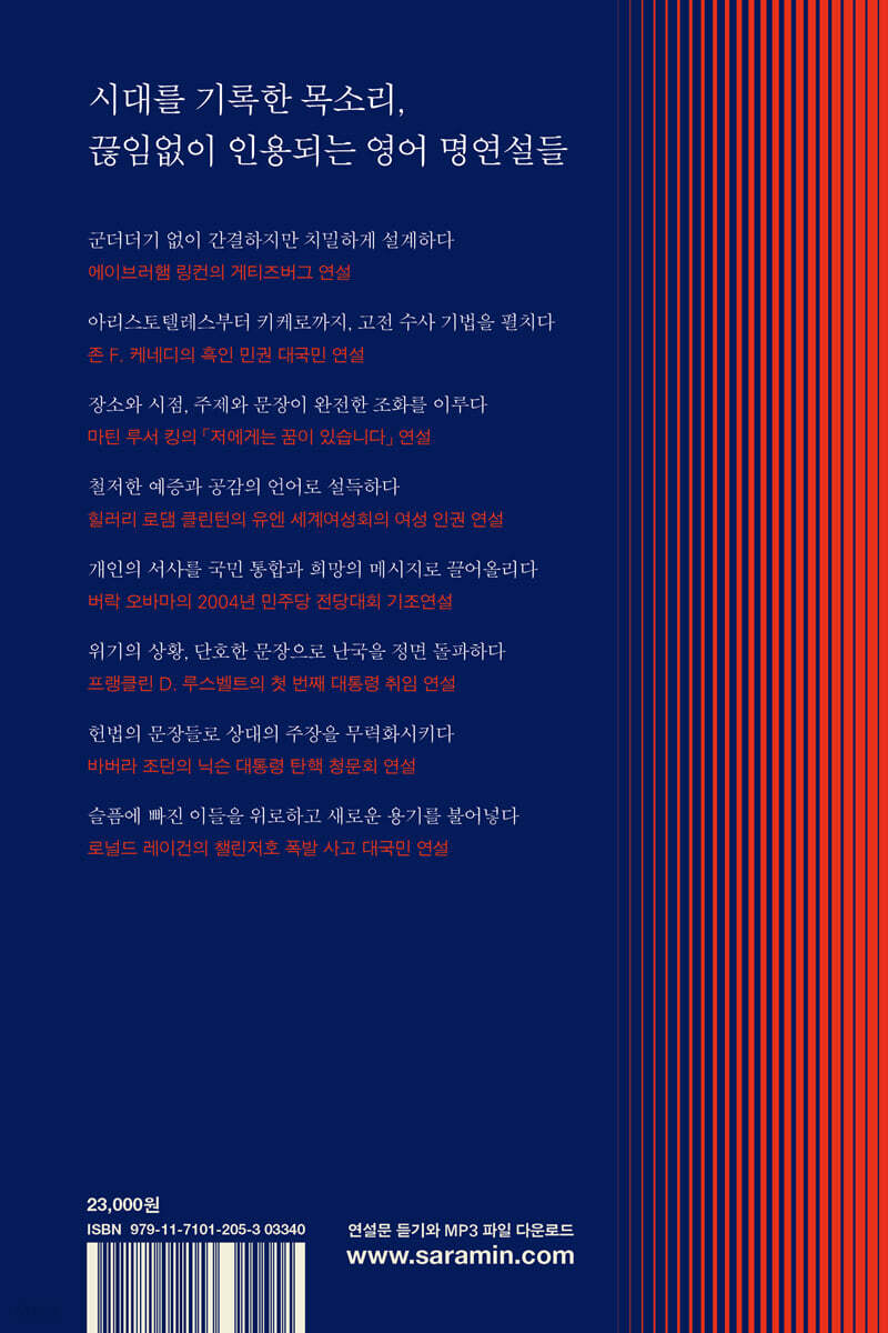 최고의 지성들이 엮은 설득의 수사 선언, 공표, 천명, 환기, 촉구, 호소, 위로, 그리고 설득. 연설자의 의도는 연설문 속 텍스트에 그대로 녹아 있습니다. 메시지를 확실히 전하면서 청중의 공감을 얻고 설득하기 위해 최고의 지성들이 다듬은 문장이 있습니다. 정확한 단어 선택, 오류 없는 문장, 곳곳에 숨겨진 수사학적 장치, 단락과 단락 사이의 체계적인 연결성이 모여 하나의 작품이 된 명연설문을 읽고 영어의 품격을 느껴 보세요. 위기 앞에 선 리더들의 설득의 역사 국가의 위기와 역사적 전환의 순간에 미국 정치사의 리더들이 보낸 메시지를 역사적 배경과 함께 확인할 수 있습니다. 그 과정에서 민주주의가 추상적으로만 존재하는 체제가 아니라, 말과 설득을 통해 실제 작동되며, 국가의 민주주의적 이상이 세계 공통의 인권 의식으로 확장되는 역사적 흐름을 배울 수 있습니다. 연설 원문을 낭독하면서 느끼는 감동 명연설문 원문을 영한 대역으로 수록하고, 분명한 의미 전달과 낭독 시의 호흡, 실제 연설자가 강조하는 순간을 반영해, 낭독에 최적화된 끊어 읽기 표시를 함께 제공합니다. 한 단어씩 또박또박 끊어 읽어야 할 부분과, 긴 문장을 한 호흡으로 밀어내야 할 부분을 내 목소리로 낭독하면, 명연설이 지닌 설득의 힘과 울림을 한층 더 생생하게 느낄 수 있습니다. 영어 원문을 낭독하며 우리말 번역과 비교해 보는 방식 역시 효과적인 접근이 될 것입니다. |