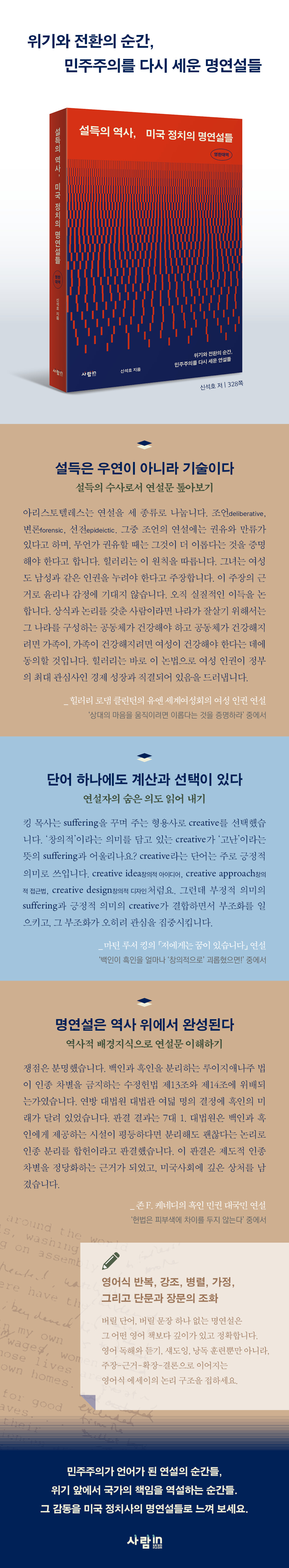 And I am not going to sit here and be an idle spectator to the diminution, the subversion, the destruction, of the Constitution. 저는 헌법을 전적으로 신뢰합니다. 그 믿음은 완전하고, 절대적입니다. 이에 저는 헌법을, 축소하거나, 뒤엎거나, 파괴하려는 시도를 가만히 보고만 있지 않을 것입니다. --- 「바버라 조던의 닉슨 대통령 탄핵 청문회 연설」 중에서 마틴 루서 킹의 「저에게는 꿈이 있습니다」 연설 상대의 행동을 바꾸려면 상대의 머리가 아닌 마음을 움직여야 합니다. 킹 목사의 연설에는 정치인들이 자주 사용하는 통계 자료 같은 건 없습니다. 청중이 직관적으로 이해할 수 있는 비유가 있을 뿐입니다. 어음을 현금으로 되찾기 위해, 즉 맡겨 두었던 자유를 되찾기 위해 이곳에 모였다고 외치며 청중의 공감을 끌어냅니다. 이로써 청중은 당연한 권리를 찾으러 모인 한 무리의 동지가 됩니다. --- 「비유로 청중의 공감을 끌어내다」 중에서 존 F. 케네디의 흑인 민권 대국민 연설 역사학자 칼 브라우어는 케네디의 이 연설을 ‘결단력 있는 대통령으로 보이고자 한 의지의 표현’으로 해석합니다. 미국 내 흑인 민권 문제가 국제적 비판으로 번지고 자신의 리더십이 추락할 것을 우려했다는 것이죠. 케네디는 이 시점까지 거의 쓰지 않았던 일인칭 주어 I를 연속적으로 사용합니다. 이는 ‘행동하는 것이 옳다’는 전제에 따라 행동을 취하는 동사 앞에 I를 반복해서 배치함으로써 자신이 행동하는 대통령임을 드러내는 전략적 선택입니다. --- 「의회가 행동할 것을 촉구하다」 중에서 에이브러햄 링컨의 게티즈버그 연설 우리는 흔히 문장이나 단어 하나하나에 집중하느라 문장들이 서로 연결되는 방식을 놓치기 쉽습니다. 나무만 보다 보면 전체 숲의 모습은 보이지 않을 수 있습니다. 잠시 거리를 두고 연설문 전체를 조망해 보면 링컨의 글은 단순한 문장들의 집합이 아니라 치밀하게 구성된 하나의 구조물처럼 다가옵니다. 겉보기에 접속어는 드러나지 않지만, 단어 선택과 배열 방식에서 문장들을 정교하게 연결하려는 전략이 엿보입니다. 이런 구조를 보면 링컨이 이 연설을 얼마나 치밀하게 설계했는지 짐작할 수 있습니다. --- 「전사자, 순교자가 되다」 중에서 힐러리 로댐 클린턴의 유엔 세계여성회의 여성 인권 연설 여성 참정권은 단순히 투표권을 쟁취하는 문제가 아니었습니다. 수 천 년 동안 이어져 온 ‘여성은 남성보다 열등하다’라는 철학적 전제를 뒤엎는 일이었기에, 엄청난 분열을 불러올 수밖에 없었습니다. 문자 그대로 the most divisive philosophical war라는 표현이 결코 과장이 아니었던 것입니다. --- 「가장 큰 분열을 초래한 철학적 투쟁」 중에서 버락 오바마의 2004년 민주당 전당대회 기조연설 키케로는 연설자가 청중의 감정을 자극하고 신뢰를 획득하는 능력을 연설의 필수 요소로 꼽습니다. 그리고 아리스토텔레스는 수사학에서 감정(파토스)을 자극하여 설득을 이끌어 내려면 그 주장을 생생하게 묘사해야 한다고 말합니다. 오바마는 바로 이 고전 수사학의 원칙을 실천합니다. --- 「명백한 논거를 제시하다」 중에서 |