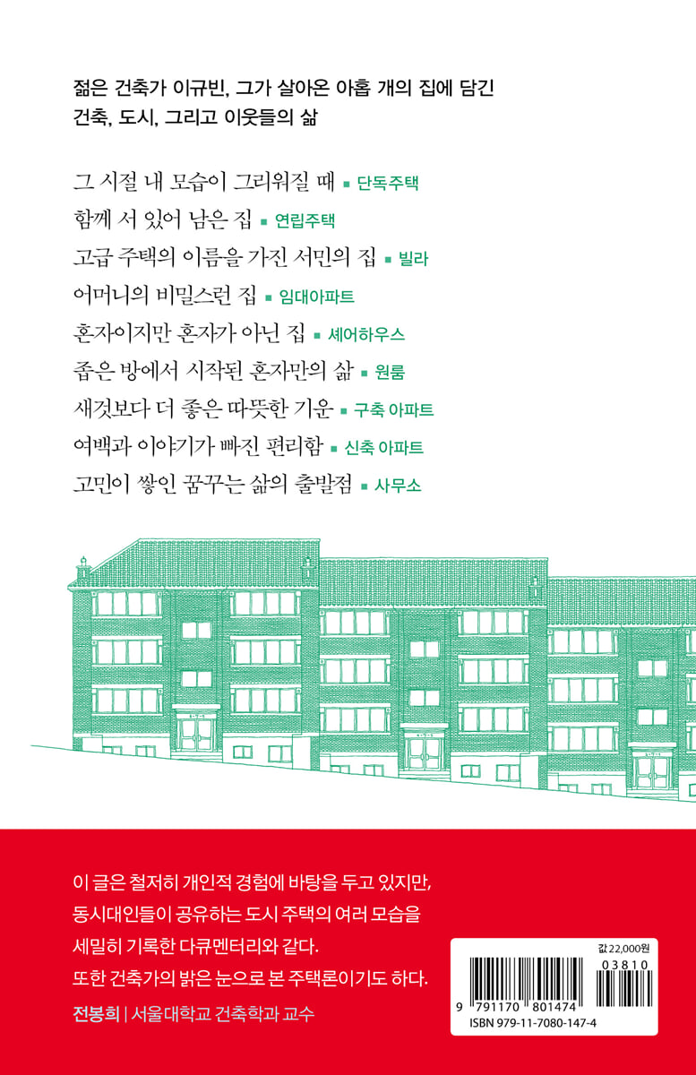 첫번째 집 ■ 단독주택 _ 그 시절 내 모습이 그리워질 때 아파트 대신 집장사 집을 _단독주택 / 한국적 노스탤지어의 공간 _마당 / 노란장판에서 원목마루까지 _바닥 / 종이 위에 새겨진 삶의 흔적 _벽지 / 기술의 발전이 허락한 낭만의 공간 _옥상 두번째 집 ■ 연립주택 _ 함께 서 있어 남은 집 함께 서 있어 남은 집 _연립주택 / 필요에서 필수로 _엘리베이터 / 낮은 천장과 높은 변기의 사연 _화장실 / 집과 도시가 공존하는 방법 _단지 세번째 집 ■ 빌라 _ 고급 주택의 이름을 가진 서민의 집 고급 주택의 이름을 가진 서민의 집 _빌라 / 빼앗긴 아이들의 놀이터 _골목 / 울도 담도 없는 집에 놀러 오는 것은 _담장 / 모두의, 그러나 누구의 소유도 아닌 _계단실 / 유행과 오해 사이 _드라이비트 네번째 집 ■ 임대아파트 _ 어머니의 비밀스런 집 사기 위한 것에서 살기 위한 곳으로 _임대아파트 / 숨길수록 더욱 가까워지는 공간 _지하주차장 / 남이 나를 보는 틀 _창문 / 주택법이 만든 삶의 희망 _경로당 / 떠날 사람을 위한 방 _문간방 다섯번째 집 ■ 셰어하우스 _ 혼자이지만 혼자가 아닌 집 혼자이지만 혼자가 아닌 집 _셰어하우스 / 우연과 비용이 정한 이웃 _옆방 / 선택되어지는 유일한 취향 _이케아 / 열린 문 너머로 이어지는 삶 _냉장고 / 식구가 되는 공간 _식탁 여섯번째 집 ■ 원룸 _ 좁은 방에서 시작된 혼자만의 삶 좁은 방에서 시작된 혼자만의 삶 _원룸 / 불완전한 삶과 사회가 만든 공간 _반지하 / 소리를 넘어 이어지는 존재들 _벽 / 집을 대신하는 도시의 공간 _근린생활시설 / 계절과 생활이 남긴 흔적 _곰팡이 일곱번째 집 ■ 구축 아파트 _ 새것보다 더 좋은 따뜻한 기운 현실과 이상 사이에서 _구축아파트 / 고립된 섬, 새로운 동네의 발견 _동네 / 삶과 사람이 스치는 공간 _복도 / 도시의 거실, 모두의 마당 _한강 / 윗집과 아랫집의 불편한 동거 _천장 여덟번째 집 ■ 신축 아파트 _ 여백과 이야기가 빠진 편리함 신도시 키즈와 도시의 미래 _신축아파트 / 1초 출근, 직주근접의 삶 _별채 / 신발장에서 도킹스테이션까지 _현관 / 아파트에 발코니를 허하라 _발코니 / 가장 도시적인 삶에서 얻은 자연의 가르침 텃밭 _텃밭 아홉번째 집 ■ 사무소 _ 고민이 쌓인 꿈꾸는 삶의 출발점 나를 지은 집에서 지어야 할 집으로 _사무실 / 손끝으로 경험하는 책과 공간 _책의 집_도서관 / 터널을 닮은 건축 _회사의 집_사옥 / ‘숲’과 ‘멍’ 사이의 ‘집’ _반려견의 집_스테이 / ‘불쾌한 골짜기’를 넘어서 _인공지능의 집_리모델링 에필로그 _열번째 집을 기다리며 추천글 | 집의 기억, 개인적인 혹은 집단적인 _서울대학교 건축학과 전봉희 교수 |