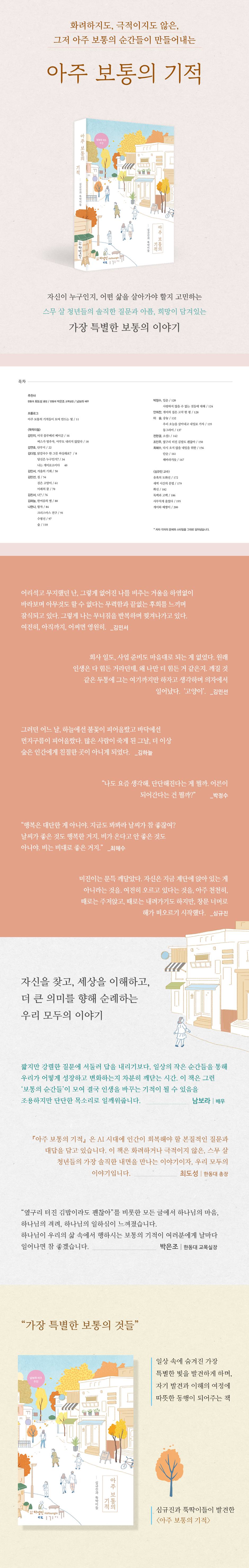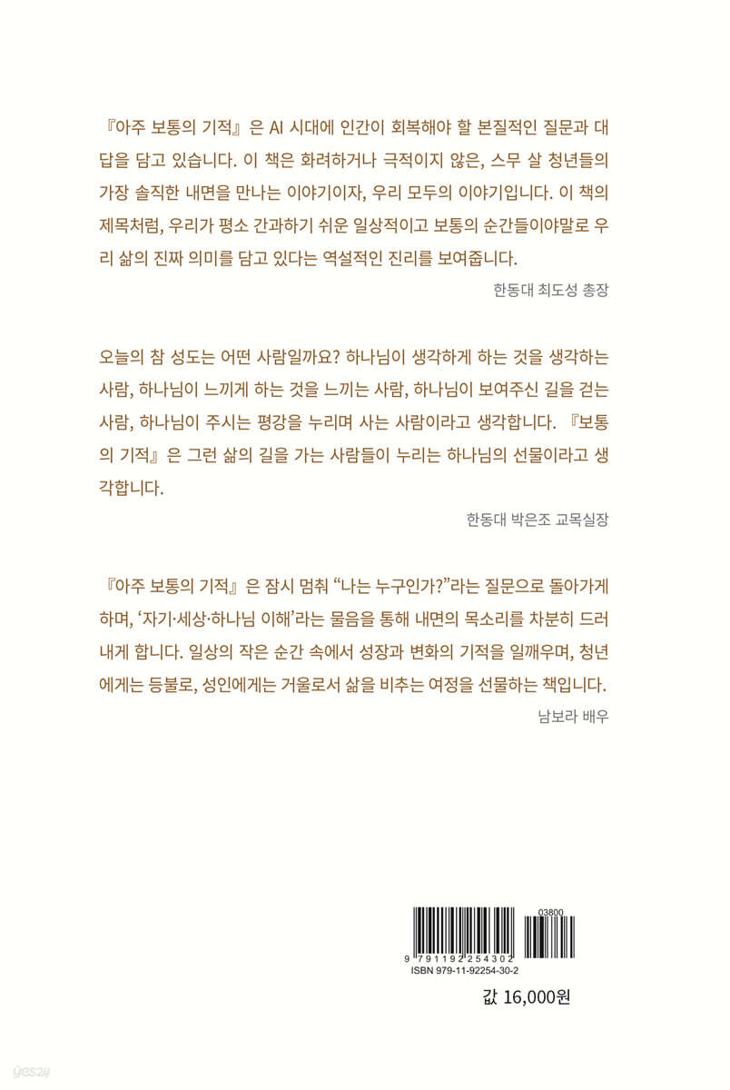『아주 보통의 기적』은 AI 시대에 인간이 회복해야 할 본질 적인 질문과 대답을 담고 있습니다. 이 책은 화려하거나 극적 이지 않은, 스무 살 청년들의 가장 솔직한 내면을 만나는 이야 기이자, 우리 모두의 이야기입니다. 이 책의 제목처럼, 우리가 평소 간과하기 쉬운 일상적이고 보통의 순간들이야말로 우리 삶의 진짜 의미를 담고 있다는 역설적인 진리를 보여줍니다. - 최도성 (한동대 총장)