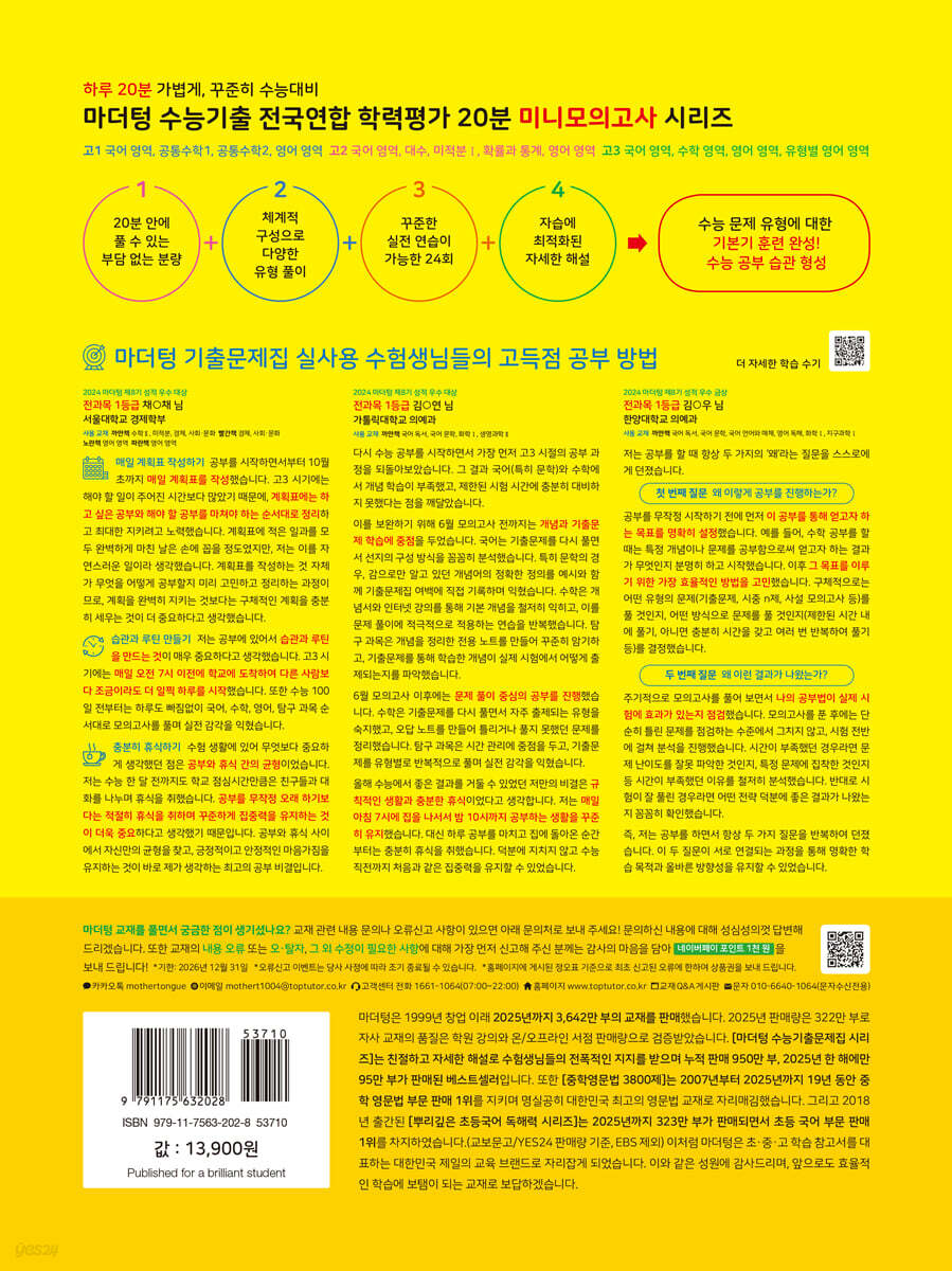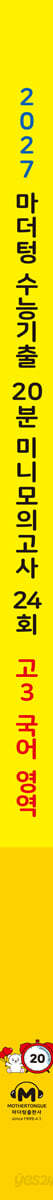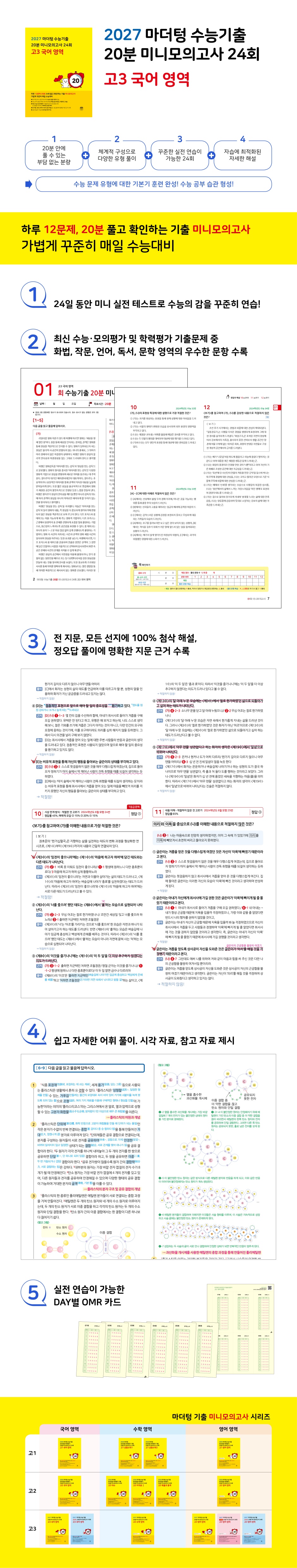 - 하루 20분(해설까지 40분) 투자로 부담 없이 매일 꾸준한 학습 가능 * 해설에 지문과 문제가 그대로 나오는 첨삭 해설 방식 - 해설편에 지문과 문제, 선지를 그대로 제시하고 해설이 필요한 부분에 직접 첨삭하여 편리한 학습 가능 * 문제 유형, 원문항 번호, 정답률 명시 - 문항 유형을 분류, 명시하여 각 유형별 출제 방식과 문항 풀이 방법을 익힐 수 있도록 구성 - 정답률로 문항 난이도 확인 가능, 응답률 10% 이상의 매력적 오답 표기 * 쉽고 자세한 어휘 풀이 - 지문에 등장하는 어려운 어휘나 구절을 쉽게 풀이하여 제시 * 완전한 학습을 위한 다양한 Tip - 지문을 보충 설명하는 참고 자료, 심화 자료, 시각 자료 제시 - 각 선지 내용에 대한 구체적인 예시, 상호 텍스트 제시 * 평가원 이의 신청 답변 수록 - 문항 및 정답 이의 신청에 대한 답변 내용을 해당 문항 해설 아래에 제시하여 평가원의 출제 의도를 파악할 수 있도록 구성 * 실전 연습을 위한 회차별 OMR 카드 제공 |