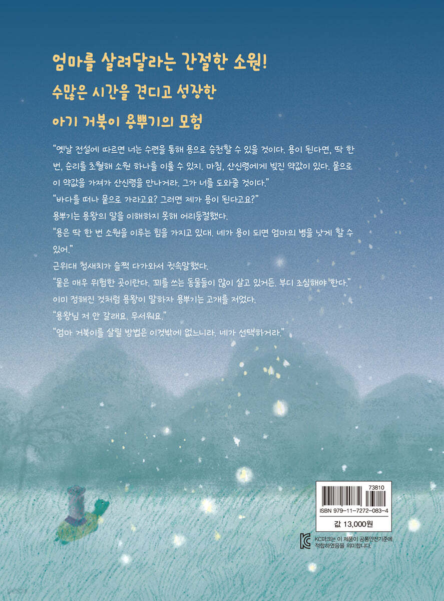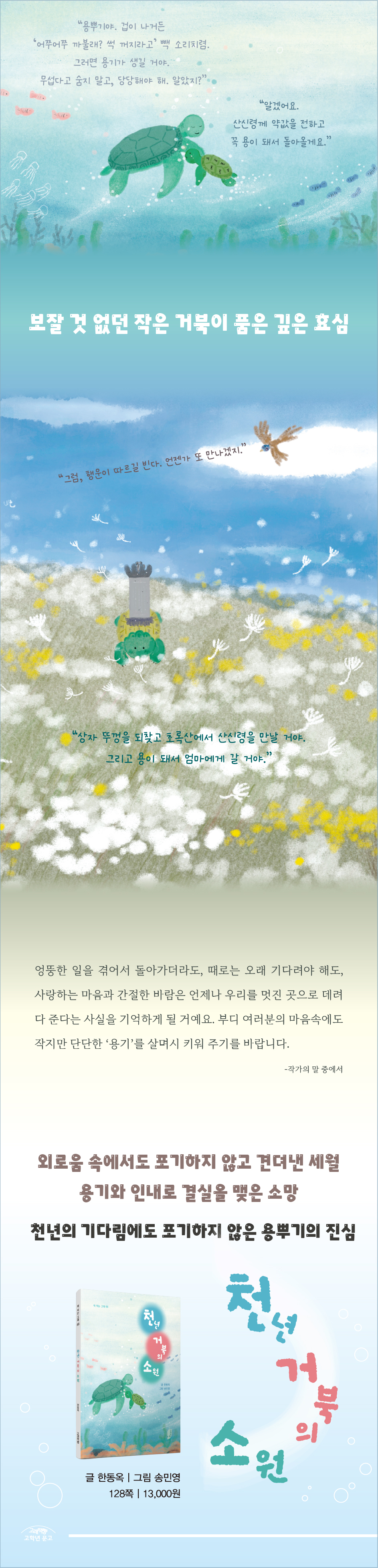 작품은 원주 법천사지의 거북이 받침돌에 얽힌 이야기가 바탕입니다. 그 이야기에 맘껏 상상력을 펼쳐 아이들이 좋아하는 판타지 형식으로 풀어냈습니다. 그러면서도 이야기 가운데 역사의 장면을 녹여내고, 오늘날 퇴색하는 기다림과 그리움, 소망이라는 가치를 아이들 눈높이로 전합니다. 세상은 갈수록 빨라지고 우리는 그 속도에 발맞추며 살아가느라 소중한 것들을 잊곤 합니다. 속도 경쟁에서 기다림이나 그리움, 소망은 남에게 뒤처지는 불필요한 일입니다. 보편적 효와 가족의 사랑도 속도 앞에서는 힘을 잃고 맙니다. 용뿍이는 천 년의 인내를 선택합니다. 그 긴 시간의 기다림은 바로 엄마에 대한 간절한 그리움과 소망입니다. 그 힘으로 용뿌기는 천 년의 세월을 이기고 마침내 용으로 승천합니다. 용뿌기의 승천에 아이들 모두 사랑과 그리움의 날개가 돋아납니다. |