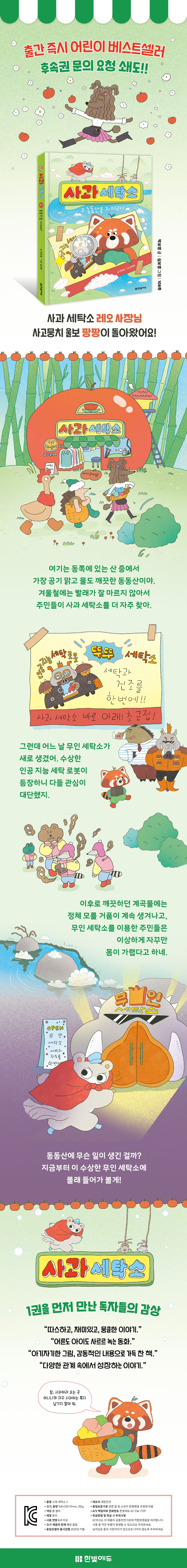 수상한 무인 세탁소의 등장마을을 덜컹덜컹 뒤흔드는 세탁 로봇동동산 대나무 숲 한가운데에는 새빨간 사과 모양의 세탁소가 있어요. 이곳 사과 세탁소의 직원인 팡팡이 사장인 레오에게 말도 하지 않고 마을 곳곳에 엉뚱한 전단지를 뿌린 탓에 고민이 있다거나 사과하고 싶다는 사연을 적은 쪽지가 종종 오곤 하지요. 그러던 어느 날, 무인 세탁소가 새로 생기면서 레오의 한숨이 깊어졌어요. 투파 소장의 먼 친척인 뚜뚜가 동동산 계곡 아래에 무인 세탁소를 열고 세탁과 건조가 한 번에 되는 인공 지능 세탁 로봇을 들이면서, 사과 세탁소를 찾던 단골손님들의 발걸음이 무인 세탁소를 향하게 된 거예요. 그러던 중 레오는 무인 세탁소에서 나온 수상한 거품이 계곡물에 흘러들고 있다는 사실을 알게 돼요. 설상가상으로 주민들은 가려움증을 호소하기 시작하고, 로봇을 이용한 세탁물에는 불쾌한 냄새가 남는 등 여러 피해가 겹치면서 마을이 뒤숭숭해집니다.힘을 합해 하나가 된 주민들작은 손과 마음을 모아 지켜 내는 마을마을 주민들은 무인 세탁소의 문제점을 파악하기 주민 회의를 열어요. 바둑이 미용실의 코코 원장, 소소 분식의 소소, 베베로 건축 사무소를 운영하는 베베로까지 빠짐없이 모이지요. 그러나 투파 소장은 이를 무책임하게 회피해요. 레오는 주민의 안전은 뒷전이고 동동산 개발 프로젝트에만 혈안이 되어 있는 투파의 태도에 문제를 제기하고, 무인 세탁소를 조사하기로 결심합니다. 주민들은 각기 다른 사정에 처해 있지만 동동산에 생긴 문제를 가만히 지켜보지 않아요. 함께 모여 머리를 맞대고 마을을 지키기 위해 발 벗고 나서는 어떤 선택을 하지요. 동동산의 깨끗한 자연은 있는 그대로 물려줘야 하는 소중한 삶의 터전이고, 관리소장은 책임감을 갖고 주민을 대표해야 하는 중요한 자리이기 때문이에요.“넌 사과 세탁소의 하나뿐인 직원이잖아.”마음을 사르르 녹이는 뭉클한 진심무리를 떠나 홀로서기를 결심한 레오였지만, 갑자기 늘어난 군식구가 곁에 있는 게 점점 당연해지면서 자꾸만 마음이 쓰이기 시작해요. 팡팡은 그런 레오의 속내도 모른 채 실수투성이인 자신의 모습을 지우고 어떻게든 제 몫을 해내는 모습을 보여 주고 싶어 해요. 해마다 돌아오는 동동산 ‘최고의 직원’을 뽑는 자리에 도전하기 위해 애를 써 가며 인정받고 싶어 하지요. 이로 인해 레오와 오해가 깊어지는 바람에 눈물 콧물을 쏙 빼게 되지만요. 팡팡의 마음을 알아주고자 먼저 다가가기를 택한 레오는, 진심을 가득 담은 사과를 건네며 팡팡이 가장 기다려 왔던 말을 꺼내요. 서툴더라도 서로에게 한 걸음씩 다가가는 두 주인공을 보면 관계 속에서 성장하는 방법을 알게 될 거예요. 다시 찾아올 봄을 기다리는 주인공들처럼 마음에 피어날 단단한 씨앗을 심어 보세요.
