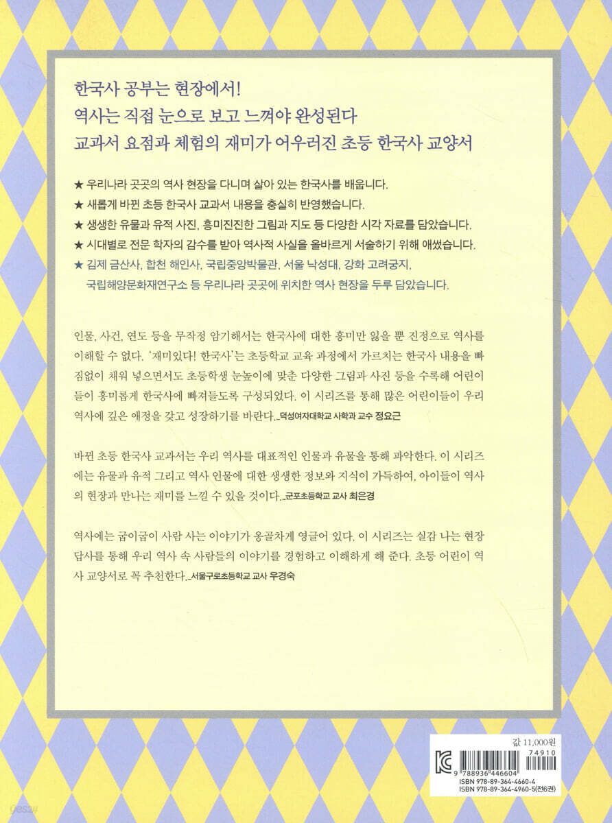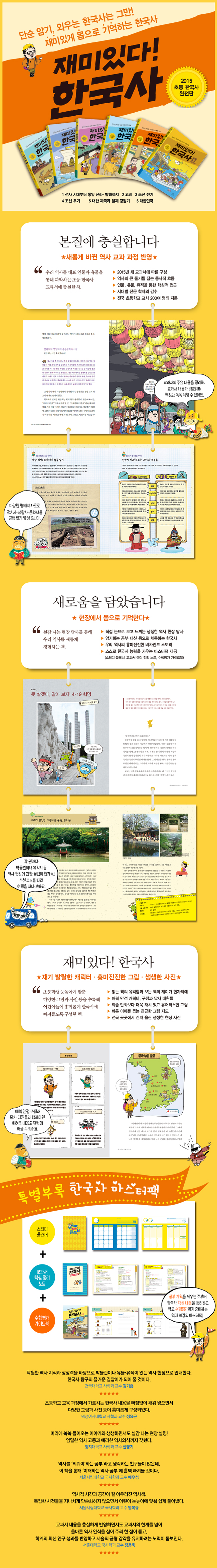 역사 현장을 찾아다니며 배우는 새로운 한국사 역사는 오늘을 있게 한 의미 있는 일들이 쌓여 이루어진 것으로, 역사를 배운다는 것은 과거의 흔적을 좇아 이를 확인하고 이해하는 과정이라 할 것입니다. 그런데 우리의 역사 교육은 많은 내용의 역사적 지식과 정보를 전달하는 데 급급해 아이들이 한국사를 ‘나의 역사’ ‘우리의 역사’로 체감하고 받아들이도록 하는 데는 미흡했습니다. 백 번 듣는 것보다 한 번 보는 것이 낫다는 말이 있습니다. 몸으로 직접 부딪쳐 익히는 것보다 더한 자극과 효과는 없다는 말일 것입니다. 『재미있다! 한국사』는 박물관, 유적지 등 우리나라 곳곳에 위치한 역사 현장을 찾아다니며 우리 역사를 좀 더 생생하고 직접적으로 이해하도록 도와주는 역사책입니다. 새롭게 바뀐 초등 사회과 교육 과정(역사 영역)은 “선사 시대에서 오늘날 대한민국까지의 역사와 문화 및 생활상의 변화를 대표적인 인물과 유물을 통해 파악”하는 것을 주요 목표로 삼고 있습니다. 『재미있다! 한국사』는 암기하는 한국사가 아닌 한국사의 통사적 흐름 속에서 체험으로 기억하는 한국사를 지향합니다. 초등학교 아이들에게 연도나 사건, 어려운 역사 용어와 개념들은 역사를 이해하는 과정에서 부딪히는 커다란 장벽입니다. 그것에 앞서 눈에 보이는 유물이나 유적 등을 통해 역사 인물을 만나고 역사적 사건들을 유추하고 상상하게 한다면 우리 역사의 전체 흐름을 이해하는 데 큰 도움을 얻을 것입니다. 『재미있다! 한국사』는 각 권별로 내용과 관련한 박물관이나 유적지를 선정, 각 시대별ㆍ주제별로 역사 현장을 찾아가 한국사 현장 수업을 진행합니다. 그야말로 먼 시대라 실감하기에는 더더욱 어려운 구석기 시대와 신석기 시대(1권)는 전곡선사박물관과 서울 암사동 유적에서 옛사람들이 남긴 흔적들을 보면서 역사적 상상력을 더합니다. 고려 시대 대몽 항쟁의 역사(2권)를 이야기할 때는 사건의 주 무대였던 강화 고려궁지로 가서 당시의 상황을 짐작해 볼 수 있습니다. 조선의 역사(3권)를 이야기할 때 경복궁은 빠질 수 없는 현장 수업 장소입니다. 이 밖에도 국립중앙박물관, 한성백제박물관, 경주 남산과 안압지, 합천 해인사, 서울 낙성대, 한산도, 남한산성 등 다양한 역사 현장은 아이들이 훨씬 더 생생하게 역사를 이해하고 경험하도록 돕는 훌륭한 매개가 되어 줄 것입니다. 아울러 답사 현장 자체에 대한 기본적인 정보도 놓치지 않았습니다. 별면으로 다룬 ‘역사 현장 답사’에서는 해당 장소에 대한 소개와 꼭 봐야 할 것, 추천 코스 등 답사 현장에 관한 정보를 꼼꼼히 실어 그 자체가 훌륭한 여행지 정보가 되도록 꾸몄습니다. 새롭게 바뀐 교육 과정에 맞춰 기본에 충실한 한국사 나무만 보지 말고 숲을 보라는 말이 있습니다. 한국사를 배우는 데 가장 중요한 것은 역사의 큰 줄기를 잡고 그 흐름을 이해하는 것입니다. 이것이 제대로 되어야 전체적인 맥락 가운데 개별 사건을 이해하며 역사 지식을 차곡차곡 쌓을 수 있습니다. 그런데 한국사는 무조건 암기해야 해결할 수 있다는 생각을 가진 어린이들이 적지 않습니다. 이것은 중학교, 고등학교에 가서도 이어져 결국 역사는 지루하고 어려운 암기 과목으로 전락해 버리기 일쑤입니다. 하지만 인물, 사건, 연도 등을 무작정 암기해서는 한국사에 대한 흥미만 잃을 뿐 진정으로 한국사를 이해할 수 없습니다. 새로운 교과 과정과 교과서 핵심 내용 반영 『재미있다! 한국사』는 새롭게 바뀐 초등학교 한국사 교과서 구성에 맞춰 아이들이 전체 흐름을 이해하는 데 중점을 두고 만들었습니다. 새 교과서의 구성에 따라 시대별로 분류해 ‘선사 시대부터 통일 신라ㆍ발해까지’ ‘고려’ ‘조선 전기’(이상 3월 출간) ‘조선 후기’ ‘대한 제국과 일제 강점기’ ‘대한민국’(이상 9월 출간 예정), 이렇게 전체 6권으로 구성하였으며, 각 권의 첫 번째 장(교시)은 「가볍게 떼자, 한국사 첫걸음」(1권), 「미리 보는 고려, 고려 사람들」(2권), 「한눈에 보는 조선, 조선 사람들」(3권)처럼 해당 시대를 전체적으로 개관해 한국사를 처음 접하는 아이들이 앞으로 배우게 될 시대에 관해 호기심을 갖고 조망해 보도록 했습니다. 또한 교과서의 주요 내용을 정리해 본문과 함께 실음으로써 교과서 내용과 비교하면서 읽고 이해하도록 꾸민 것은 이 시리즈만이 가지는 특장점입니다. 어려운 역사 용어와 어휘 자제 역사를 처음 배우는 아이들이 연도만큼 어려워하는 것이 바로 역사 용어와 개념 어휘입니다. ‘구석기’ ‘신석기’ ‘혁명’ ‘정변’ 등 역사를 이야기할 때 한자로 된 역사 용어와 추상적인 개념 들은 피할 수 없는 관문과도 같습니다. 그러나 역사책을 보면서도 뜻을 전혀 이해하지 못한 채 그야말로 글만 읽는 경우가 허다합니다. 『재미있다! 한국사』는 술술 읽히는 글이 장점입니다. 그렇다고 아이들이 반드시 알아야 할 부분까지 생략하는 것은 결코 아닙니다. 낯선 역사 용어와 어휘 들을 최대한 자제하면서 꼭 필요한 경우에는 본문에서 자세히 풀어 설명합니다. 따라서 아이들은 책을 읽는 과정에서 자연스럽게 개