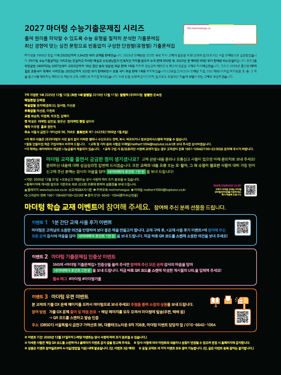 [기출 자료 분석] 마더텅 [기출 자료 분석 모음]으로 공부하고 수능 1등급으로 도약하기! 문제를 풀기 전 꼭 정리해야 할 자료 모음 수능, 모의평가, 학력평가 문항 중 자주 나오는 자료를 선별! 기존 마더텅 개념+[기출 자료 분석]까지 추가 제공! [문제편]에는 역대 수능, 모의평가, 학력평가에 출제된 문항 중에서 문제풀이의 초석이 될 기출 자료 분석 모음이 수록되어 있습니다. 수능 고득점을 위해 꼭 정리해야 하는 자료를 모아 구성하였습니다. [기출 핵심 ○× 523제] 기출 복습을 위한 최고의 선택! 자주 출제되는 선지 ○×, 단답형 퀴즈 523 문항! 수능에 자주 나오는 보기 철저 분석! 수능 빈출 자료로 수능 완벽 대비! 짧은 시간에 수능에 필요한 핵심만 쏙쏙! |