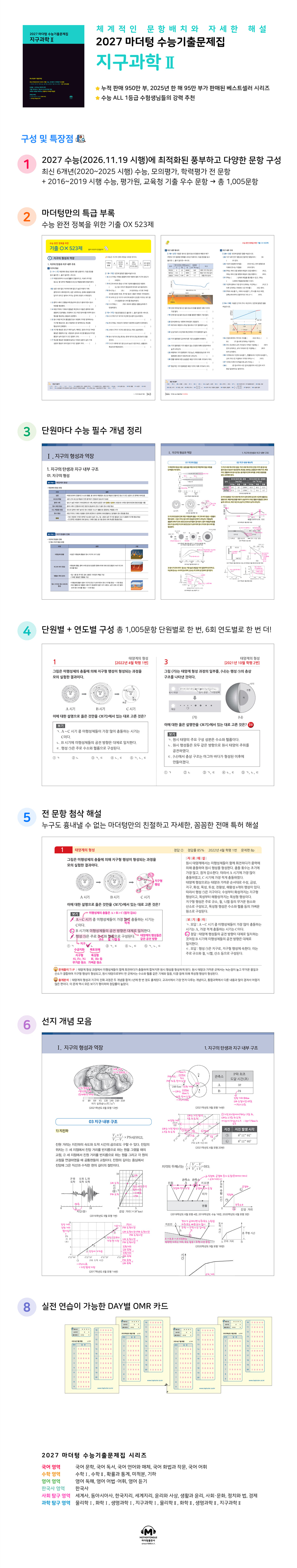 Ⅰ. 지구의 형성과 역장 1. 지구의 탄생과 지구 내부 구조 01. 지구의 형성 02. 지구 내부 에너지 03. 지구 내부 구조 2. 지구의 역장 01. 지구의 중력 02. 지구 자기장 Ⅱ. 지구 구성 물질과 자원 1. 광물 01. 규산염 광물 02. 편광 현미경과 암석 조직 2. 지구의 자원 01. 광상 02. 우리 생활에 이용되는 광물과 암석 03. 해양 자원 Ⅲ. 한반도의 지질 1. 한반도 형성 과정과 판 구조 환경 01. 지질도 작성과 해석 02. 한반도의 지사 03. 한반도 주변의 판 구조 환경 04. 변성 작용과 한반도의 변성암 Ⅳ. 해수의 운동과 순환 1. 해류 01. 해수를 움직이는 힘 02. 에크만 수송과 지형류 2. 해파와 조석 01. 해파 02. 해일 03. 조석 Ⅴ. 대기의 운동과 순환 1. 단열 변화와 대기를 움직이는 힘 01. 단열 변화 02. 대기 안정도와 구름 발생 03. 대기를 움직이는 힘 2. 대기 대순환 01. 지상과 상층의 바람 02. 편서풍 파동과 저기압 발달 03. 대기 대순환 Ⅵ. 행성의 운동 1. 좌표계와 태양계 모형 01. 천체의 위치와 좌표계 02. 행성의 겉보기 운동 03. 지구 중심설과 태양 중심설 2. 행성의 궤도 운동 01. 행성의 공전 주기와 궤도 반지름 02. 케플러 법칙 Ⅶ. 우리은하와 우주의 구조 1. 성단의 거리와 나이 01. 천체의 거리 2. 은하와 우주의 구조 01. 성단과 은하 02. 성간 물질 03. 우리은하와 암흑물질 04. 우주 거대 구조 〈기출 자료 분석〉 Ⅰ. 지구의 형성과 역장 - 1. 지구의 탄생과 지구 내부 구조 Ⅰ. 지구의 형성과 역장 - 2. 지구의 역장 Ⅱ. 지구 구성 물질과 자원 - 1. 광물 Ⅱ. 지구 구성 물질과 자원 - 2. 지구의 자원 Ⅲ. 한반도의 지질 - 1. 한반도 형성 과정과 판 구조 환경 Ⅳ. 해수의 운동과 순환 - 1. 해류 Ⅳ. 해수의 운동과 순환 - 2. 해파와 조석 Ⅴ. 대기의 운동과 순환 - 1. 단열 변화와 대기를 움직이는 힘 Ⅴ. 대기의 운동과 순환 - 2. 대기 대순환 Ⅵ. 행성의 운동 - 1. 좌표계와 태양계 모형 Ⅵ. 행성의 운동-2. 행성의 궤도 운동 Ⅶ. 우리은하와 우주의 구조 - 1. 성단의 거리와 나이 Ⅶ. 우리은하와 우주의 구조 - 2. 은하와 우주의 구조 〈2024년 시행 학평·모평·수능〉 2024년 5월 학력평가 2025학년도 6월 모의평가 2024년 7월 학력평가 2025학년도 9월 모의평가 2024년 10월 학력평가 2025학년도 대학수학능력시험 〈2025년 시행 학평·모평·수능〉 2025년 5월 학력평가 2026학년도 6월 모의평가 2025년 7월 학력평가 2026학년도 9월 모의평가 2025년 10월 학력평가 2026학년도 대학수학능력시험 |