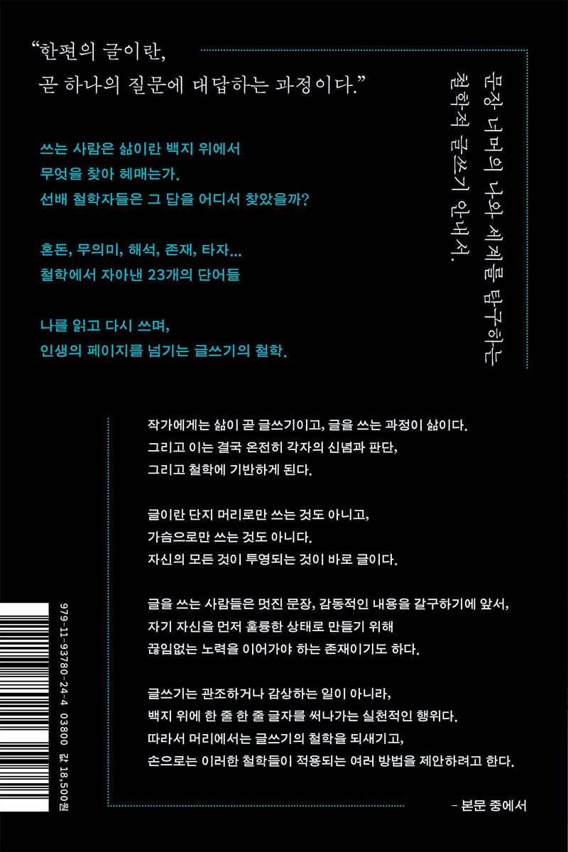 글쓰기는 관조하거나 감상하는 일이 아니라, 백지 위에 한 줄 한 줄 글자를 써나가는 실천적인 행위이기도 하다. 따라서 머리에서는 글쓰기의 철학을 되새기고, 손으로는 이러한 철학들이 적용되는 여러 방법을 제안하려고 한다.