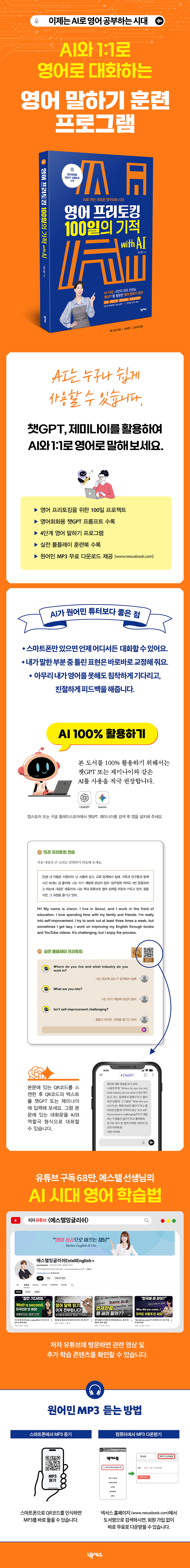 이 책은 자유로운 영어 말하기를 꿈꾸는 기초 영어 학습자들을 위한 책입니다. 그동안 영어 공부가 힘들었던 분들이라면 AI를 통해서 자유로운 영어 말하기를 시도해 보세요. 2. 영어회화용 챗GPT 프롬프트 수록 챗GPT 또는 제미나이와 같은 AI툴 사용에 익숙하지 않으신 분들을 위해서 챗GPT 프롬프트를 수록했습니다. 복사해서 입력만 하면 누구나 쉽게 AI와 영어로 실시간 대화를 할 수 있습니다. 3. 4단계 영어 말하기 프로그램 표현 학습 -〉 문장 구조 학습 -〉 혼자 말하기 -〉 실전 프리토킹으로 이어지는 4단계 학습 구조로 영어 초급자도 쉽게 말문을 틀 수 있습니다. 4. 원어민 MP3 수록 지문과 대화문의 원어민 음원을 제공합니다. 롤플레이 훈련이 가능한 롤플레이 음원을 추가로 제공하며, QR코드로 접속해서 편리하게 들을 수 있습니다. 5. 실전 롤플레이 훈련북 수록 실전 롤플레이 대화문 전문을 부록으로 수록하였습니다. 언제나 휴대하며 대화문을 복습할 수 있습니다. |