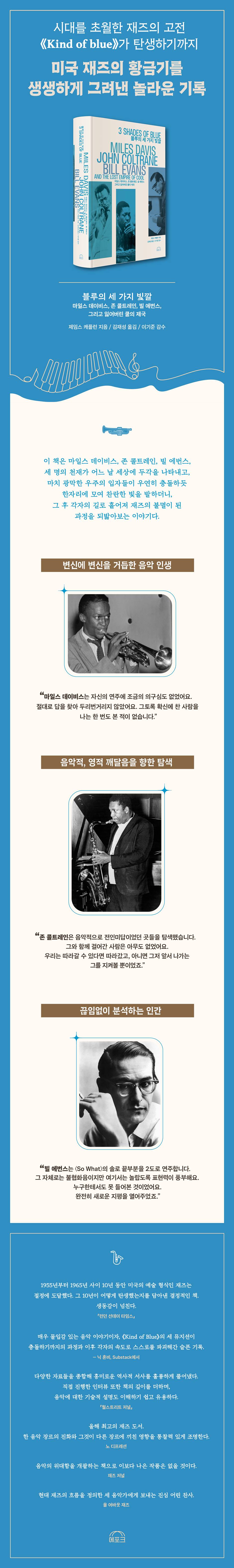 마일스 데이비스, 존 콜트레인, 빌 에번스: 같지만 다른 ‘블루’트럼펫 연주자 마일스 데이비스는 다른 흑인 재즈 뮤지션들과 달리 “유색인 귀족”이라 불린 부유한 집안에서 태어났다. 일찍부터 여러 선생으로부터 레슨을 받았고 (비록 중퇴했지만) 줄리아드 음악학교에 입학했다. 당시 최고 연주자로 손꼽히던 찰리 파커나 디지 길레스피와 비교하면 그는 속주(速奏)를 잘하지 못했다. 그러나 매력적인 외모와 스타일, 쿨한 태도, 대중적이면서도 수준 높은 그의 음악은 재즈 애호가들은 물론 일반 관객들의 마음까지 사로잡았다. 이는 밥 와인스톡(프레스티지), 알프레드 라이언(블루 노트) 같은 프로듀서들이 공히 인정한 바이며, 특히 컬럼비아 레코드의 조지 아바키언은 그가 대중적인 스타가 될 잠재력을 알아보았고 덕분에 마일스는 장르를 초월한 음악계의 전설이 되었다. 마일스 데이비스의 음악 인생은 변신의 연속이었다. 비밥에서 쿨 재즈로 이후에는 자신만의 독자적인 음악으로 발전해나갔다. 그는 모드와 리듬을 지속적으로 탐색하면서 끝없이 음들을 덜어내고 정형화된 코드 진행에 저항했다. 《Kind of Blue》 이후 1960년대에는 어쿠스틱 재즈를 버리고 재즈와 록의 융합으로 옮겨갔고 사람들은 이를 퓨전이라고 불렀다. 마일스는 개척자였다. 그와 밴드를 했던 뮤지션들은 밴드를 나온 후 퓨전, 화성, 리듬, 즉흥 연주, 인상주의 같은, 마일스가 최초로 제시한 개념들을 이어받았다. 그는 이미 다음 단계로 나아간 뒤였다.색소폰 연주자 존 콜트레인은 끝없이 연습에 매진했다. 듀크 엘링턴 밴드의 조니 호지스를 예술적 이상으로 삼았던 그는 정교하고 서정적이고 보드라운 음색으로 발라드를 정말 감미롭고 아름답게 연주했다. 지금도 많은 이들이 사랑하는 콜트레인의 모습이다. 한편 그는 테너 색소폰과 소프라노 색소폰으로 난해한 음악 영역을 누비는 두려움 없는 탐험가이기도 했다. 연주에 몰입해 그것을 철저히 탐구하고 끝까지 밀고 나가 ‘사운드 오브 시트’ ‘콜트레인 체인지’ 같은 이른바 콜트레인 스타일을 완성했다. 그는 그의 삶 전반을 지배하는 영적 깨달음을 향한 탐색을 음악에서도 똑같이 행했다. 내면에서 울리는 우주의 소리를 찾아 이를 음악으로 표현하고자 했으며, 그의 연주를 듣는 이들은 현실이 아닌 다른 세계에 있는 듯한 느낌을 받았다. 그는 말년에 프리 재즈로 넘어가 난해한 음악으로 대중들과 멀어졌지만 인간 콜트레인은 재즈사에서 하나의 신화이자 아이콘이 되었다.피아노 연주자 빌 에번스는 클래식 피아노로 시작했다가 재즈의 매력에 빠졌다. 모든 사람들이 그의 연주를 듣자마자 그가 대단한 뮤지션임을 알아보았다. 그의 독특한 연주 기법은 클래식 전통에 뿌리를 두고 있다. 그가 선보인 정교화된 보이싱 코드나 건반 터치, 음색, 페달링은 그 어떤 재즈 피아니스트와도 비슷하지 않았다. 그의 음악은 일생 동안 크게 달라지지 않았다. 끊임없이 분석하는 인간이었던 에번스는 자신의 연주라는 맥락에서, 그 하나의 개념 안에서 극한까지 성장하고 발전했다. 한편 그는 스스로가 재즈 뮤지션이 되기에는 외모도 태생도 한계가 있다고 느꼈다. 전형적인 미국인다운 잘생긴 외모에 교수 같은 진중한 인상을 지닌 뉴저지주 출신의 백인 피아노 연주자였기 때문이다. 재즈계에서 백인이기에 어쩔 수 없이 느껴야 했던 소외감을 극복하기 위해 그가 선택한 건 바로 마약이었다. 마일스 데이비스나 존 콜트레인 역시 마약에 빠졌고 마약 중독에서 벗어나기 위해 사투를 벌인 끝에 어느 정도 성공한 반면, 빌 에번스는 일생의 거의 대부분을 그 안에 머무르며 끝내 스스로를 파괴했다. 인물들이 살아 숨 쉬는 20세기 미국 재즈 여행이 책의 저자 제임스 캐플런은 여러 잡지에 한 인물을 깊이 있게 조명하는 특집 기사를 기고해온 작가다. 책의 말미에 실린 수많은 주와 참고문헌이 입증하듯, 그는 익히 알려진 겉모습이나 화려한 이력이 아닌 세심한 관찰, 심층 인터뷰, 철저한 조사를 통해 인물의 내면을 파고든다. 성격, 행동, 말투부터 가치관, 주변 사람들, 그가 살았던 시대의 역사적 문화적 맥락까지 아우르며 인물을 탐구하고, 이 모두를 종합해 문학적으로 풀어내는 그의 글쓰기 스타일은 많은 이들의 호평을 받았다. 그리고 이 책 『블루의 세 가지 빛깔』에서도 그는 이런 능력을 유감없이 선보인다. 마일스 데이비스, 존 콜트레인, 빌 에번스의 일생이 그들의 주변 인물, 수없이 많은 재즈 뮤지션들과 교차하며 20세기 미국 재즈 신의 한복판으로 우리를 이끈다. 음악적 영감을 얻는 순간, 초짜 뮤지션 시절의 엉성함, 재능과 가능성을 인정받았던 연주와 녹음들, 마약으로 인한 파멸과 추락, 마약을 끊기 위한 처절한 노력과 좌절, 성공을 위해 끊임없이 생각하고 행동해나가는 여정, 사랑의 기쁨, 배신의 상처, 그 시대의 분위기와 클럽 안 공기의 느낌까지, 저자는 큰 이야기와 작은 이야기를 능숙하게 섞어 매끄럽고 생동감 있게 전달한다. 특히 이 책의 백미라 할, 30번가 스튜디오에서 진행한 《Kind of Blue》 녹음 세션 장면은 눈에 보일 듯 생생한 묘사로 마치 