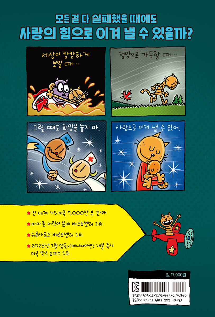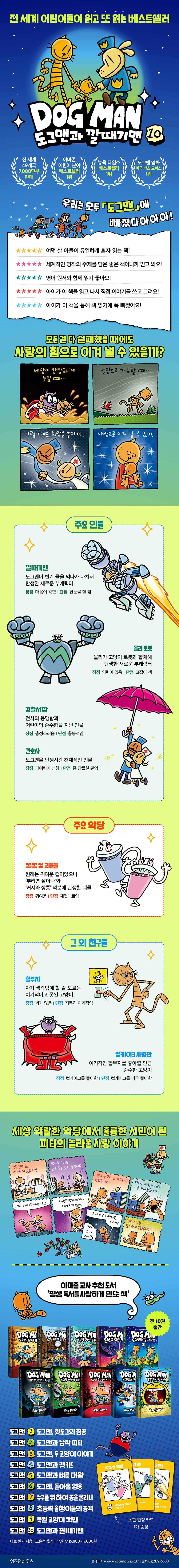 ★전 세계 49개국 7000만 부 판매 ★아마존 어린이 분야 베스트셀러 1위 ★ 아마존 교사 추천 도서 ‘평생 독서를 사랑하게 만드는 책’ ★뉴욕 타임스 베스트셀러 1위 ★전 10권 출간 전 세계 49개국에 7000만 부가 판매된 초대형 베스트셀러, 「도그맨」 시리즈 10권 『도그맨과 깔때기맨』이 출간되었습니다. 이번 권에서는 도그맨이 리를 피티가 만든 깔때기를 얻으면서 깔때기맨으로 변신해 더욱 엉뚱하고 거대해진 사건을 해결합니다. 웃음과 감동 가득한 이야기 속에서 변치 않는 사랑의 힘을 전하는 「도그맨」 의 열 번째 모험을 만나 보세요. 사랑은 변하지 않으며, 결국 모든 것을 이긴다! 피티는 어린 시절 가난과 외로움 속에서 살아남기 위해 악당이 되는 길을 선택합니다. 세상은 피티에게 친절하지 않았고, 한 번의 잘못된 선택은 또 다른 잘못을 부르며 악순환으로 이어집니다. 그러나 피티의 삶에는 분명한 전환점이 있었습니다. 힘겨운 순간에도 끝까지 피티를 포기하지 않았던 엄마의 사랑, 그리고 있는 그대로의 피티를 바라봐 주는 리를 피티의 존재가 그것입니다. 조건 없는 신뢰와 사랑은 피티가 변할 수 있는 힘이 되어 줍니다. 피티는 자신의 어두웠던 과거를 부정하지 않습니다. 대신, 왜 그런 선택을 할 수밖에 없었는지를 돌아보고 앞으로 어떤 고양이가 되고 싶은지를 스스로 선택합니다. 이 이야기는 우리는 누구나 잘못된 선택을 할 수 있지만, 그 선택에 머물러야 하는 존재가 아니라고 말합니다. 엄마에게서 받은 사랑과 리를 피티와의 관계 속에서 피티는 이전과는 전혀 다른 선택을 합니다. 이 책은 피티와 리를 피티를 통해 조건 없는 사랑이 한 존재를 어떻게 변화시키는지를 설득력 있게 보여 줍니다. 결국 모든 것을 이기는 것은 사랑임을 들려줍니다. “책 읽기 싫어하는 아이의 인생을 바꿔 준 책!” 어린이들에게 독서의 즐거움을 알려 주는 마력의 책! 이 책을 먼저 읽은 전 세계 독자들의 아마존 리뷰를 찾아보면 ‘아이들이 읽고 또 읽는 책’, ‘다음 권을 목 빠지게 기다리는 책’, ‘읽을 때마다 웃음 폭탄이 터지는 책’이라는 리뷰를 어렵지 않게 찾아볼 수 있습니다. 특히 어린 자녀가 있는 부모들의 리뷰가 많이 달려 있는데, ‘아이가 게임이나 컴퓨터가 아닌 책을 읽고 흥분하는 모습을 보고 감동했다’, ‘처음에는 너무 가볍다고 생각했는데 뒤로 가면 갈수록 보편적인 가치와 교훈을 담은 좋은 책이었다’, ‘아이가 책 읽기를 너무 싫어해 고민하고 있었는데, 학교 선생님이 「도그맨」을 권해 주었고 아이가 한 시간 넘게 독서를 할 만큼 놀랍게 변했다’ 등의 인상적인 리뷰를 찾아볼 수 있습니다. 또한 「도그맨」 시리즈는 어린이가 직접 쓰고 그린 만화라는 콘셉트를 그대로 살린 재미있는 편집에, 애니메이션의 원리를 적용한 ‘팔락팔락 애니메이션’, 책 속 캐릭터를 쉽게 그리는 법을 담은 ‘똥손도 쉬운 캐릭터 그리기’ 등 활동 페이지가 곳곳에 담겨 있어 아이들 누구나 쉽고 즐겁게 읽을 수 있습니다. 특히 그림책에서 읽기물로 넘어가는 아이들, 책 읽기를 너무너무 싫어하는 아이들이 독서의 즐거움을 알아가게 돕습니다. |