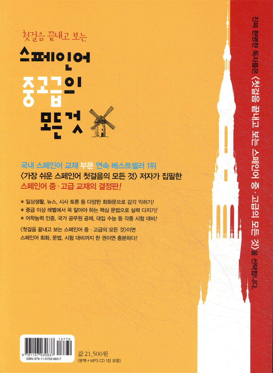 1과 La vida social 사교 사람들과 이야기 주고 받기 [청취] 환경 2과 Las telenovelas TV 드라마 사랑과 인생 이야기 [청취] 새 인생 시작과 목숨 걸기 3과 El mundo del espectculo 연예계 개그맨, 가수 그리고 배우들 [청취] 정보사회 4과 El mundo del trabajo 직업 세계 여러 직업인들과 함께 [청취] 기상 통보 5과 Las relaciones humanas 인간관계 사람과의 관계 논하기 [청취] 이야기는 행복한 결말을 맺는다 6과 El conflicto y el hbito 갈등과 버릇 오해와 비난을 이해로 풀기 [청취] 문화유산 7과 Corea y Amrica Latina 한국과 중남미 세계화 시대의 협력도모 [청취] 한국과 풍물들 8과 Buscar trabajo 구직 취업 준비하기 [청취] 무병장수 9과 La entrevista 면접 자신을 당당히 설명하기 [청취] 청정에너지 10과 Hacer viajes de negocios (1) 출장(1) 해외 나가기 [청취] 대통령 선거 11과 Hacer viajes de negocios (2) 출장(2) 현지 교통 및 이동 [청취] 물 부족 12과 El mercado y la comida 시장과 음식 구매활동 및 식사하기 [청취] 열려라 참깨! 13과 Las emergencias 응급상황 힘겨운 사건사고 이겨내기 [청취] 해양오염 14과 Las comunicaciones (1) 커뮤니케이션(1) 전화 통화하기 [청취] 세계인권선언 15과 Las comunicaciones (2) 커뮤니케이션(2) 이메일 보내기 [청취] 회사에 컴플레인하면서 16과 La reunin 회의 실무회의 참석하기 [청취] 한국경제 17과 La presentacin 프리젠테이션 마케팅이란 무엇인가 [청취] 숫자 18과 Las negociaciones 협상 정확한 의사 전달하기 [청취] 에볼라 바이러스 19과 La oficina사무실 상사맨들의 일과 [청취] 박물관 20과 La discusin y la charla 토론과 담소 가정문제와 시사주제 말하기 [청취] 인간 복제 21과 El ocio y la familia 여가와 가족 미운정 고운정 나누며 추억 만들기 [청취] 겨울왕국중에서 22과 Los locales del vecindario 동네 가게들 세탁소, 미용실, 카센터 및 헬스클럽 [청취] 간접흡연 23과 El nacimiento, la vejez, la enfermedad y la muerte 생로병사 삶과 죽음 함께 하기 [청취] 해일 24과 Los das festivos y las celebraciones 명절과 축하 행사 추석, 결혼, 망자의 날, 크리스마스 [청취] 산페르민 축제 청취연습 극지방해빙 회화편 해석 연습문제 정답 문법편 국적 관련 어휘 핵심문법노트 1 정관사 artculo definido 핵심문법노트 2 비교급 심화 comparativo 핵심문법노트 3 양보 문장 oracion concesiva 핵심문법노트 4 틀리기 쉬운 구문 9개 Las nueve oraciones que fcilmente confunden a los coreanos 핵심문법노트 5 강조 nfasis 핵심문법노트 6 스페인어 & 영어 castellano & ingls 핵심문법노트 7 불완료과거 & 부정과거 pretrito & imperfecto 핵심문법노트 8 직설법 & 접속법 indicativo & subjuntivo 핵심문법노트 9 부사 & 부사구 adverbio & frase adverbial 핵심문법노트 10 현재분사 & 과거분사 gerundio & participio pasado 핵심문법노트 11 재귀대명사 pronombre reflexivo 핵심문법노트 12 전치사 preposicin 핵심문법노트 13 숫자 los nmeros 핵심문법노트 14 직접 및 간접 목적어 complementos directo e indirecto 핵심문법노트 15 관계사 relativo 핵심문법노트 16 Ser & Estar 종합객관식 연습 250 정답 및 해설 |