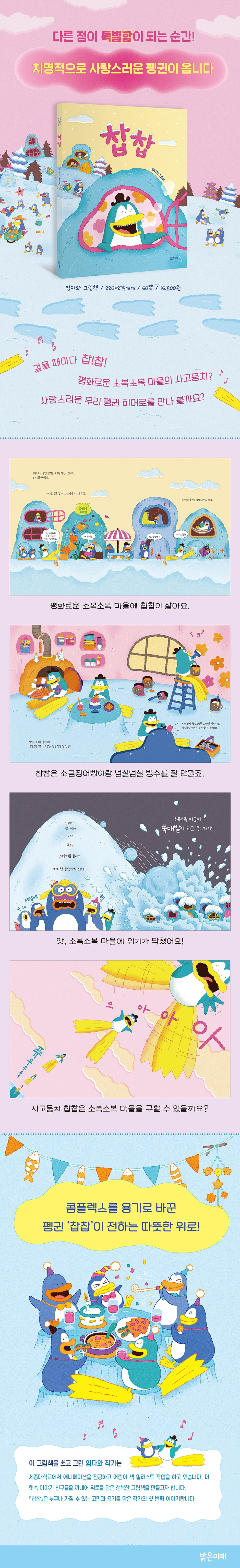 평화롭고 조용한 펭귄들이 사는 소복소복 마을에는 유쾌하고 상냥한 펭귄, ‘찹찹’이 살고 있어요. 하지만 찹찹은 사고뭉치랍니다. 왜냐면 발이 무지무지하게 커서, 길을 걷다가 화분을 걷어 차기도 하고, 가게 물건을 넘어뜨리기도 하거든요. 그리고 걸을 때마다 찹, 찹 하고 소리가 나서 이름도 ‘찹찹’이랍니다. 하지만 찹찹은 친구들 생일잔치에 놀러 갔다가 커다란 발 때문에 잘 어울리지 못하고, 함께 춤도 출 수 없었어요. 그래서 속상해진 찹찹은 힘 없이 마을을 걸어다녔지요. 그러던 어느 날, 소복소복 마을이 눈사태로 쑥대밭이 될 위험에 처했어요. 발이 커다란 찹찹이 이 위기를 어떻게 이겨 내게 될까요?