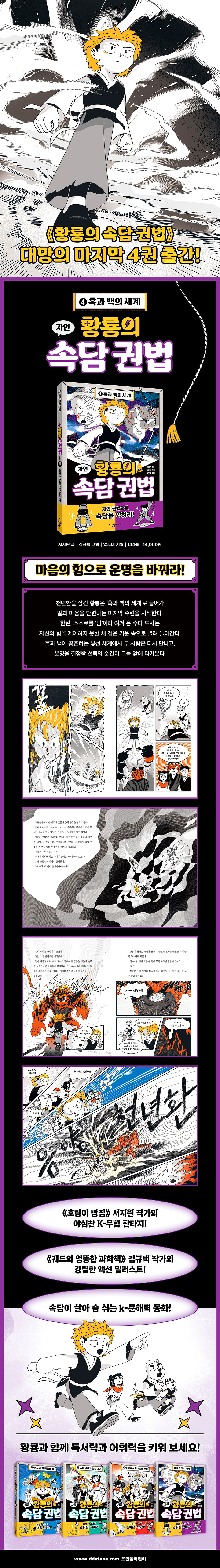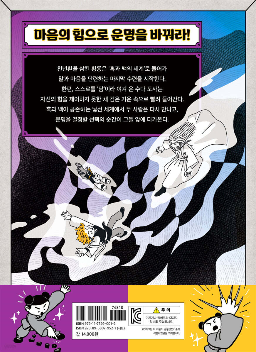 백두호랑 사범이 검은 깃발을 가리키며 소리쳤다. 식물의 줄기들이 덩굴처럼 뒤엉켜, 어디가 앞이고 어디가 뒤인지 알 수 없는 사이로 으스스한 소리가 새어 나왔다. 가까이 다가가자 탑을 감고 오르던 덩굴이 꿈틀거렸다. 마치 뱀이 허물을 벗듯 줄기가 갈라졌다가 다시 붙더니, 어느새 덩굴들이 서로 엉켜 뚜렷한 모양을 만들기 시작했다. --- p.18 황룡이 두 개의 천년환의 기운을 다시 모아 주변을 밝혔다. 저 멀리 광활한 바닥이 눈에 들어왔다. 그 바닥은 서서히 황룡 일행을 향해 다가오고 있었다. “도사님, 저게 뭐예요?” 꼬물원이 물었다. 일월 도사가 대답했다. “저것은 수련의 미로다.” --- p.31 카드를 바라보며 황룡은 친구를 사귀던 때를 떠올렸다. ‘무적의 삼총사랑 금방 친해질 줄 알았는데….’ 황룡은 그때 느꼈던 마음을 생각하며 조용히 답했다. “검은색입니다.” 그러자 나무가 서서히 검은빛으로 물들기 시작했다. 신기한 것은 황룡의 몸에도 검은 기운이 서서히 퍼져 나갔다는 것이다. --- p.37 투명한 바닥에 반사되어 두 그루의 나무처럼 보이는 신기한 공간. 눈앞에 은은한 빛을 내뿜는 나무 하나가 다시 나타났다. 동시에 수다와 황룡 사이의 거리가 성큼 줄어들었다. 수다 도사는 눈을 가늘게 뜨며 바닥을 뚫어지게 바라보았다. 그곳에는 황룡 일행이 서 있었다. “황룡? 크크, 이곳에서 널 다시 만나는구나.” --- p.67 “비 온 뒤에 땅이 굳어진다!” 초롬 공주는 숨을 고르고, 발뒤꿈치에 힘을 모았다. 땅 권법이 터져 나오자 앞에 펼쳐져 있던 계단이 흔들림을 멈추고 ‘탁, 탁’ 중심을 잡았다. 초롬 공주 뒤로는 출렁거리는 계단이, 나아가려는 앞길에는 땅처럼 단단하게 고정된 디딤돌 계단이 나뉘었다. --- p.81 “크아아악!” 진짜 ‘담’이 된 황룡을 보고, 수다 도사는 고통스러운 울부짖음을 터뜨렸다. 황룡은 두 발을 단단히 딛고 주먹을 끌어올렸다. 몸을 감싼 기운이 태극처럼 회전하며 주먹 끝으로 모였다. 균형의 기운이 세상에 퍼져 나가자, 수다 도사는 분노로 몸을 뒤틀었다. 황룡의 몸에서 흑과 백의 기운이 뒤섞이며 번쩍이는 빛을 터뜨렸다. 공기가 찢어지는 듯한 굉음과 함께, 새로운 싸움이 시작됐다. --- p.104 ‘돕는 마음?!’ 수다 도사는 무언 도사의 말을 떨쳐 내려 했지만, 기억의 조각들이 마치 폭풍처럼 밀려왔다. 어린 시절, 부모님과 함께 마을의 허물어진 담을 고쳐 세우던 일, 무언과 나란히 앉아 아이들에게 밥을 나누어 주던 저녁빛, 일월 도사가 따뜻한 손길로 제자들의 어깨를 다독이던 시간들…. 그 모든 장면이 뒤섞이며, 수다 도사의 머릿속에서 거대한 북소리가 울려 퍼졌다. 쿵?쿵?쿵?쿵?. 그 북소리는 곧 가슴속으로 내려와, 차마 억누를 수 없는 분노와 두려움, 그리고 오랫동안 눌러 왔던 열망을 한꺼번에 뒤흔들었다. 수다 도사는 이를 악물었다. --- p.113 |