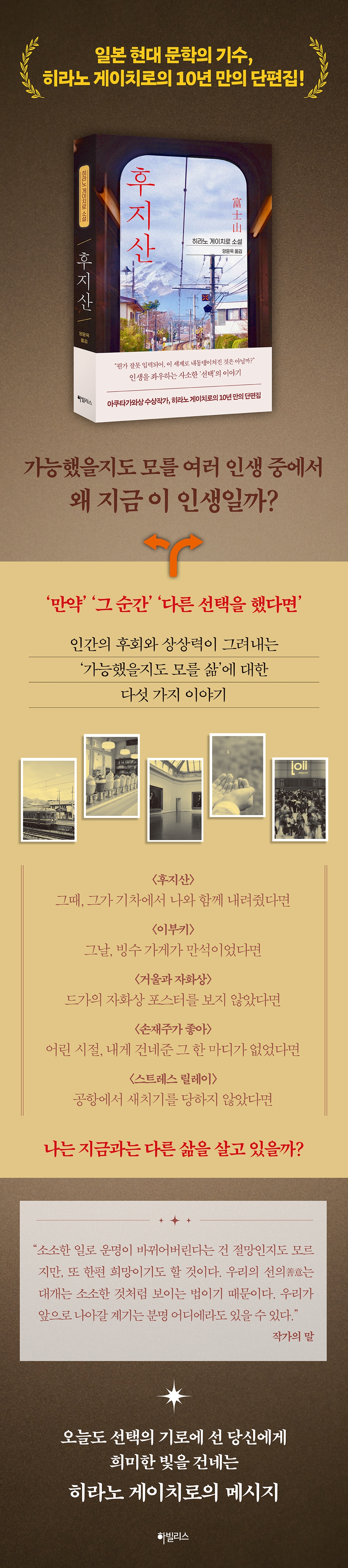 다섯 개의 이야기, 다섯 개의 ‘가능했을 삶’ 순간의 선택이 운명을 어떻게 바꿀지는 아무도 모른다. 그저 그 순간이 지난 후에야 '그때 ~했더라면'이라는 가정으로 지나간 선택에 대해 곱씹을 뿐이다. 삶 속의 예기치 않은 갈등과 상실의 의미를 탐색해온 히라노 게이치로가 이번 작품에서는 ‘순간의 선택’이라는 가장 일상적이면서도 결정적인 질문을 꺼내 들었다. 표제작 <후지산>의 주인공 가나는 만남 앱을 통해 만난 남자, 쓰야마와 함께 여행을 떠난다. 기차가 잠시 정차한 사이, 반대편 기차에서 도움을 요청하는 수신호를 보내는 아이를 본 가나는 즉시 뛰어내리지만, 쓰야마는 따라내리지 않는다. 그 행동에 실망한 가나는 그와의 관계를 끝내지만, 이후 접한 쓰야마의 소식에 그와 ‘함께할 수도 있었을’ 순간들에 대해 생각한다. 그 외에 만석인 빙수가게 대신 향한 맥도날드에서 ‘우연히’ 대장내시경에 대한 이야기를 듣고 암을 조기에 발견해 완치한 삶과 ‘운 좋게’ 자리가 생겨 빙수를 먹지만 검진 기회를 놓쳐 암으로 죽어가는 삶을 오가는 남자(<이부키>), ‘잘못 들어선 평행 세계’ 같은 현재의 삶에서 해방되고 싶었던 남자가 드가의 자화상 포스터를 보고 멈춘 ‘계획’(<거울과 자화상>), 어린 시절 들었던 ‘한 마디의 칭찬’이 바꾼 한 아이의 인생(<손재주가 좋아>), 사람에서 사람으로 전염되는 ‘스트레스’의 기원을 유쾌하게 펼쳐 보이며, 이 기묘한 전염병을 끝낸 한 인물을 그린다(<스트레스 릴레이>). 다섯 편의 주인공들이 맞닥뜨린 선택의 순간은 모두 다르지만, 그 선택이 만들어내는 인생의 굴곡은 놀라울 만큼 섬세하게 그려진다. 히라노 게이치로는 이야기마다 ‘인생은 우연의 누적일까, 또는 바꿀 수 없는 운명일까?’라는 질문을 조용히, 그러나 집요하게 던진다. “많은 책을 번역해왔지만, 우리 문학이 지향할 만한 점을 풍부하게 갖춘 일본작가 한 사람을 꼽으라면 망설임 없이 ‘히라노 게이치로’를 추천한다.”(양윤옥) |