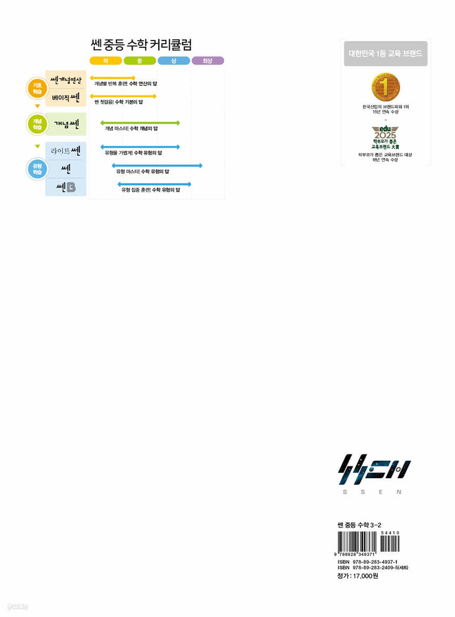 2. A, B, C 3단계 수준별 학습 체제로 학습 효과 극대화 3. 최신 학교 시험 기출 문제를 수록하여 빈출&신유형 대비 가능 4. 융합적 사고력 향상을 위한 창의 문제 수록 수학의 베스트셀러 "문제 기본서 쎈" 학교 시험에 나오는 모든 문제가 다 들어 있는 “문제 기본서 쎈” 쎈은 개념 학습 이후의 수학 학습 방법으로 유형별 문제 학습을 선도적으로 제안하며 등장하여 최고의 자리를 지키고 있는 수학 문제 기본서의 대표 주자입니다. 보유하고 있는 방대한 데이터베이스와 인프라를 바탕으로 한 쎈의 유형 분석과 문제해결 방법은 어떤 교재도 따라올 수 없는 특별함이 있습니다. 이것이 유사한 교재들 속에서도 쎈이 최고의 자리에 있는 이유입니다. 최적의 유형 학습을 통한 실제 문제해결 능력을 기르는 쎈, 수학의 답은 쎈입니다! |