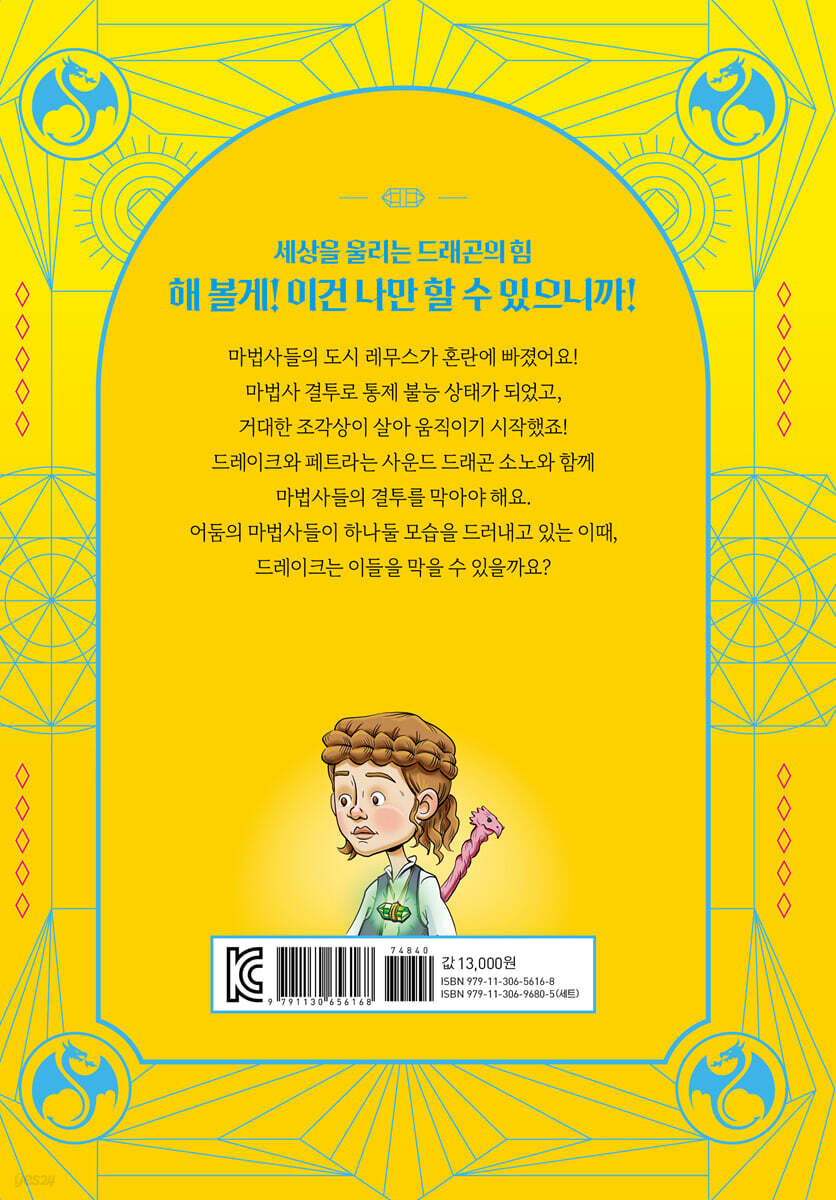 “이해하기 쉬운 어휘, 짧은 문장으로 이야기를 빠르게 진행시킨다. 스케치 형식의 그림은 이야기에 깊이를 더해 주며, 캐릭터의 감정을 풍부하게 느낄 수 있다. 챕터북을 막 읽기 시작한 아이들이 행복한 책 읽기를 할 수 있다.” _북리스트 “짧은 챕터, 다양한 사건, 드래곤 마스터의 세계가 한눈에 그려지는 일러스트 그리고 매력적인 주인공까지. 드래곤 마스터가 되고 싶지 않은 사람이 있을까? 이 모든 것이 결합하여 흥미로운 이야기가 탄생했다. 아직 많은 이야기가 남아 있기 때문에 다음 권이 기다려지는 시리즈다.” _커커스 한번 펼치면 멈출 수 없다! 몰입감 확실한 최고의 스토리 이미 알 사람은 다 아는 화제의 책 『드래곤 마스터』는 교육과 출판의 전통 강자인 ‘스콜라스틱’의 저학년 대표 챕터북(브랜치 시리즈)이다. 부담스럽지 않은 분량이어서 이제 막 긴 글을 읽기 시작하는 아이들에게 읽는 재미를 붙여 주기 좋다. 긴 시리즈임에도 후속권이 나올 때마다 아마존 베스트셀러에 오를 정도로 인기가 있어, 스토리의 재미는 이미 검증된 셈이다. 탄탄한 스토리에 캐릭터의 성격이 잘 드러나는 일러스트가 더해져 훨씬 더 풍부한 책 읽기를 경험할 수 있다. 이 책의 가장 큰 장점은 흡인력 있고, 무궁무진한 스토리 구성이다. ‘드레이크’와 드래곤 ‘웜’이 시리즈 전체를 이끌어가지만 각각의 에피소드는 매번 주요 인물과 드래곤이 바뀌며 궁금증을 일으킨다. 드래곤 마스터인 아이들은 성격과 생김새, 고향까지 모두 달라서 다양한 개성이 드러나는 캐릭터이며, 드래곤 마스터와 짝을 이루는 드래곤 또한 속성이나, 능력, 성격이 모두 달라서 자신과 맞는 드래곤을 찾는 재미도 느낄 수 있다. 이야기가 진행될수록 새로운 드래곤과 마스터의 등장으로, 예측 불가능한 전개가 이루어져 더욱 호기심을 자아낸다. * 해외 독자 후기 * -아들과 함께 이 시리즈를 읽는 것을 좋아한다. 아들이 다섯 살 때 시작한 이 책은 일곱 살이 되어도 여전히 즐기고 있다. -『해리포터』를 읽을 준비가 되지 않은 아이들에게 적합한 판타지 책이다. -판타지를 좋아하지만 긴 글을 읽기 어려워하는 아이에게 잘 맞는다. 도서관이나 교실, 가정에서 읽히는 걸 적극 권장한다. -일곱 살, 아홉 살인 내 아이들이 매일 밤 읽고 싶어서 견딜 수 없어 한다. 하지만 마흔 두 살인 나도 솔직히 너무 좋아한다. -우리 아들은 활동적이어서 독서를 싫어하는데, 이 책 한 권은 이틀 만에 다 읽고 다음 권을 읽고 싶어 한다. 아주 멋진 책이다. -훌륭하고 환상적이다. 별 8,000개를 주고 싶을 정도다. 드래곤에 관한 책이라는 것이 마음에 든다! 환상적인 서사의 세계관 속으로 판타지는 기본적으로 ‘세계관’을 다루는 장르다. 스토리에 드러나지 않더라도 치밀하게 잘 짜인 세계관 속에서 좋은 이야기가 탄생하게 되고, 이는 다시 독자들을 작품 속으로 끌어들이는 요소가 된다. 어린이 독자들에게 판타지가 필요한 이유는 재미있고 신기한 이야기를 읽으며 독서의 즐거움을 알게 되는 것도 있지만, 길고 방대한 서사를 입체적으로 이해하는 경험이 문해력을 기르는 데도 도움이 되기 때문이다. 책 읽기를 시작한 어린 독자들을 닿아 본 적 없는 미지의 세계로 초대한다. 정식 한국어판 『드래곤 마스터』도 세계관을 입혀 보다 멋진 모습으로 나왔다. 판타지 이미지를 담은 표지는 환상적인 세계로 쉽게 들어설 수 있게 도와주고, 본격적인 이야기가 흐르는 본문에는 포인트 컬러를 넣어 단조로운 흑백의 동화책이 좀 더 생생하게 살아나 읽는 재미를 한층 높였다. 한국어판이 더욱 특별한 이유는 『드래곤 마스터』의 드래곤과 드래곤 마스터들을 한눈에 볼 수 있는 ‘스페셜 에디션’ 『공식 가이드북』을 1권과 함께 선보이기 때문이다. 드래곤 마스터와의 성향과 각 드래곤의 속성 등을 담았으며, 스페셜 에디션인만큼 풀컬러의 다채로운 드래곤을 감상할 수 있다. 다음 이야기의 주인공을 미리 만나보거나 나와 성향이 맞는 드래곤을 찾아보는 재미도 있다. 하나 더, 본책에서는 ‘드래곤 카드’가 들어 있어 드래곤 컬렉션을 완성해 볼 수도 있다. 위험한 일이야. 하지만 이 방법밖에 없으니까! 말드레드가 만든 과거의 벽 속에 갇혀 있던 마법사들이 풀려났다. 하지만 이들 중에는 말드레드보다 더 사악한 어둠의 마법사도 있었는데, 마법에서 풀려난 동시에 뿔뿔이 흩어져 자취를 감추고 말았다. 한편, 마법사들의 도시인 레무스가 혼란에 빠지고 말았다. 금지된 마법사 결투가 벌어지는 중이기 때문이다. 하늘에는 마법의 소용돌이가 몰아치고, 잠들어 있던 거대한 석상은 살아 움직이기 시작한다. 이대로라면 레무스는 완전히 무너지고 말 것이다. 폭주하는 마법을 멈추려면 파워 크리스털이 필요하지만, 크리스털은 그 무엇으로도 부술 수 없는 바위 안에 들어 있다. 심지어 마법을 빼앗아 가서 마법사들은 크리스털을 만질 수도 없다. 이 위험천만한 도시에서 드레이크와 페트라, 마법사 그리피스는 새로운 드래곤 마스터 테사를 만난다. 앞을 보지 못하는 테사 곁에는, 사운드 드래곤 소노가 함께였다. 소노는 음파로 변해서 어디든 